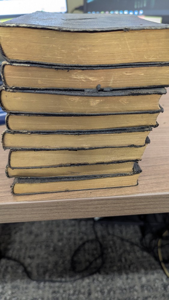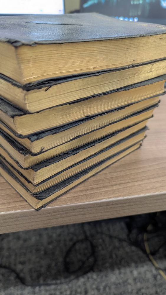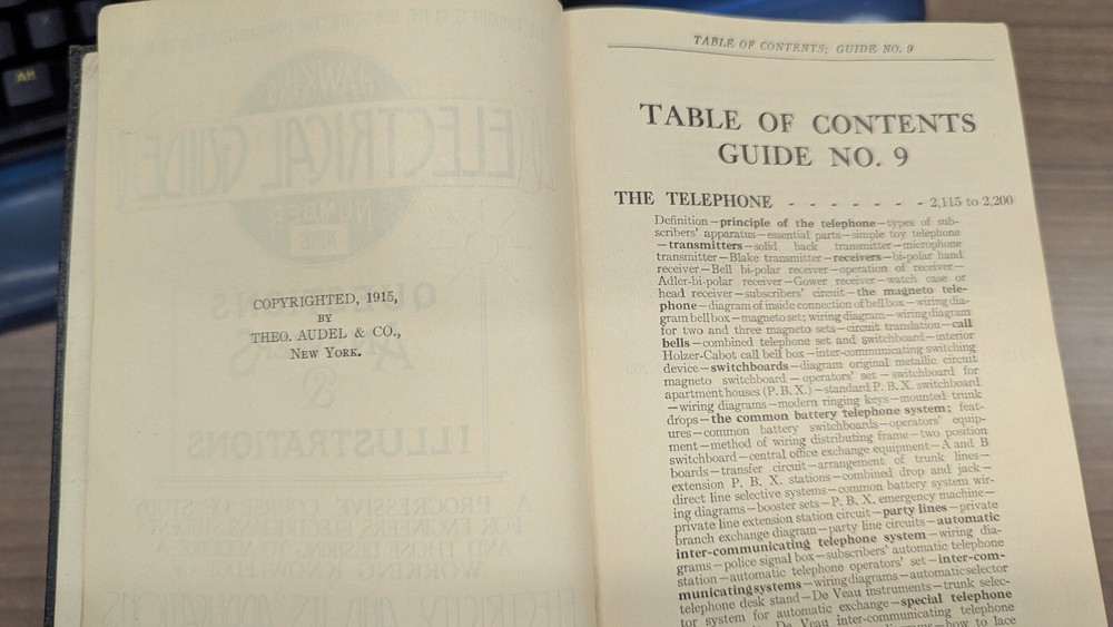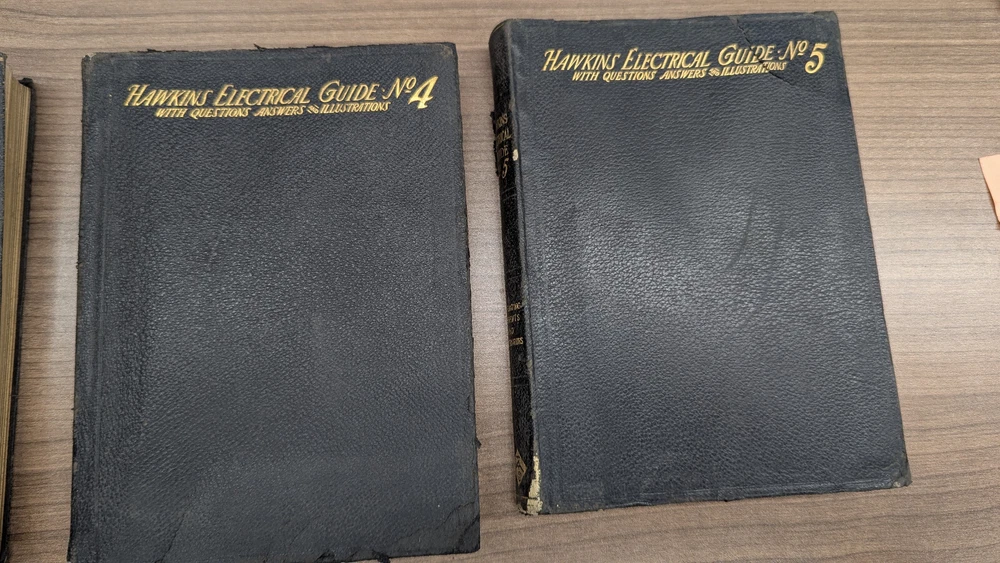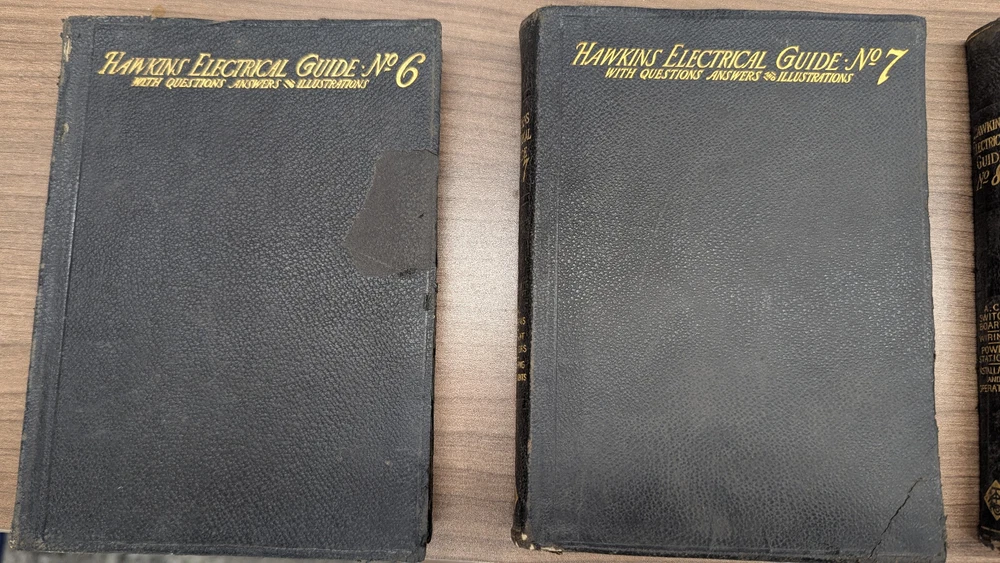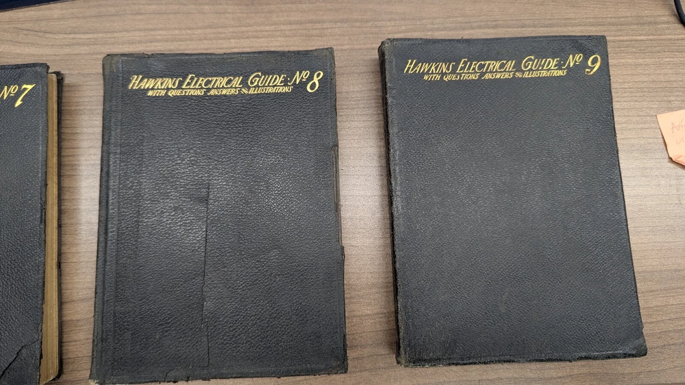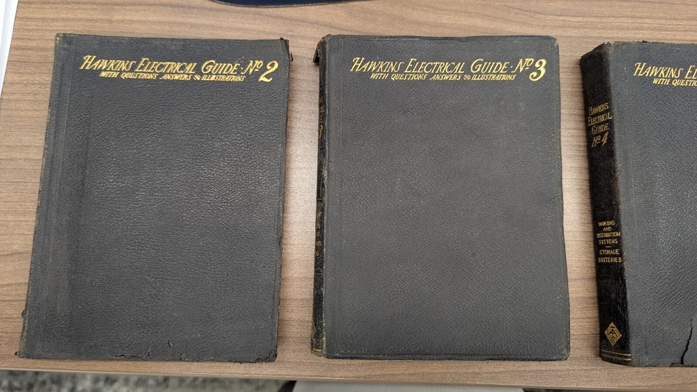 Hawkins Electrical Guides - First Edition (c) 1914-1915. Volumes 2 through 9. The books themselves are in great condition for their age. The bindings are tight in all but one (v.3) and even that one isn't bad - just slightly separating. The original leather covers, however, are somewhat pulling apart and degrading. The gold gilt edging still looks great on all the volumes. The set is being sold as-is. Comes from a smoke and pet-free home.