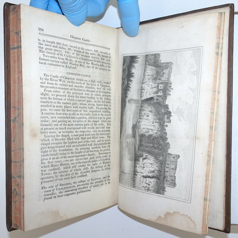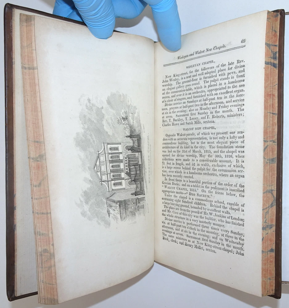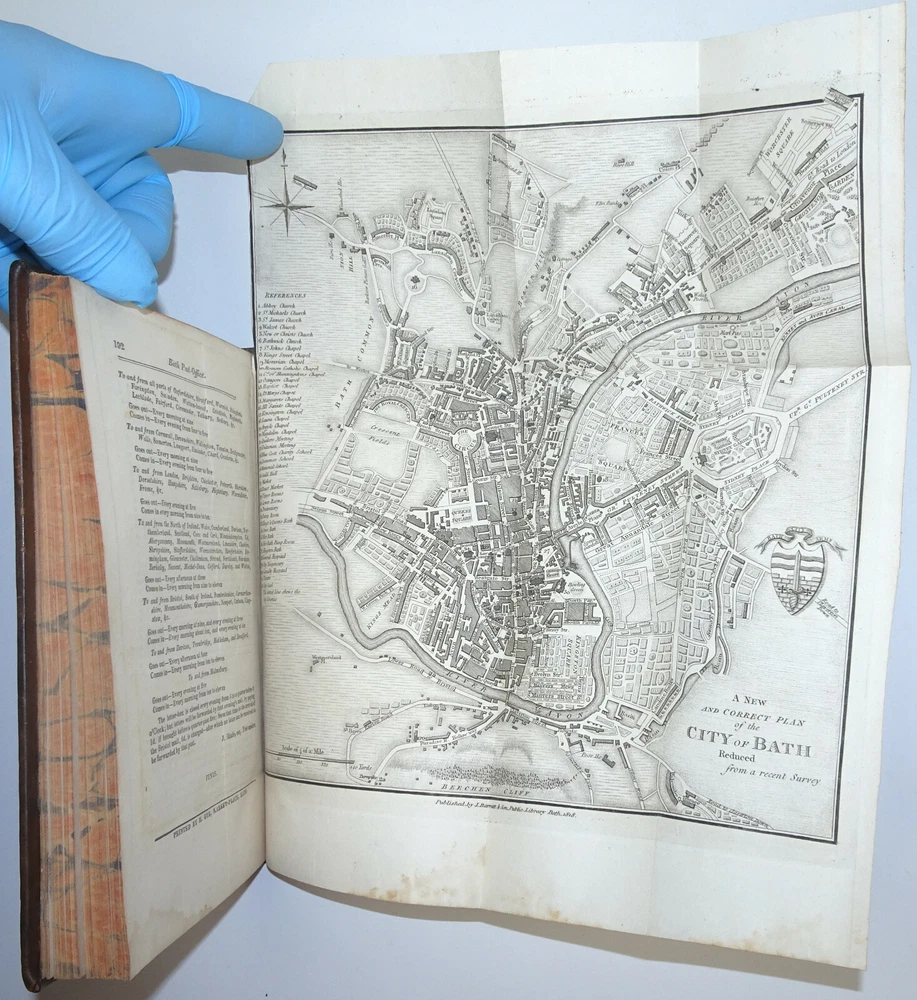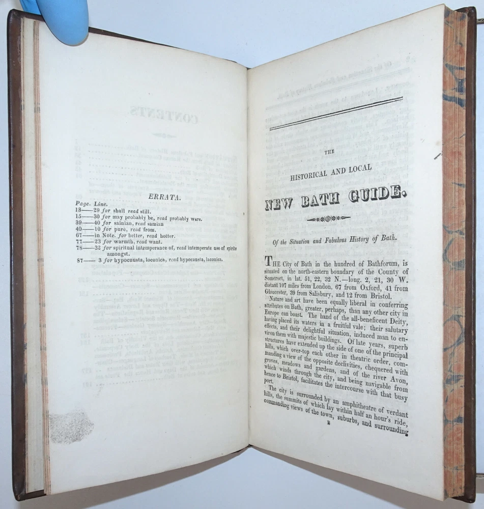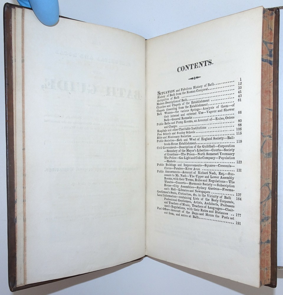 ITEM DESCRIPTION: Titles: The Historical and local new Bath guide, containing an accurate description of the public buildings, institutions, and amusements of the city; with observations on the medicinal virtues, and directions for the use of the hot waters; and other useful information. Embellished with eight original engravings, and a correct plan of the city. Date Published: Circa 1823. Place Published: Bath, England . Published by: J. Barratt and son . Size: Approx 7 3/4" x 5" x 3/4". CONDITION: Overall: Very good. Early, (probably original) full leather binding ! Pages: Very good with occasional mild soiling, minimal foxing, (please see pictures). Binding: Very good, still sound . Hinges: Neat repair to hinge leather at top of front hardcover. Both hinges sound and flexible . Hardcovers: Very good with moderate wear and soiling (please see pictures) . Spine: Very good with moderate wear and soiling , (please see pictures) .