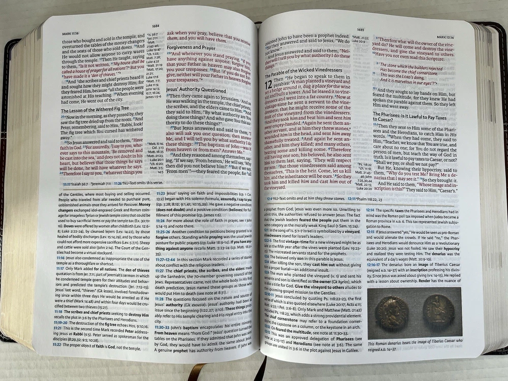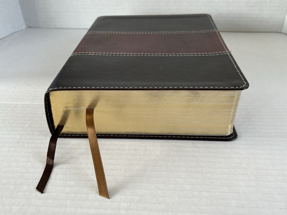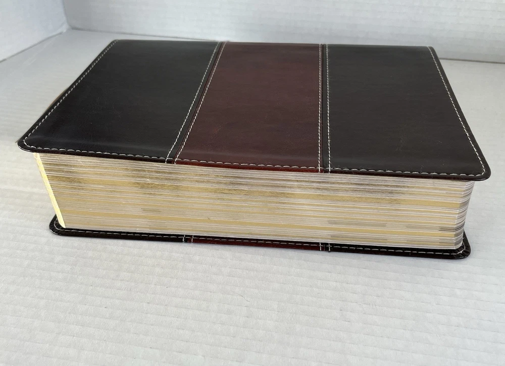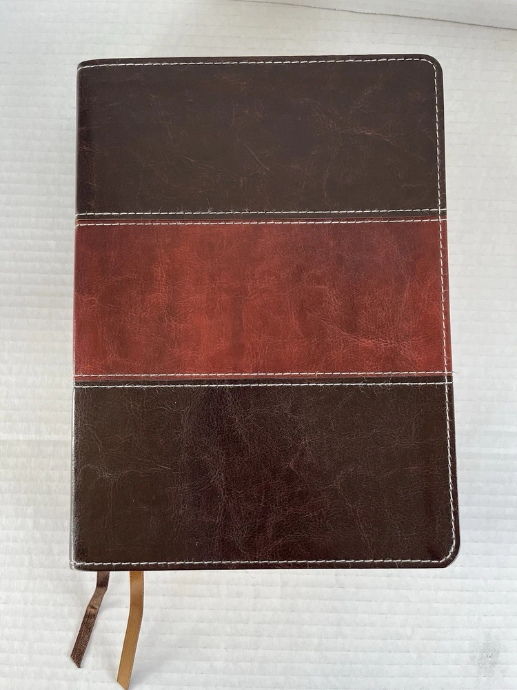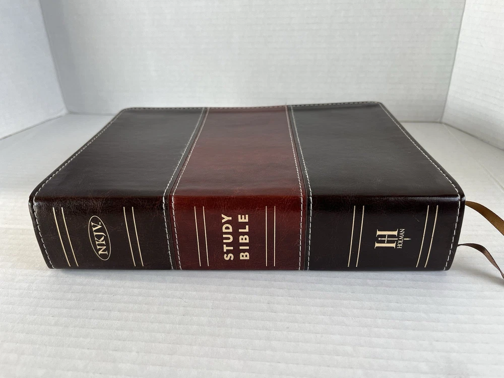 Holman Study Bible NKJV Edition Mahogany LeatherTouch Full Color. Great used condition has some writing on two pages (see photos for reference) other than that it is in like new condition.