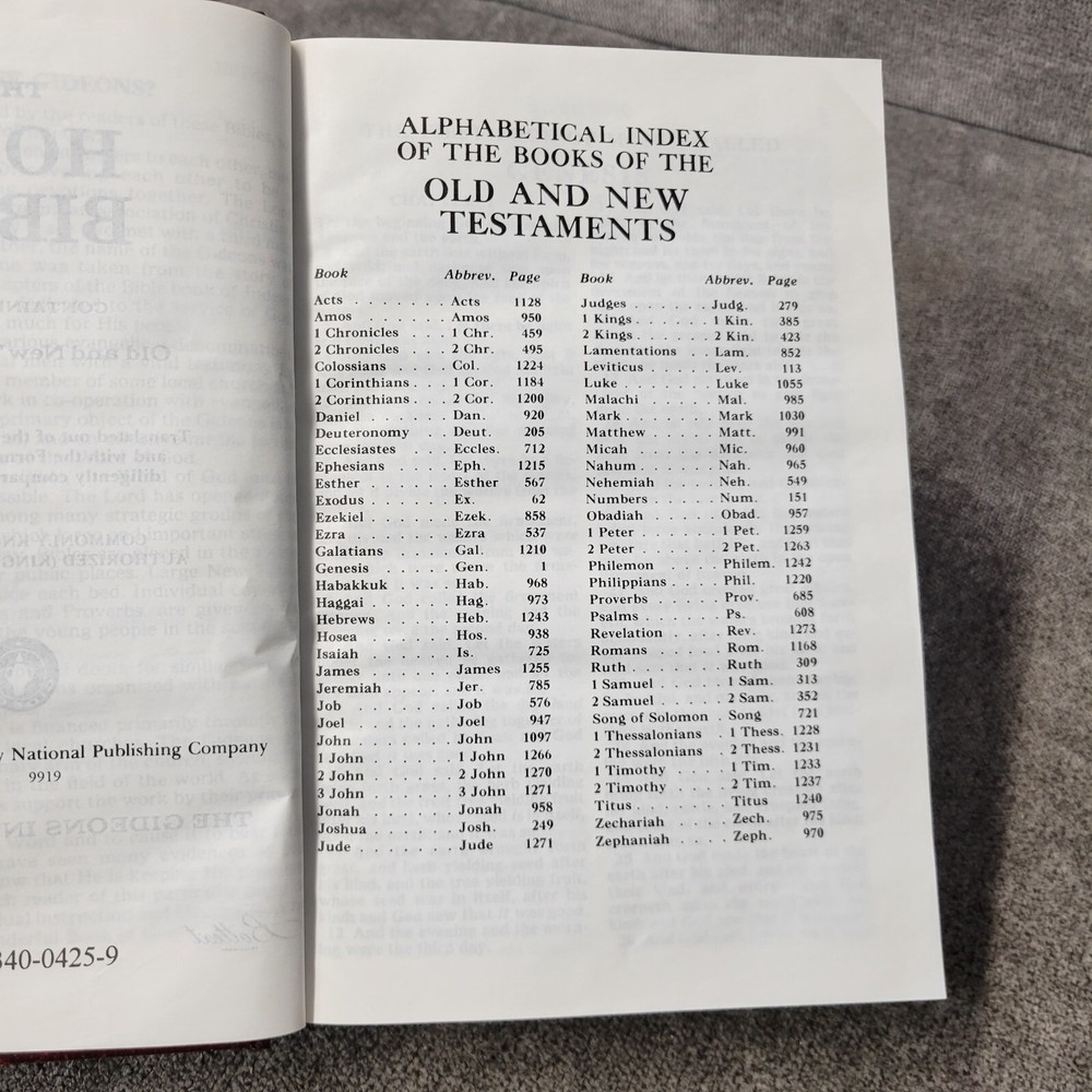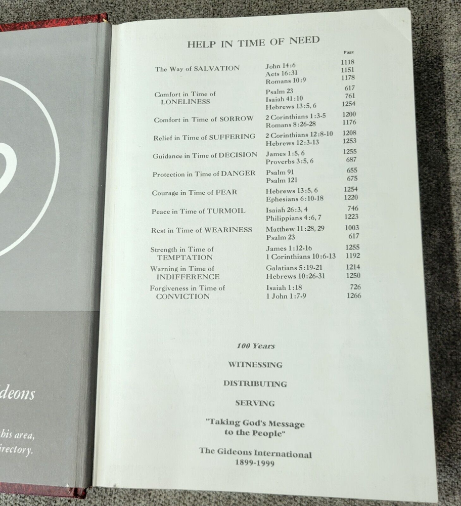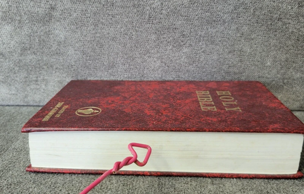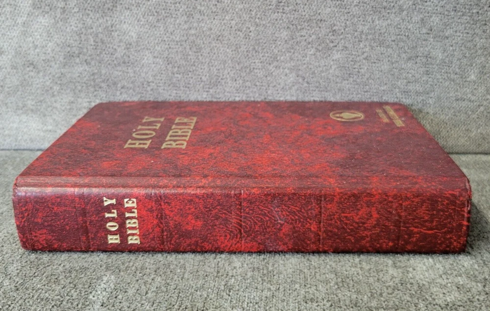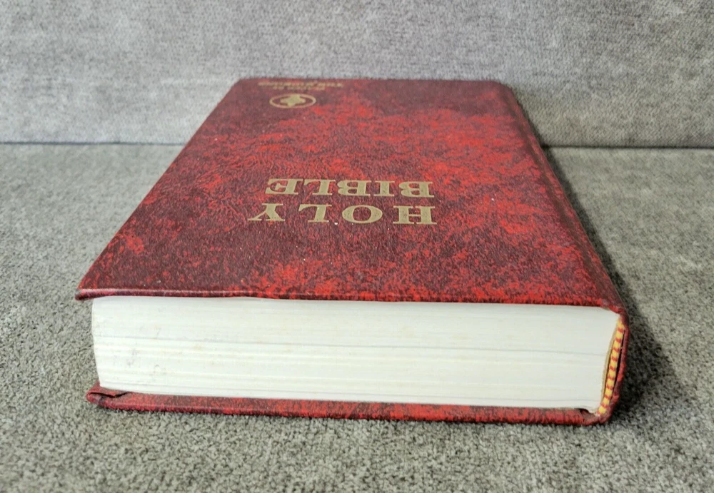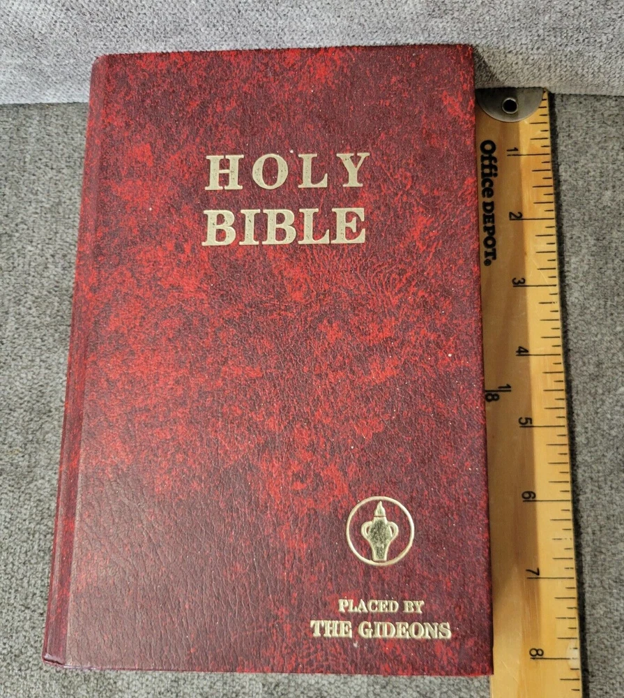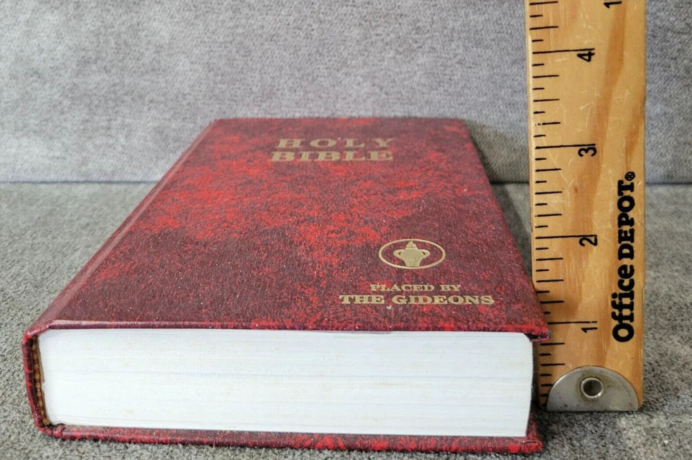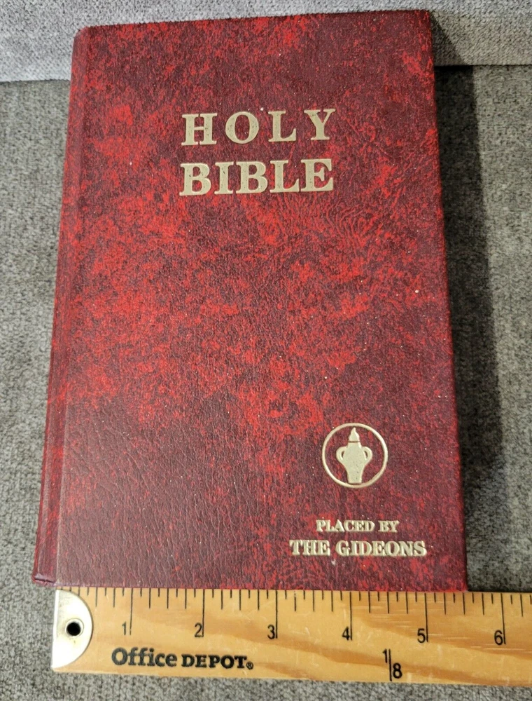 Up for sale is Holy Bible Book Place By Gideons Red Hardcover 1978 Measurements: Please check photos above for all measurement This book is pre-owned, cover has splats- one page has bend and small tear- view photos