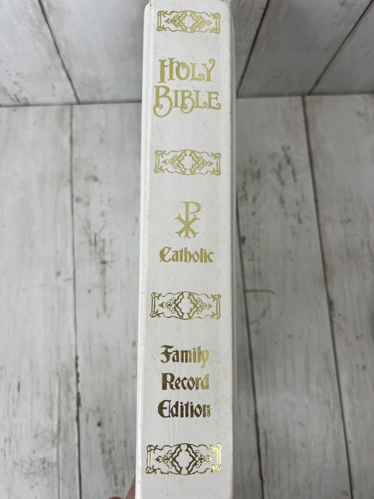 Holy Bible Catholic Family Record Edition Padded White Gold No Writing Imperfect Minor spots on page spine. No writing. Please see photos for measurements and condition....