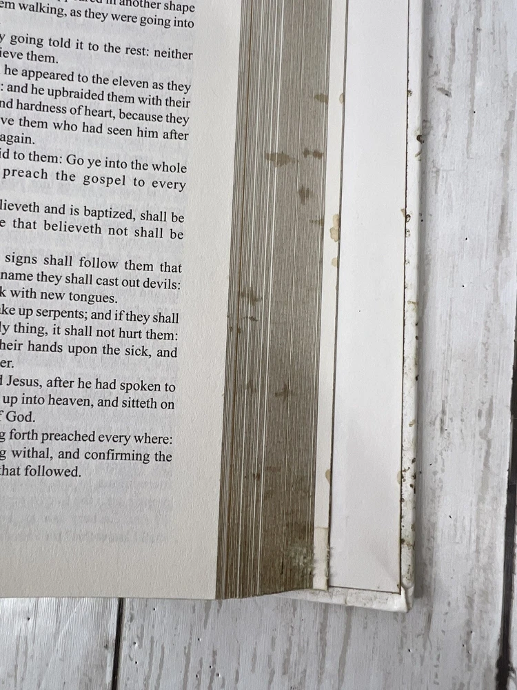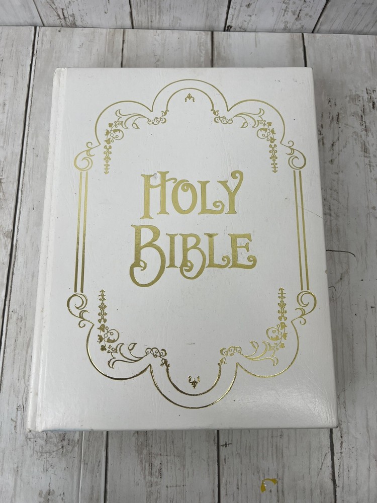 Holy Bible Catholic Family Record Edition Padded White Gold No Writing Imperfect Minor spots on page spine. No writing. Please see photos for measurements and condition.