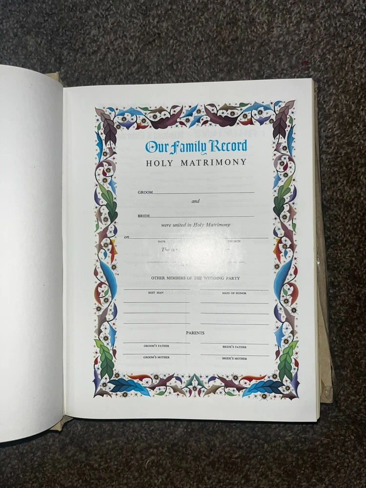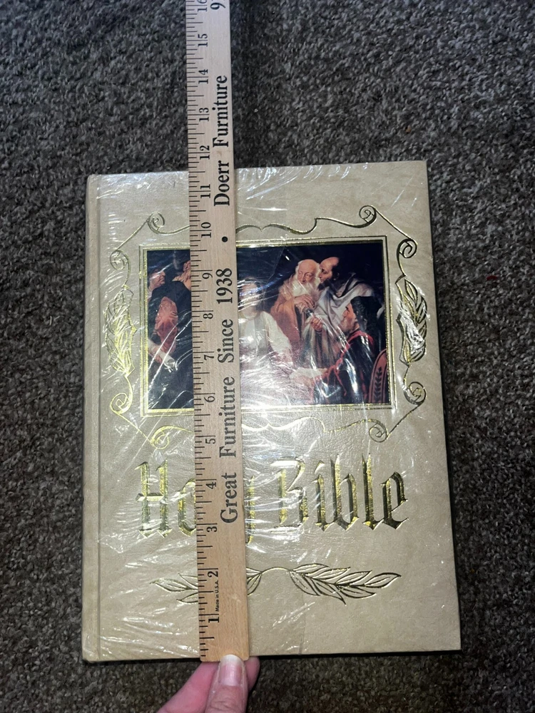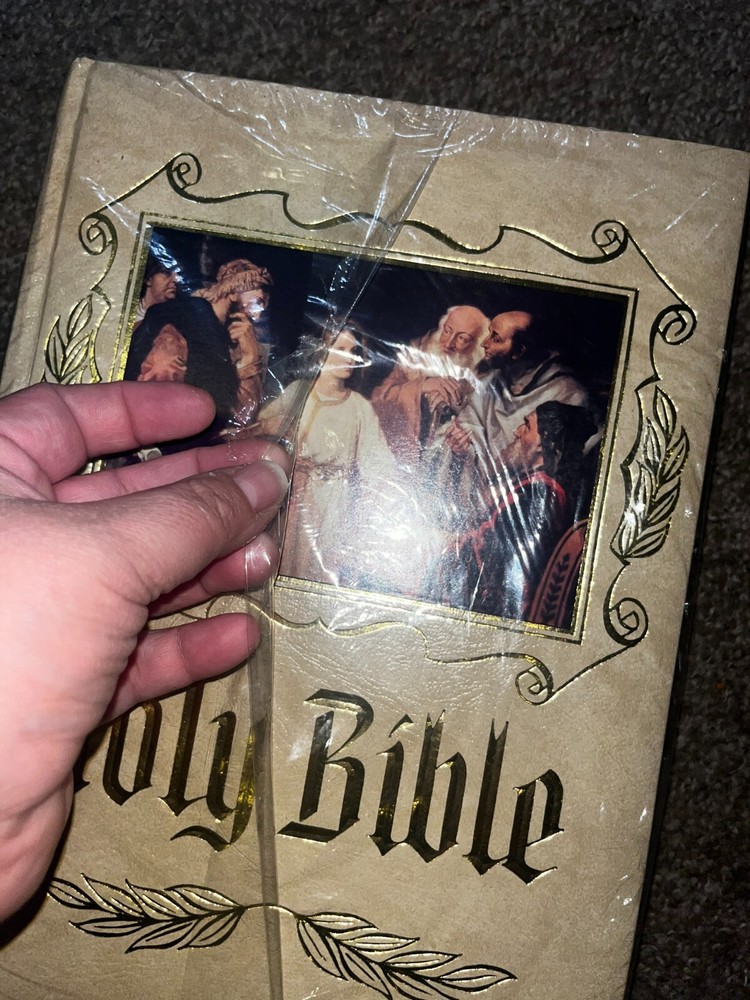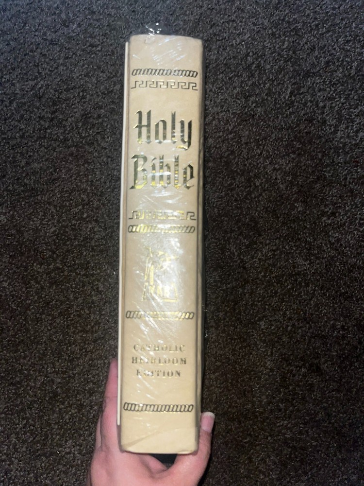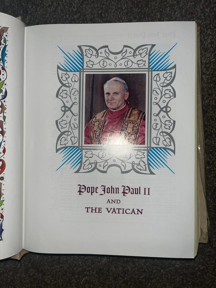EUC Holy Bible Catholic Heirloom Edition 1984-85 Leather bound NAB Pope John Paul. This bible is new, unused, still has original cellophane on book (tear in front of the cellophane). Color pictures inside. Red Lettered. Please keep in mind, this bible is OLD. It's in excellent used condition, but is vintage. PLEASE BE AWARE THAT ALL PICTURES WERE TAKEN WITH AN IPHONE AND HAS THE FLASH ON. COLORS MAY DIFFER FROM REAL LIFE. I TRY MY BEST TO REPRESENT ALL SIGNS OF WEAR TO MY BEST ABILITY, I MAY MISS A SPOT HERE OR THERE. PLEASE ASK QUESTIONS, REQUEST MORE PHOTOS, ETC.