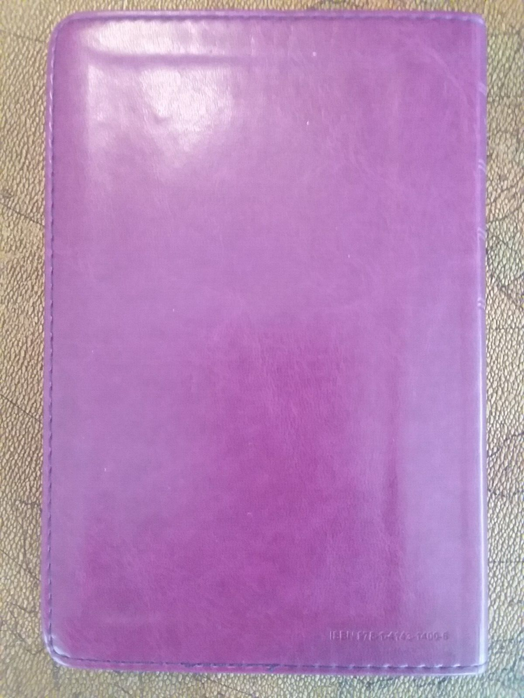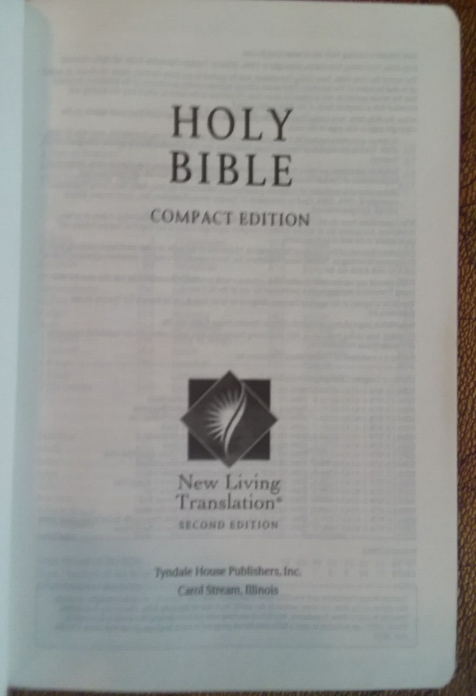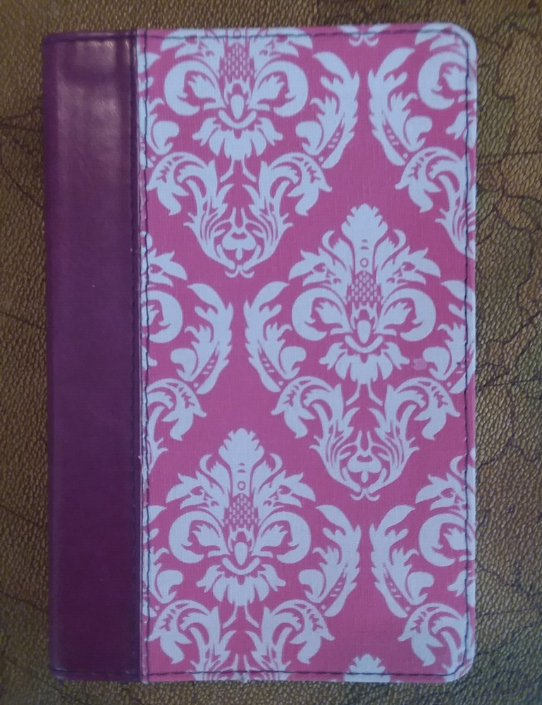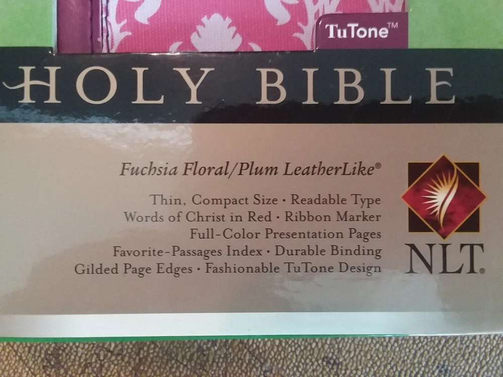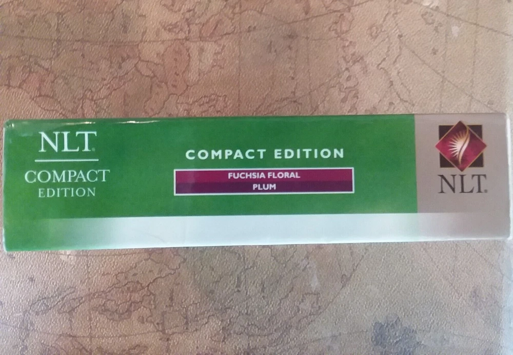 New Living Translation Holy Bible Compact Edition. TuTone Fuchsia Floral/Plum Leatherlike Cover. Thin, Compact Size, Readable Type, Words of Christ in Red, Ribbon Page Marker, Full Color Presentation Pages, Favorite-Passages Index, Durable Binding, Gilded Page Edges, Fashionable TuTone Design. Still in Original Box (see photos for condition).