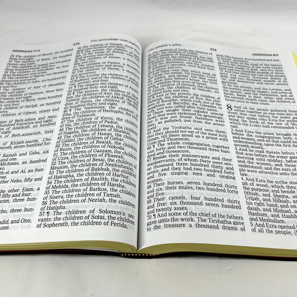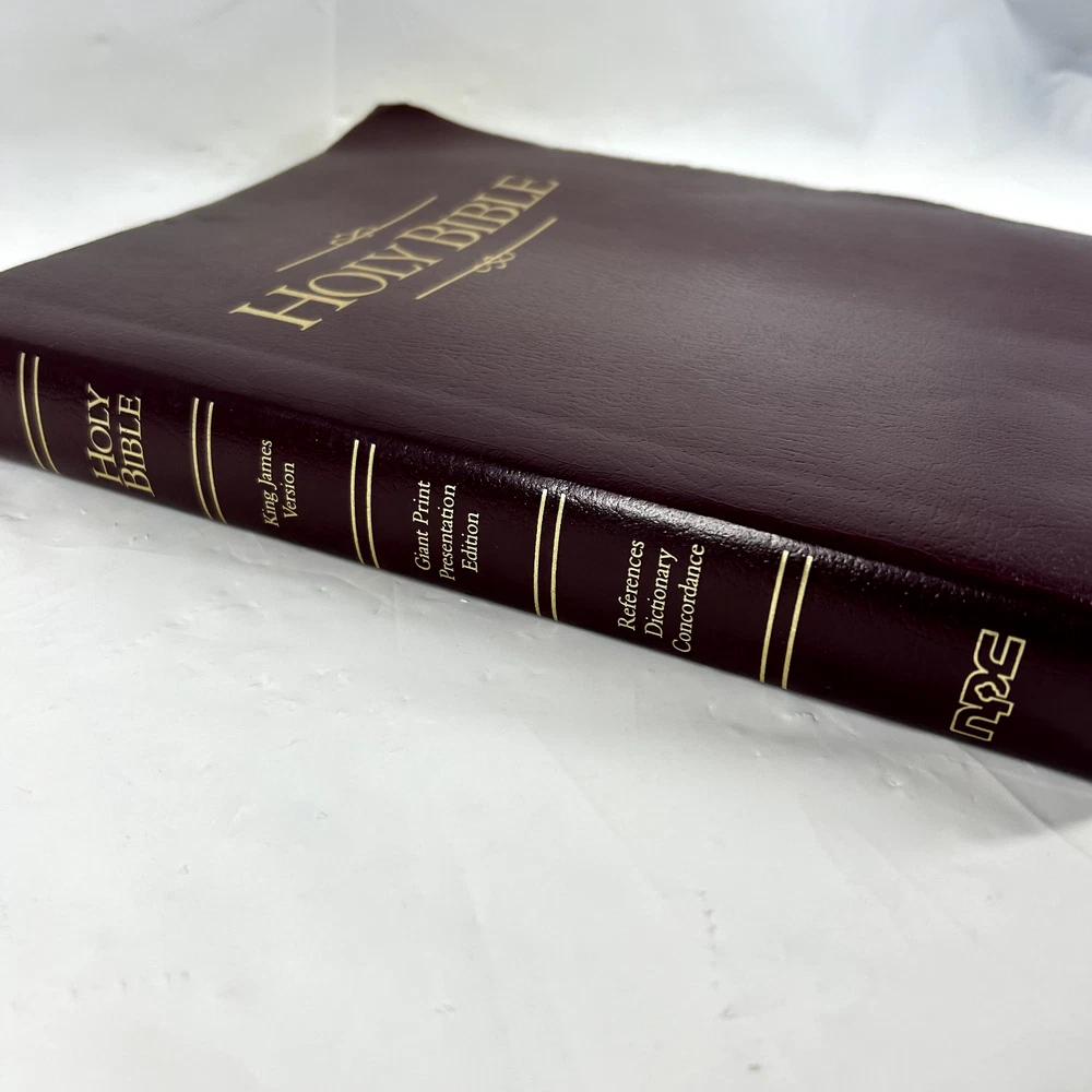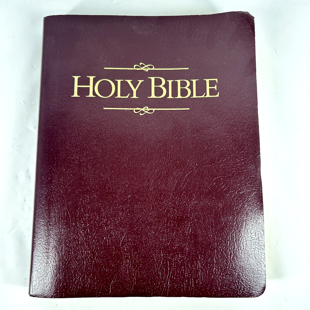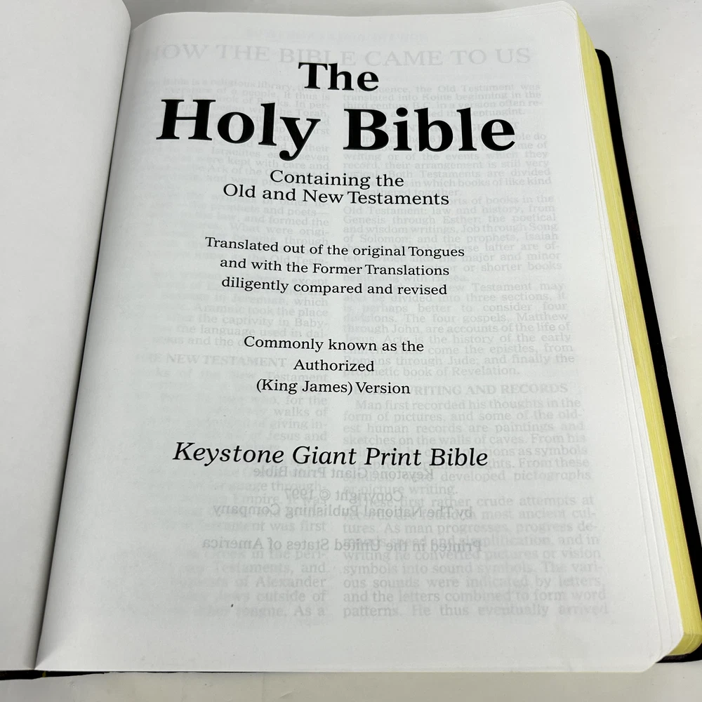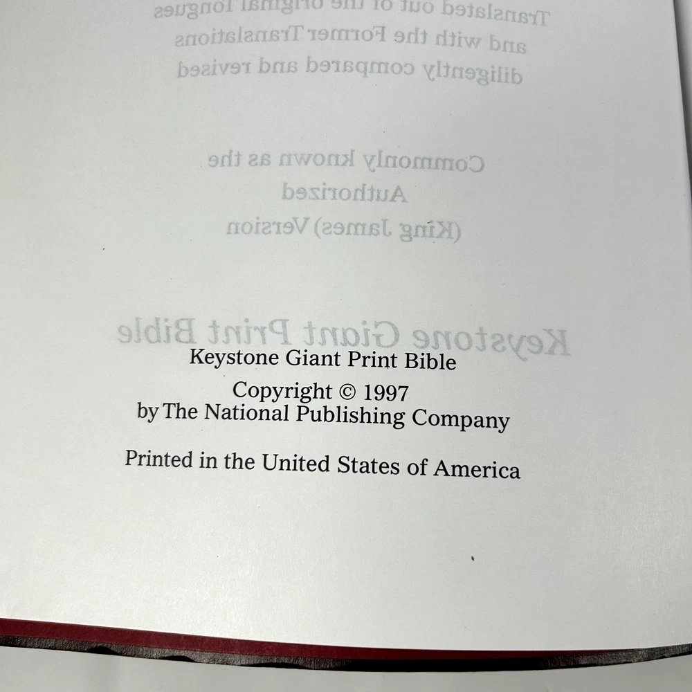 Holy Bible Giant Print Edition King James Version 1997 Keystone Faux Leather This is a large bible Measures 8.5 in wide and 11 in tall. Good used condition with no major damage to note. The cover does show shelf wear as shown in the photos. No writing, highlighting, or page folds. The book appears to be unused. Please use photos for condition notes.