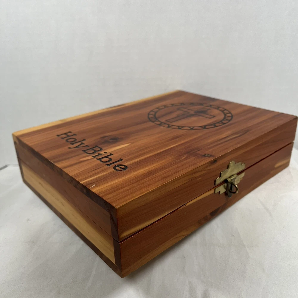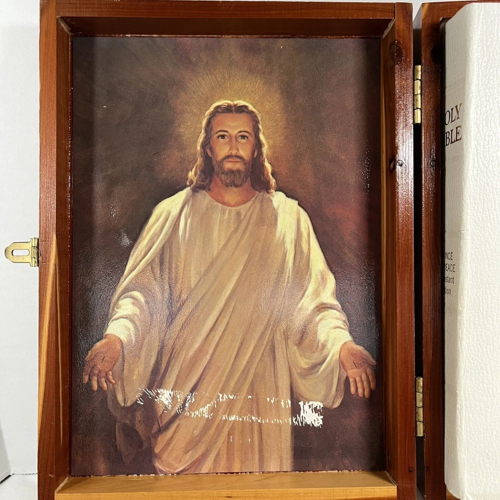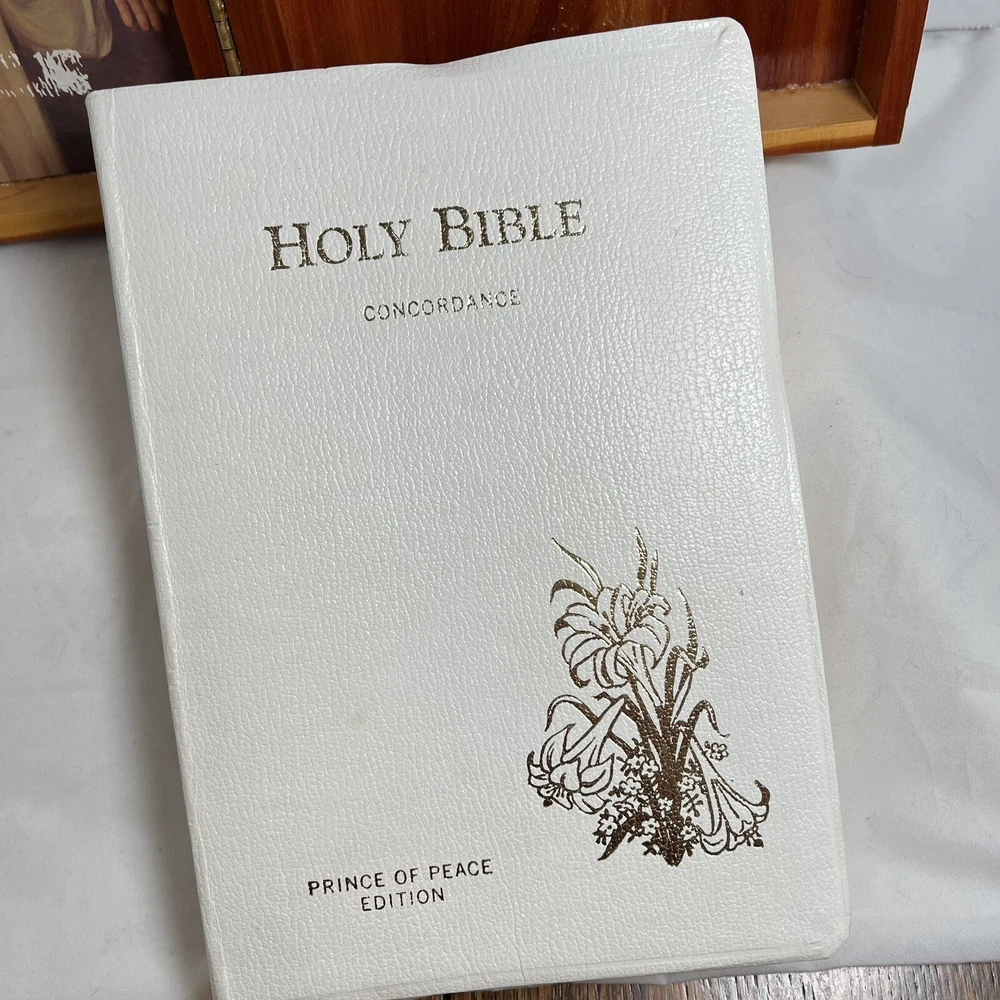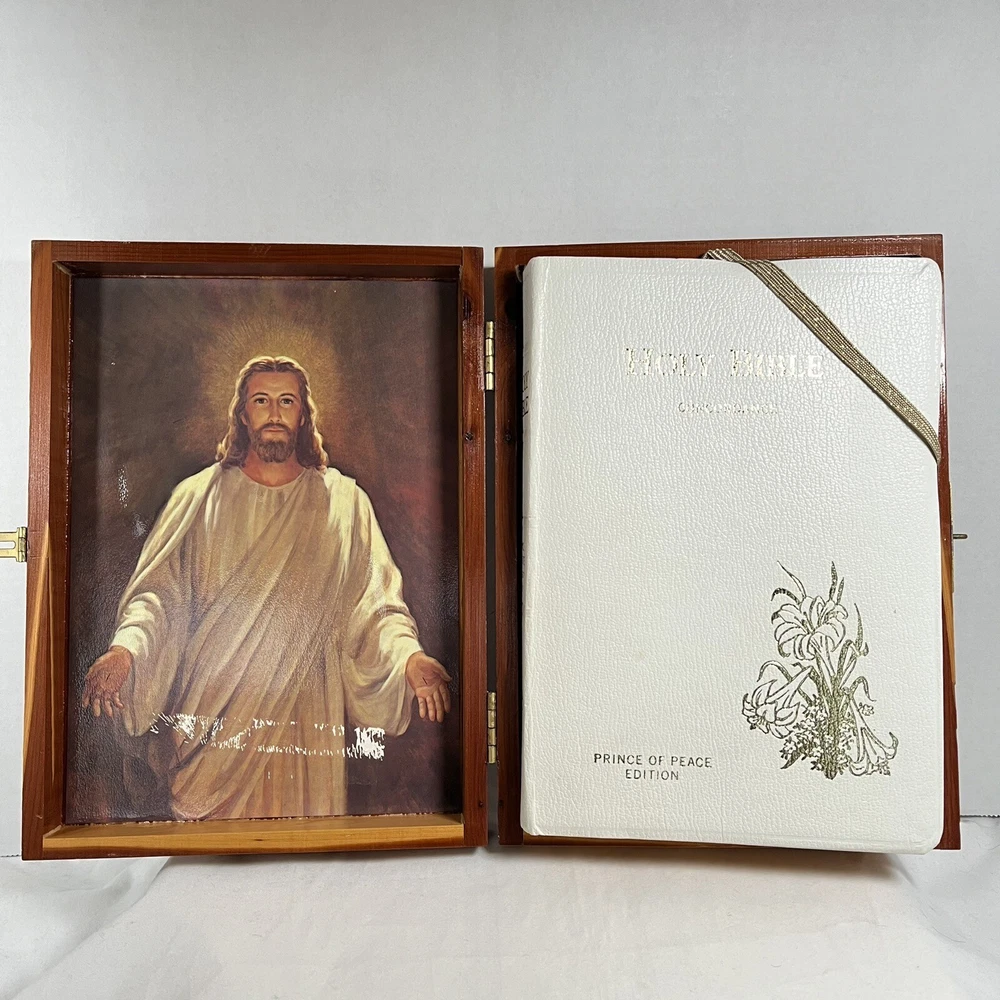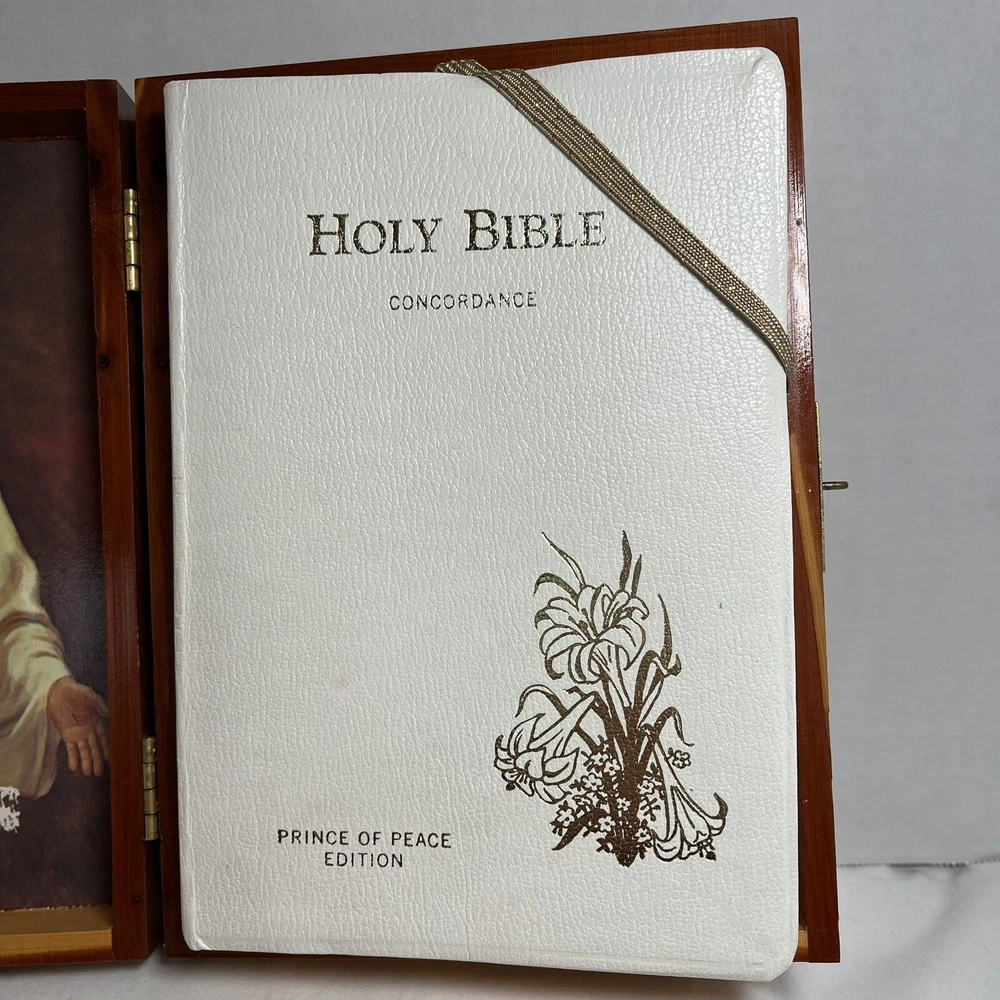Holy Bible In Cedar Box White Leather King James Concordance Jesus Memorial Vtg Here is a beautiful vintage (1970s) white leather covered Holy Bible, King James Version, in a US union-made cedar wood box with an image of Jesus inside the cover. These boxed Bibles were often given to the family of the deceased at a funeral by the funeral home. This Bible is unmarked inside except for the memorial page which states the name of the deceased person. There is a area of tape damage on the Jesus image, where a card was attached and pulled off at some point in the past. Box is about 8.75 inches high by 6.5 inches wide by 2 inches deep. Please see photos and zoom in for details.