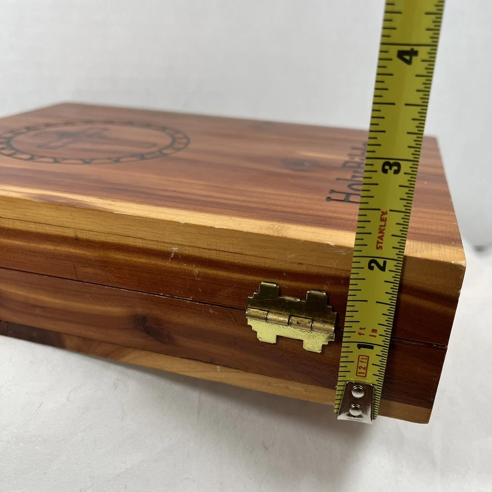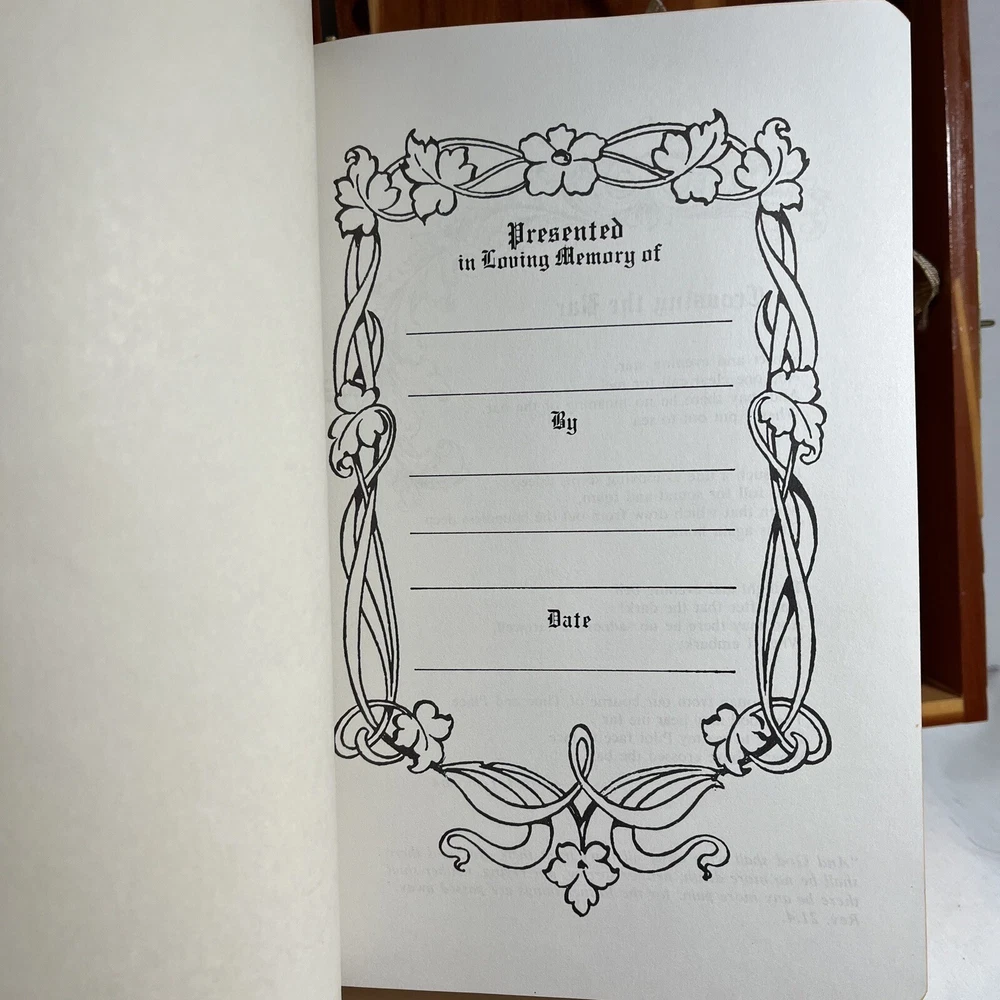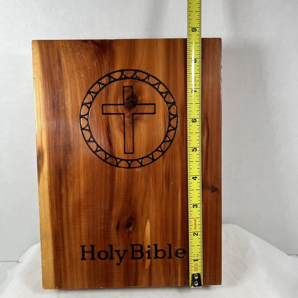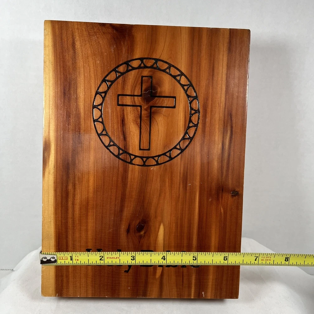 Holy Bible In Cedar Box White Leather King James Concordance Jesus Memorial Vtg Here is a beautiful vintage (1970s) white leather covered Holy Bible, King James Version, in a US union-made cedar wood box with an image of Jesus inside the cover. These boxed Bibles were often given to the family of the deceased at a funeral by the funeral home. This Bible is unmarked inside except for the memorial page which states the name of the deceased person. There is a area of tape damage on the Jesus image, where a card was attached and pulled off at some point in the past. Box is about 8.75 inches high by 6.5 inches wide by 2 inches deep. Please see photos and zoom in for details.