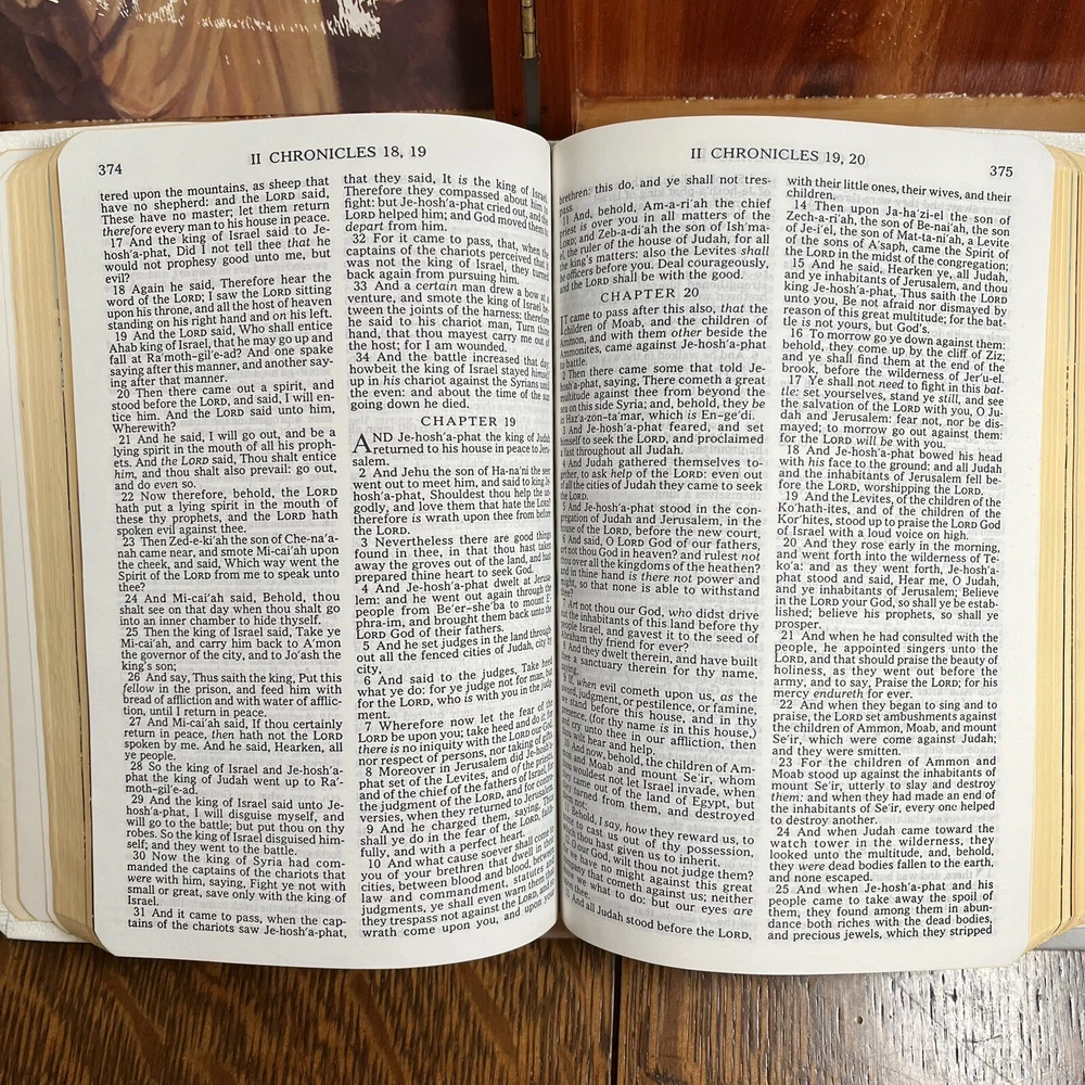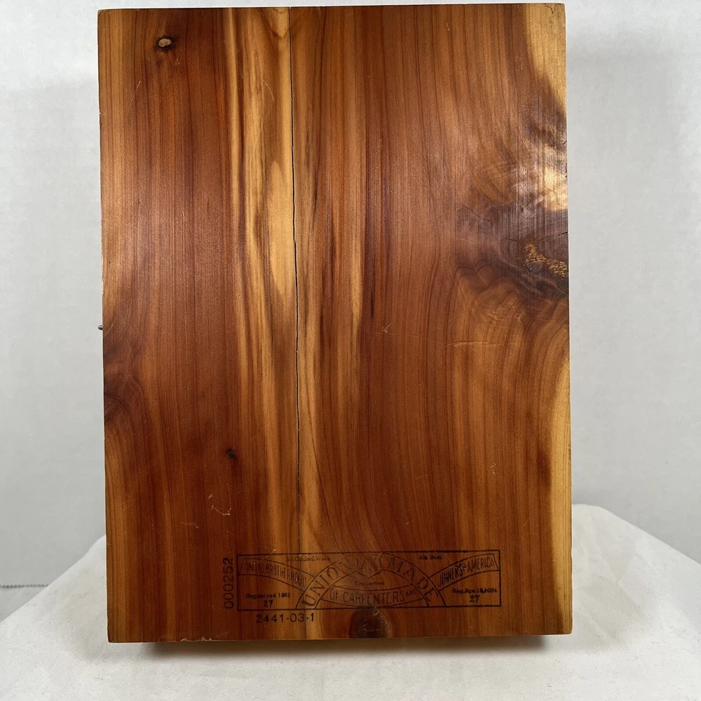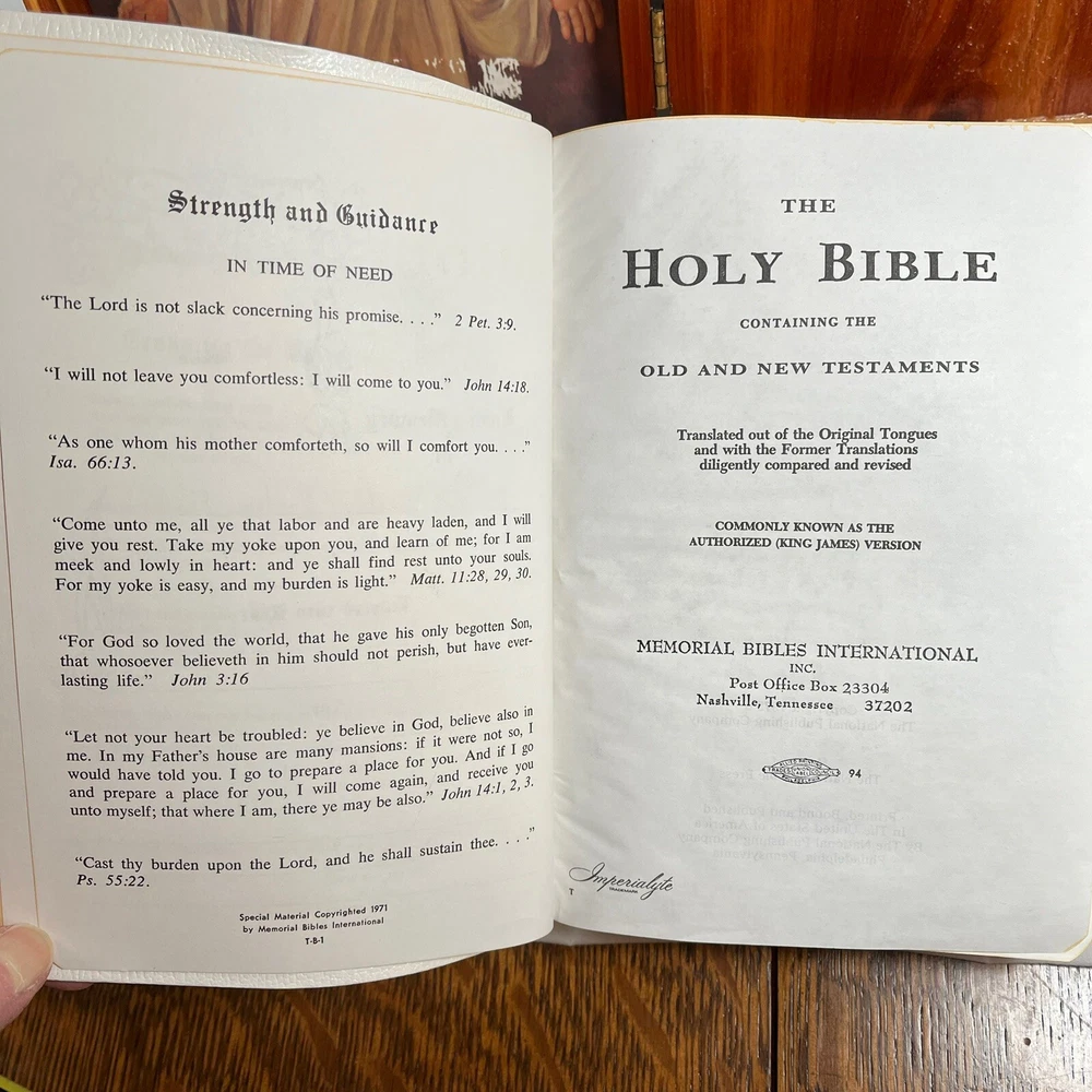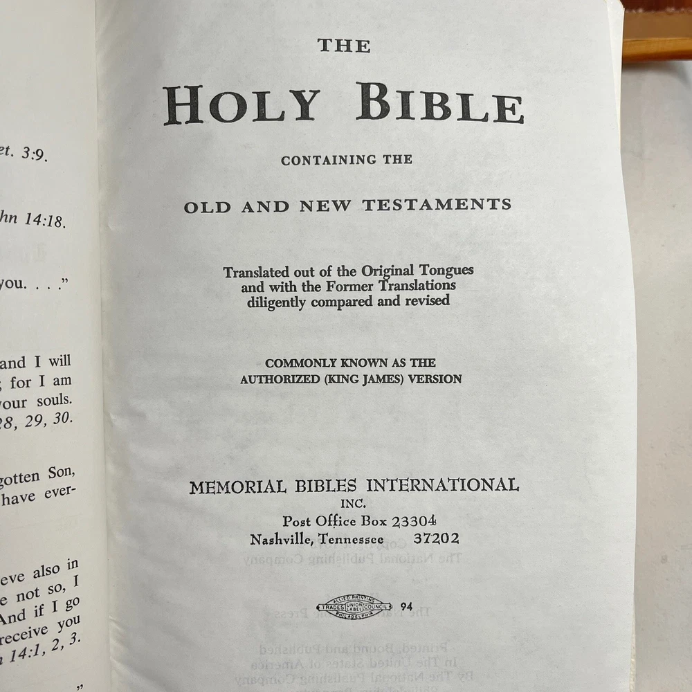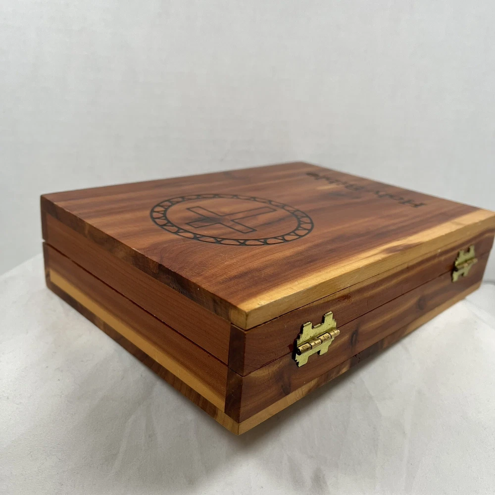 Holy Bible In Cedar Box White Leather King James Concordance Jesus Memorial Vtg Here is a beautiful vintage (1970s) white leather covered Holy Bible, King James Version, in a US union-made cedar wood box with an image of Jesus inside the cover. These boxed Bibles were often given to the family of the deceased at a funeral by the funeral home. This Bible is unmarked inside except for the memorial page which states the name of the deceased person. There is a area of tape damage on the Jesus image, where a card was attached and pulled off at some point in the past. Box is about 8.75 inches high by 6.5 inches wide by 2 inches deep. Please see photos and zoom in for details.