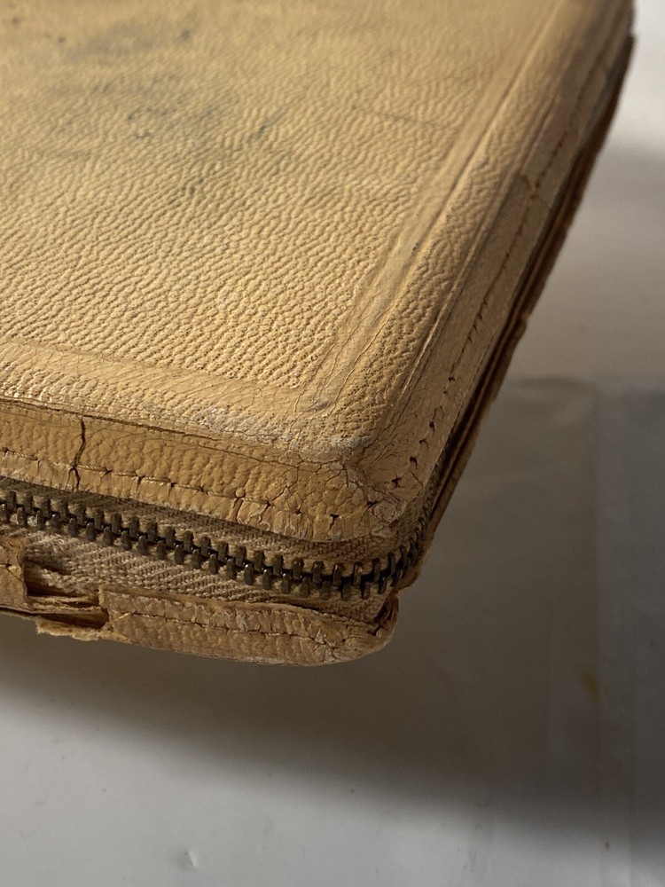Now here’s a book which must have been carried around the world a few times. Zipper still works fairly well. The old leather jacket is getting dry and brittle. Hand made and carefully attached page marker tabs along the outside. If this book could talk it would definitely add a few chapters on where it’s been. You can just sense so much looking at it and holding it.
