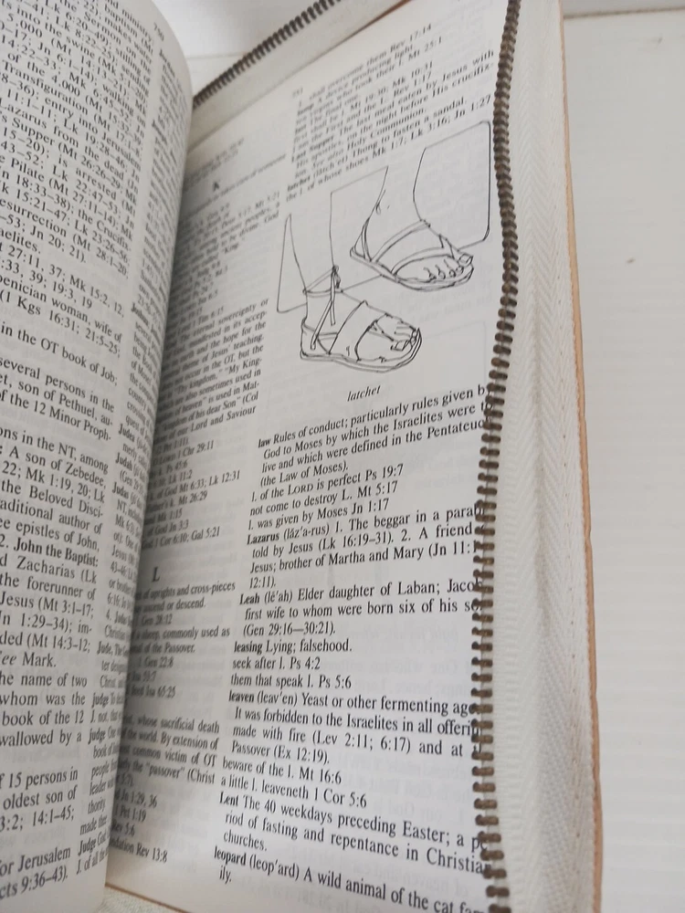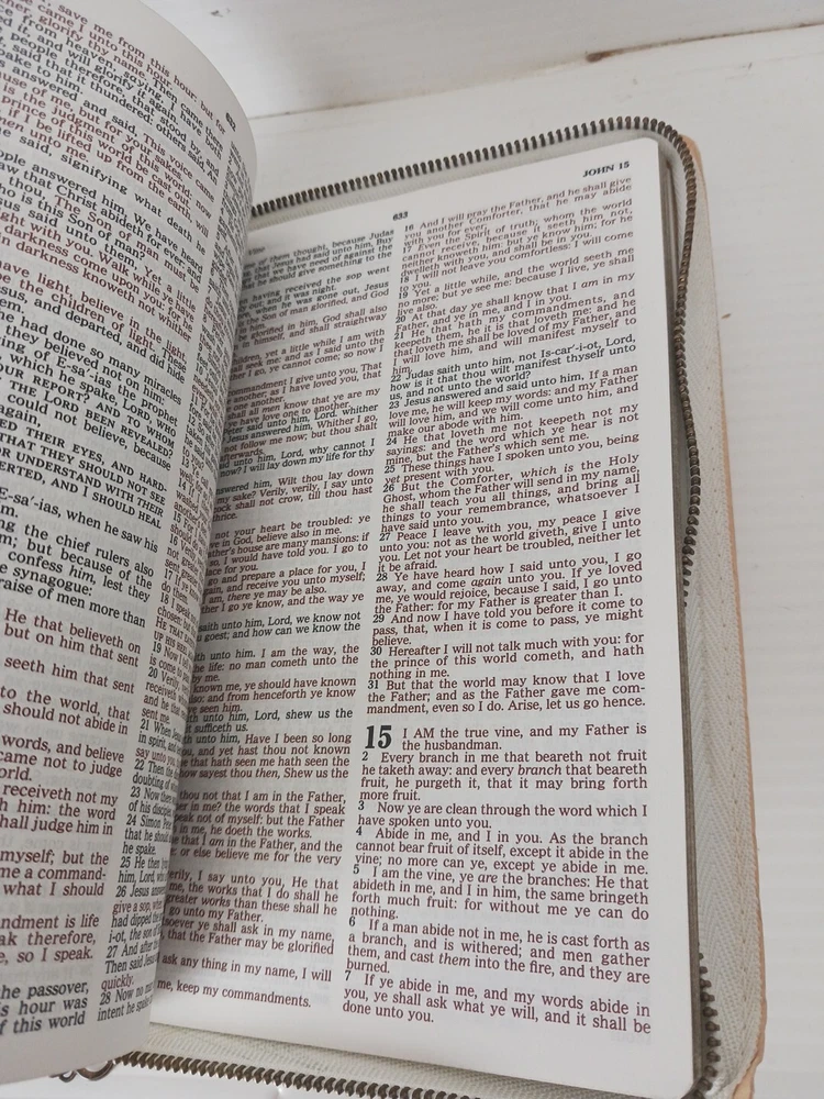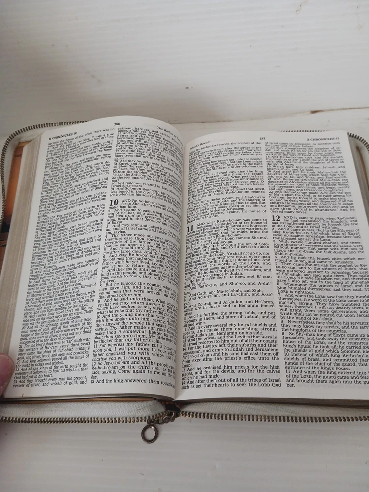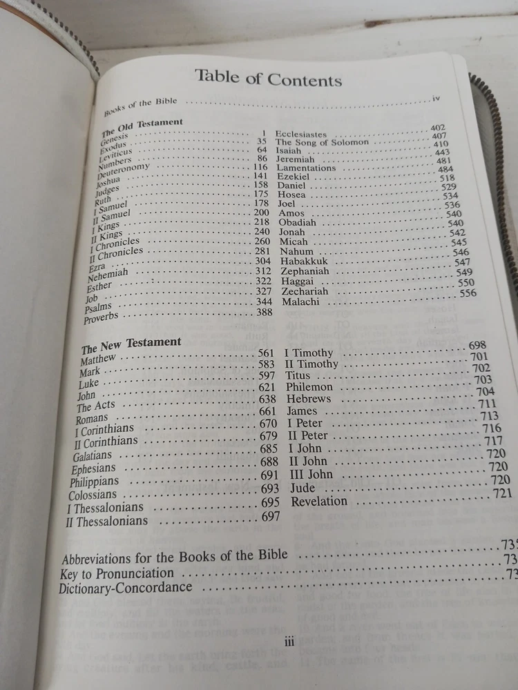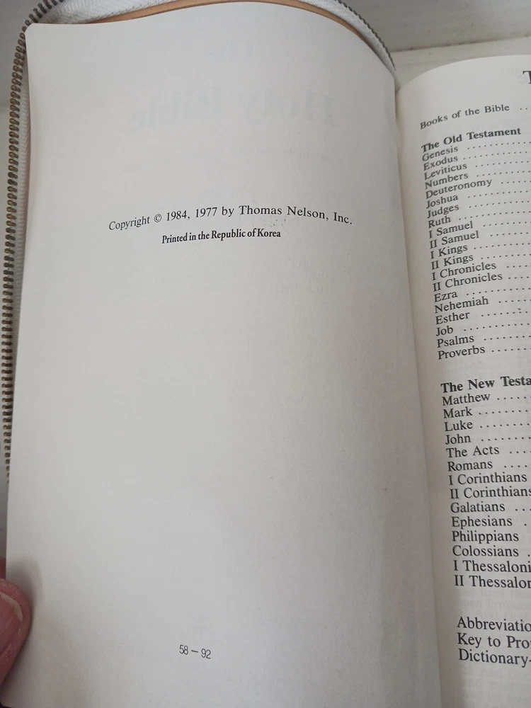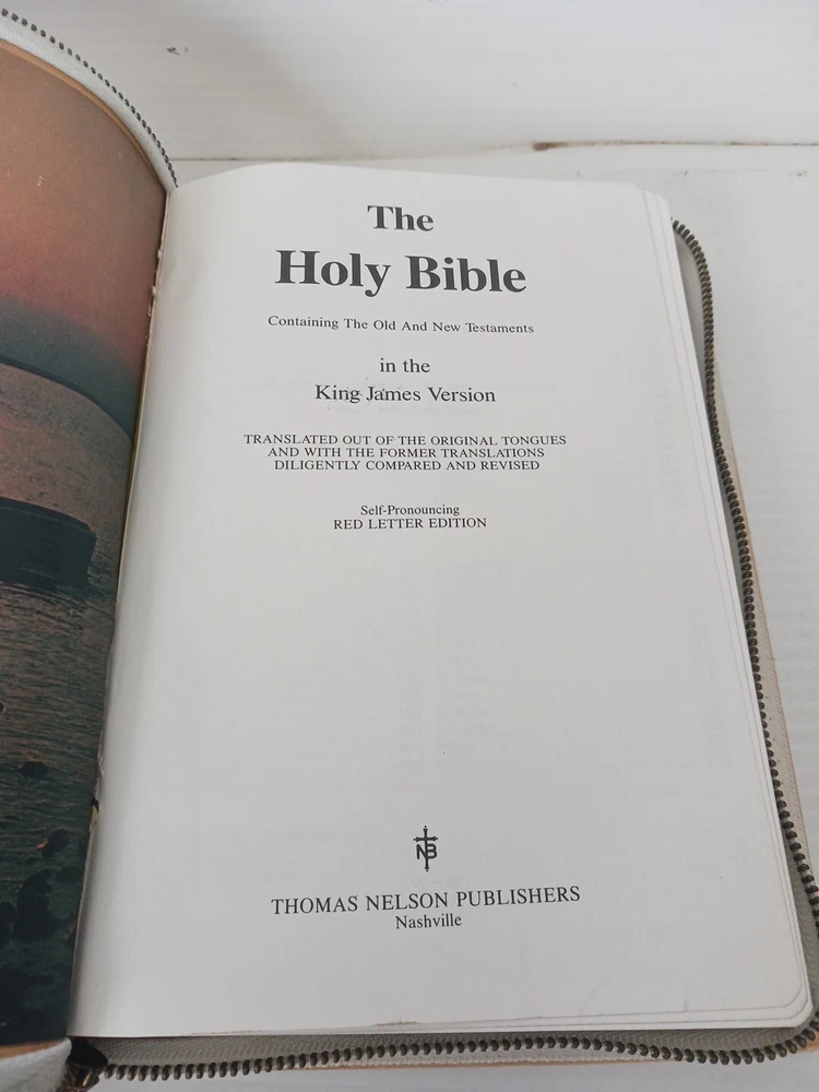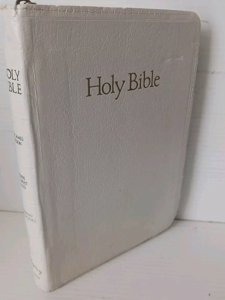 The product is a vintage 1984 edition of "The Bible" published by Thomas Nelson. It is a nonfiction book in English, with a faux leather bound cover featuring red letters, a zipper closure, and a dictionary/concordance. This Holy Bible KJV Red Letter White Zipper Regency 174mzw edition is 8 inches in length, 6 inches in width, and 1 inch in height, containing 764 pages. It is a comprehensive religious text with special features designed to aid in reading and understanding its contents.