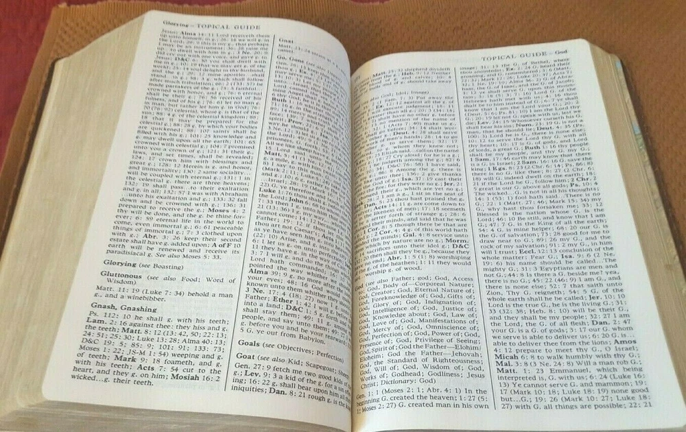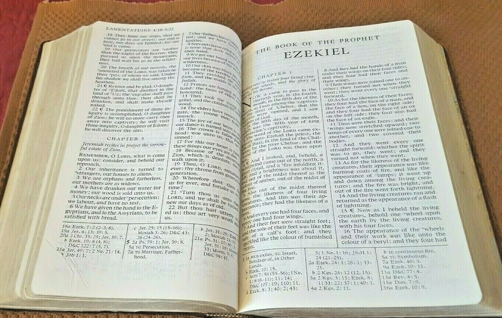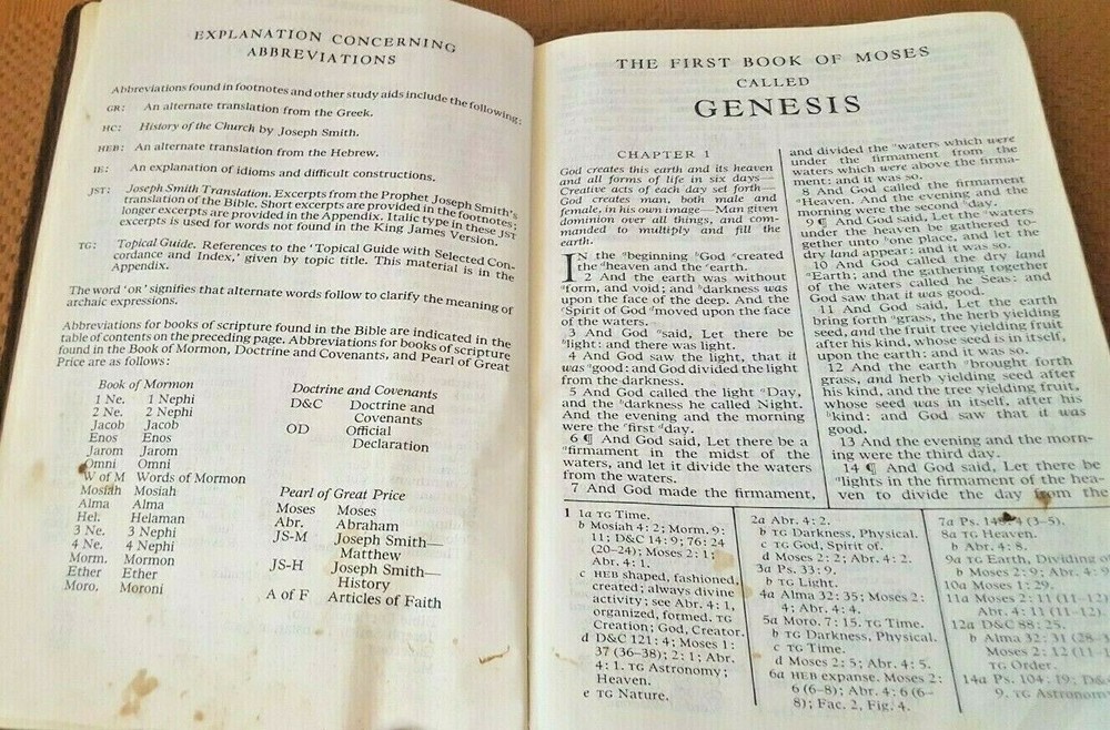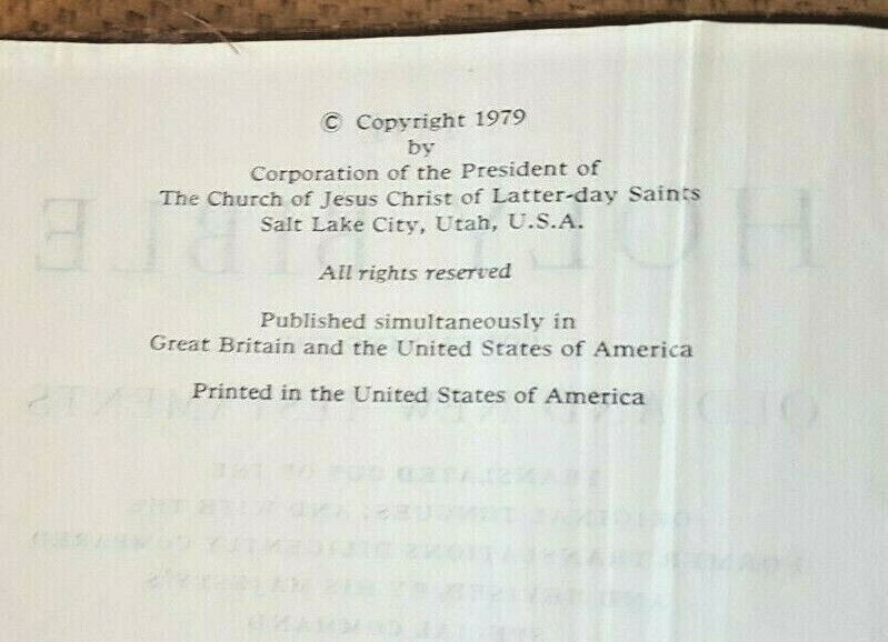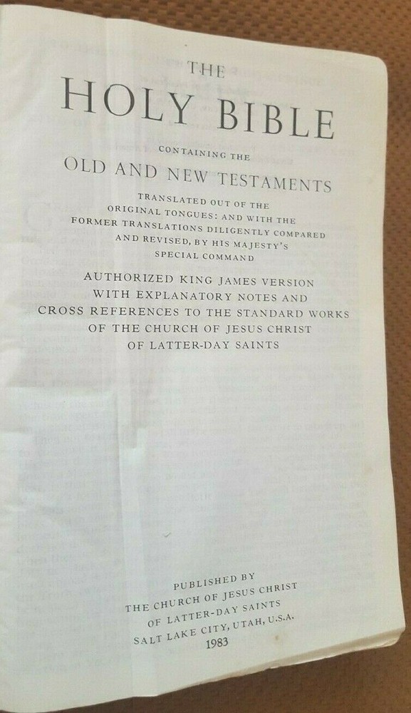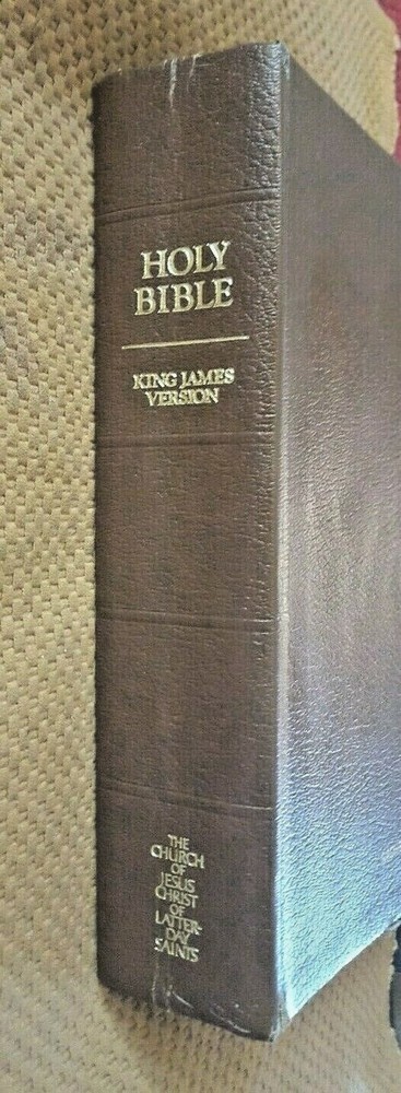 Holy Bible, King James Version (1983, Leather/LeatherettevBound). Has 1979 copyright date. 1983 indicated at title page. Brown color with gold/gilt lettering at cover and spine. Front cover has personalized name engraving. Publisher: The Church of Jesus Christ of Latter Day Saints. Approx. dimensions are 6 1/2 inches (w) by 9 3/8 inches (h) by 2 inches thick. Features: - Old and New Testaments - Topical Guide - Bible Dictionary - Joseph Smith Translation - Gazetteer - Maps Section Condition: Book is GOOD with moderate cover/corner/edge wear. Bright cover with crisp lettering at cover/spine. Binding is firm/tight. Some pages at beginning and end have creasing/wrinkling. Otherwise pages have light to moderate wear. Small stains/print marks noted at first 4-5 pages noted. No marks or odors noted. , stains or odors noted. Please review photos to further evaluate condition. Please ask questions BEFORE bidding/buying. SAVE ON SHIPPING !!! I will combine shipping on additional books (most books qualify) for only ONE DOLLAR for each additional book purchased. Please use the "ADD TO CART" button and then "CHECKOUT" to combine shipping. Fees should calculated automatically. NEED IT FAST. Contact me for an Expedited shipping quote BEFORE bidding/buying. Puerto Rico and other US Territories may contact me for Priority Mail shipping quote. i do not ship Media Mail to these locations.