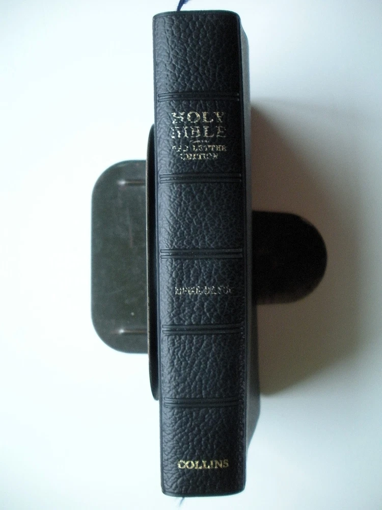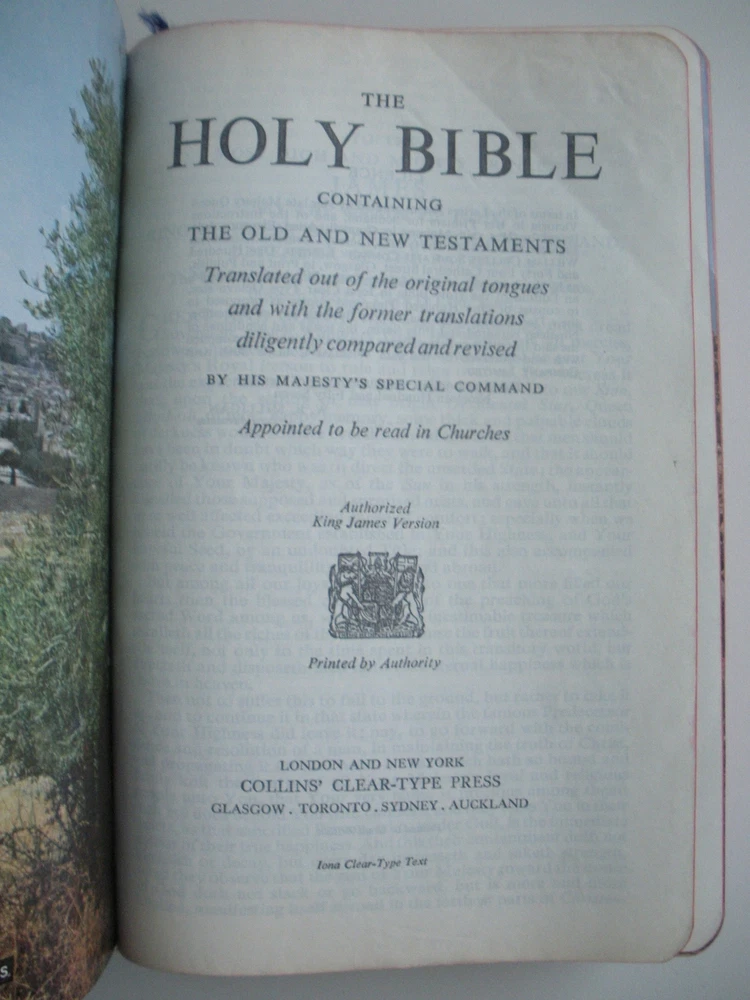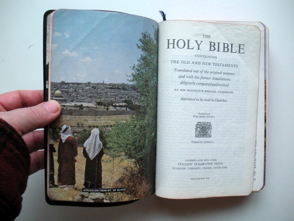Holy Bible KJV by HIS MAJESTY'S SPECIAL COMMAND 1957 Vintage Faux Leather JESUS Holy Bible KJV by HIS MAJESTY'S SPECIAL COMMAND 1957 Vintage Faux Leather JESUS FORMAT: Flexible faux leather By His Majesty's Command Appointed to be read in Churches. Collins' Clear Type Press, and Color photographs of the Holy Land, Time charts of Bible history, and maps. CONDITION: This book has been read and remains in used GOOD condition overall. The cover has wear of the corners and edges. The binding is strong but the end papers have some damage and are beginning to separate from the cover due to age. The pages are generally clean with writing on the presentation page. Please see photos. PAYMENT & SHIPPING TERMS: Please pay within 3 days of item purchase. We ship promptly upon receipt of payment. eBay is now collecting state sales tax where appropriate. Our "Free Shipping" offer includes USPS Media Mail shipping in the USA. This rate typically delivers in 5-9 days but can take as long as 30 days to some areas. If you need your purchase right away, we strongly suggest you choose the Priority Mail option at checkout. International Buyers Please Note: * Import duties, taxes and charges are not included in the item price shipping charges. These charges are the buyer's responsibility. * Please check with your country's customs office to determine what these additional costs will be prior to bidding/buying. * We do not mark merchandise values below value or mark items as "gifts" - US and International government regulations prohibit such behavior. Listing and template services provided by inkFrog