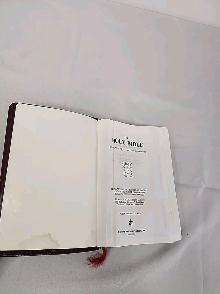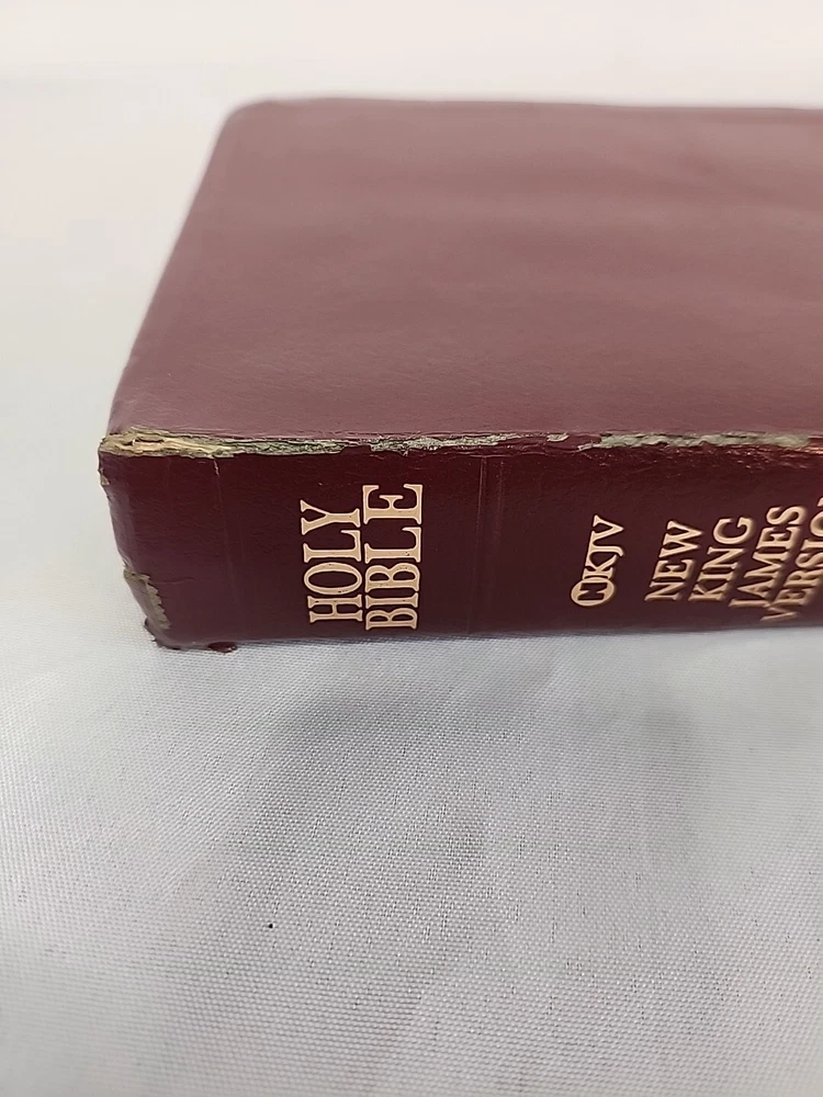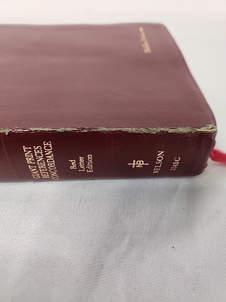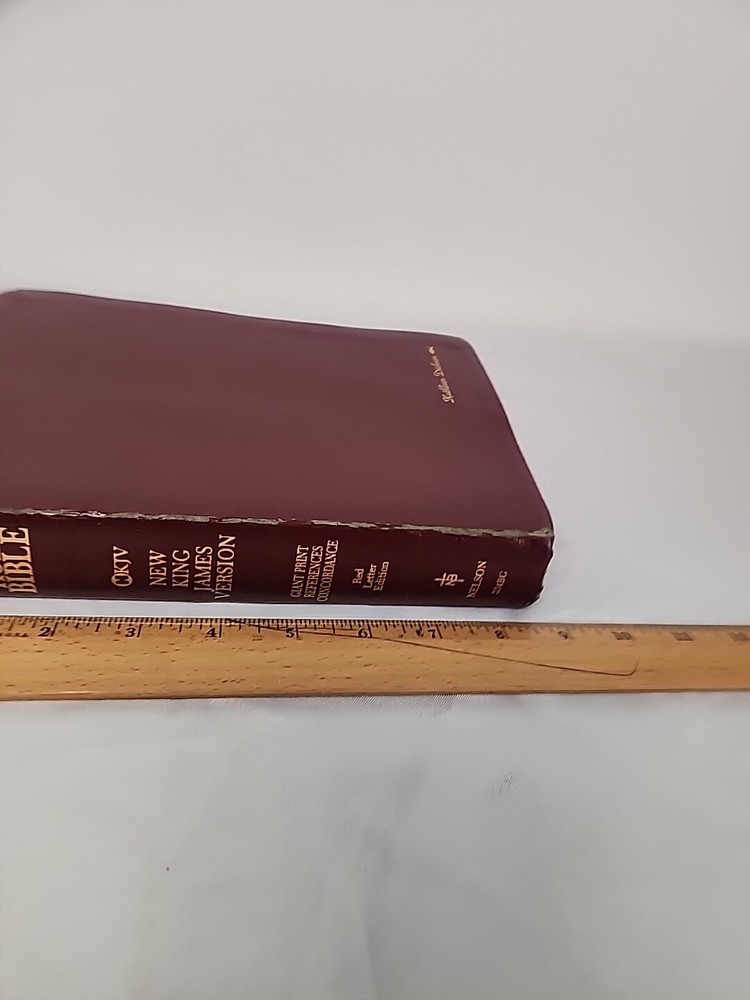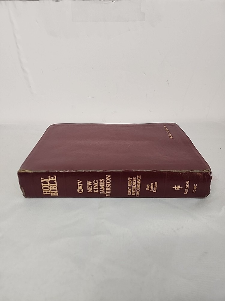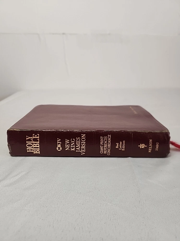 The product is a vintage 1992 Holy Bible NKJV Giant Print Red Letter Edition with bonded red leather cover. It is authored by the Holy Bible and published by Nelson Incorporated, Thomas. The book is inscribed and personalized, with a large size of 9 inches in length, 6 inches in width, and 2 inches in height. The content is in English, focusing on religious and spiritual topics related to the Bible. This Holy Bible is in Good condition and been well loved for the past 33 years. It has a name inscribed on the front cover. The spine shows ware on front and d back k covers. The second opening page has a water mark. The Third opening page has a tear at top corner as well as been creased . The fourth opening page has a crease at top corner. It as no writing on the pages nor highlighting on its pages. It has a pen mark on pag opposite The Old Testament Opening page. See the pictures. The red bookmark has a frayed end tip.