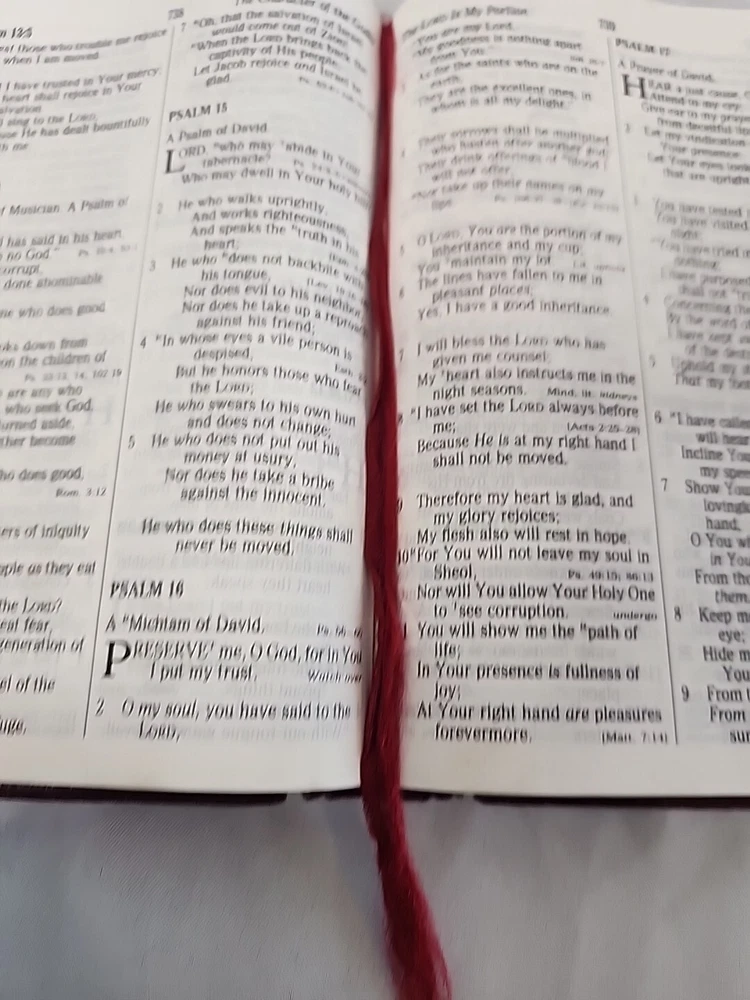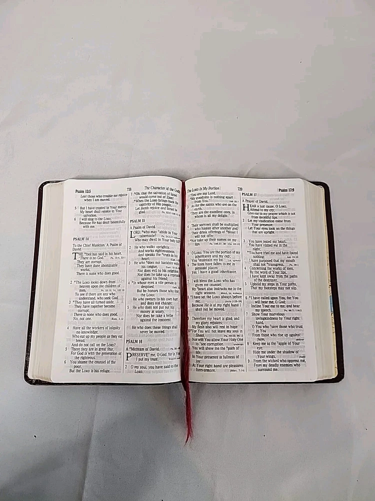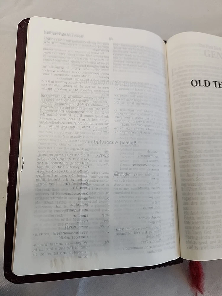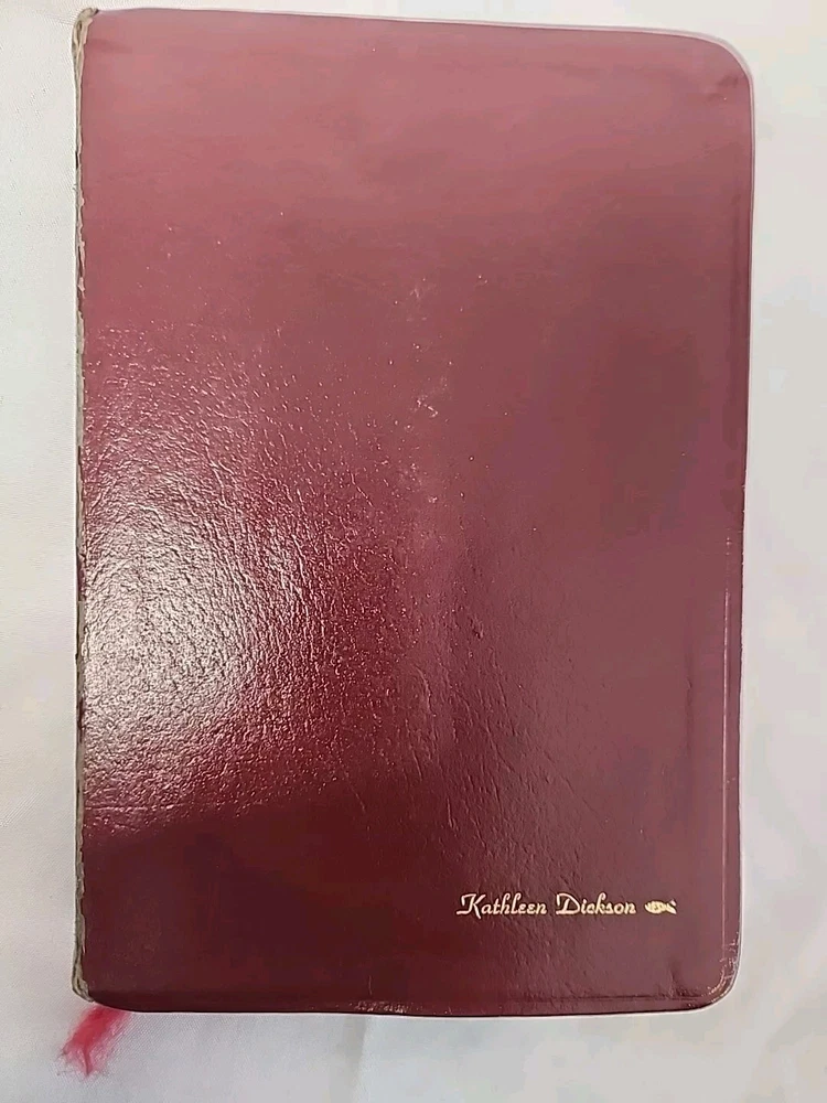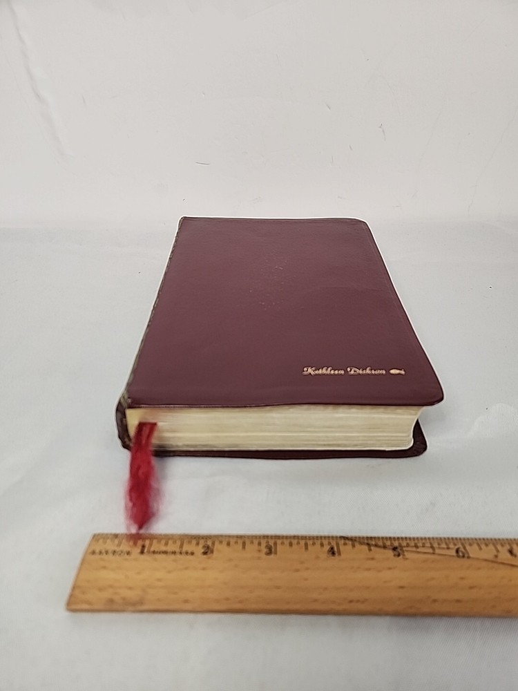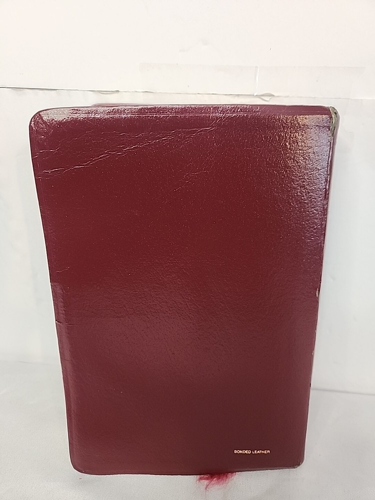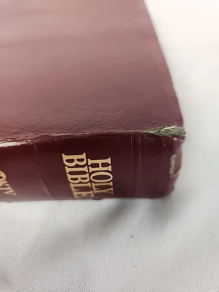 The product is a vintage 1992 Holy Bible NKJV Giant Print Red Letter Edition with bonded red leather cover. It is authored by the Holy Bible and published by Nelson Incorporated, Thomas. The book is inscribed and personalized, with a large size of 9 inches in length, 6 inches in width, and 2 inches in height. The content is in English, focusing on religious and spiritual topics related to the Bible. This Holy Bible is in Good condition and been well loved for the past 33 years. It has a name inscribed on the front cover. The spine shows ware on front and d back k covers. The second opening page has a water mark. The Third opening page has a tear at top corner as well as been creased . The fourth opening page has a crease at top corner. It as no writing on the pages nor highlighting on its pages. It has a pen mark on pag opposite The Old Testament Opening page. See the pictures. The red bookmark has a frayed end tip.