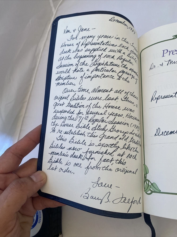 Holy Bible: New International Version Blue Leather Red Letter State Of Texas. This Bible was presented by Texas House of Representatives Barry B Telford to another family member. It was from an original order that members would have on their desks. This is a very unique and one of a kind due to its inscription and personalized.