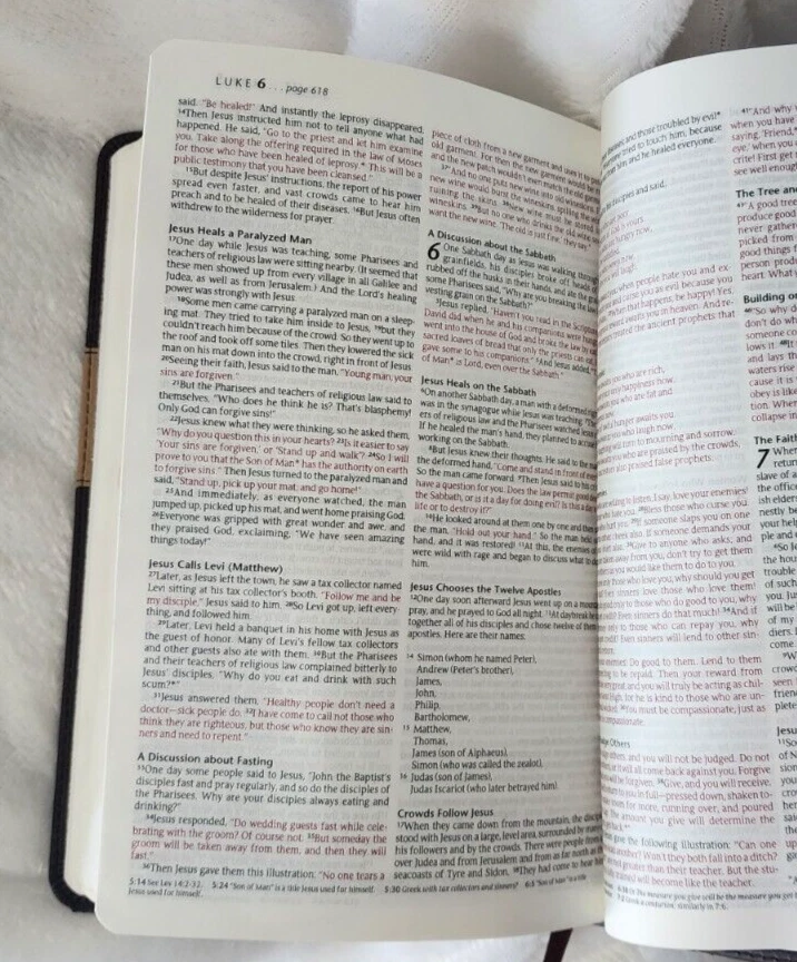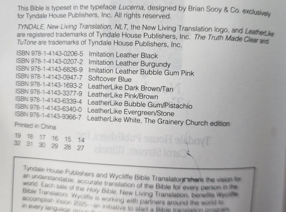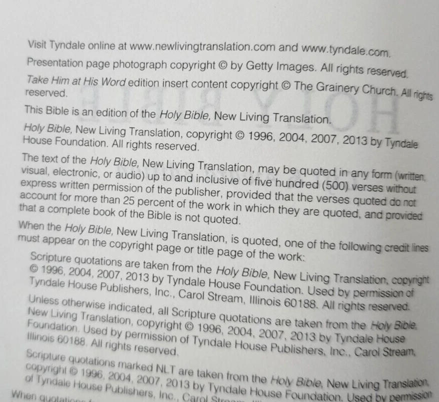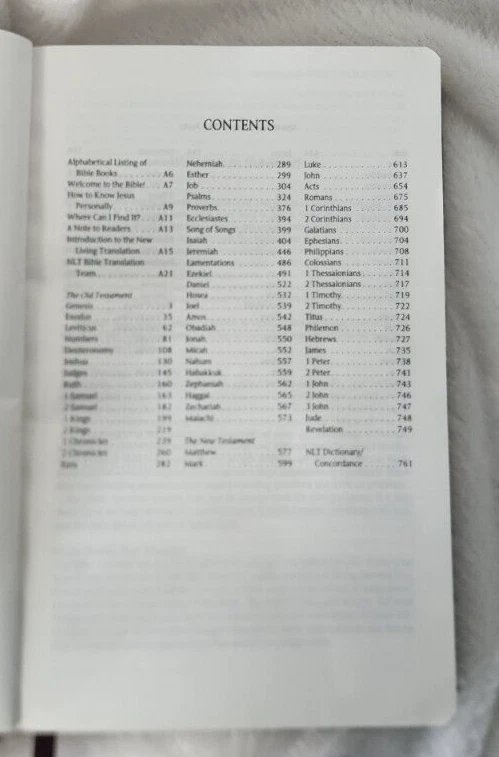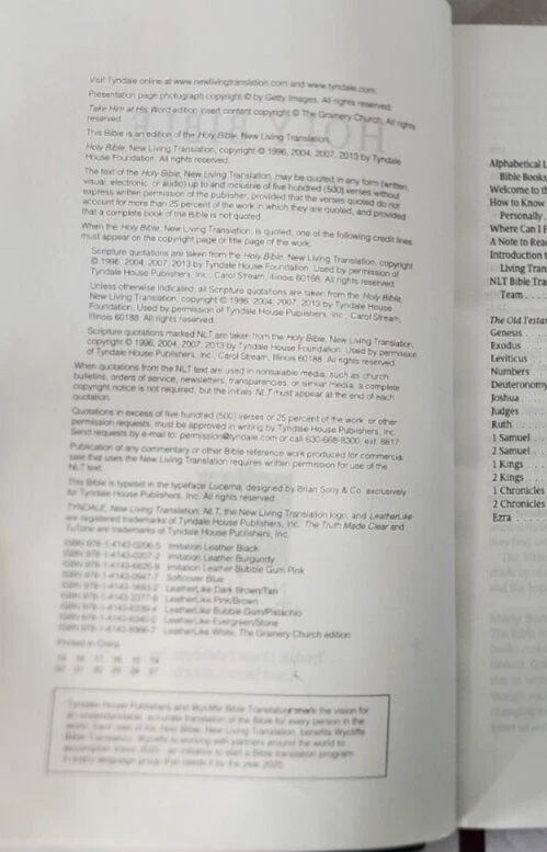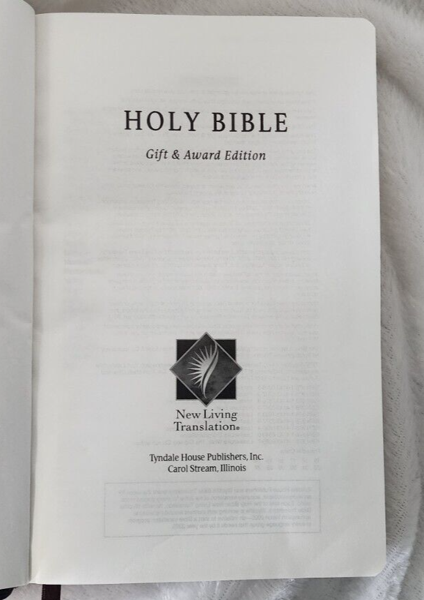 Holy Bible NLT -New Living Translation Tyndale House Some cover wear. Inside pages good. Minimal writing & underlining within. Some highlighting within. Some spots, staining within. A very tight copy - obviously not used a great deal. The ribbon mark / bookmark is like new condition This attractive bible is perfect sized and the cover is smooth and tactile. WILL SHIP WORLDWIDE