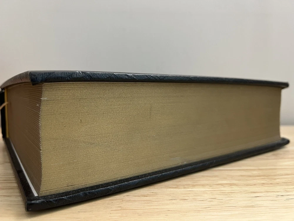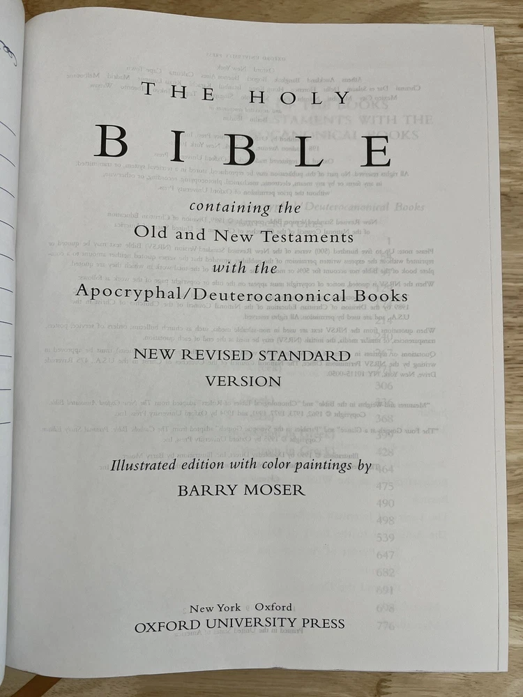 Holy Bible New Revised Standard Version Apocrypha Deuterocanonical Oxford 1989. Font is 10 point which is quite large. The cover is Imitation Leather. The bottom of the spine has a small tear as seen in the photos. Beyond this, the Bible is new, unread. Measures 11.25 x 9 x 3 inches. Please let me know if you have any questions. Thank you.