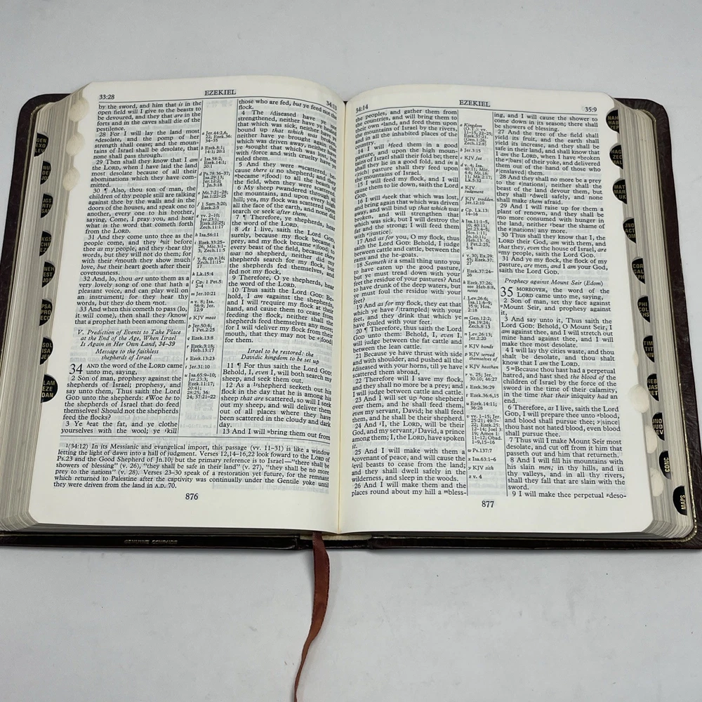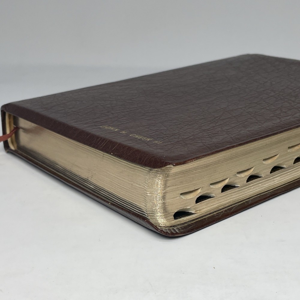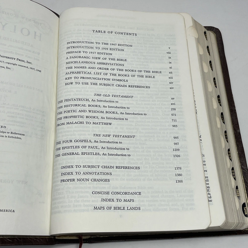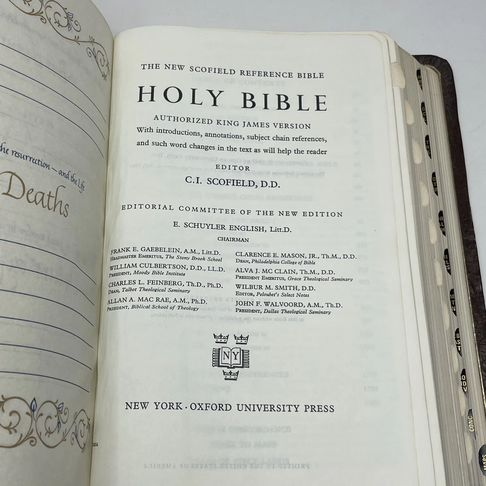 Holy Bible New Scofield Reference Edition Oxford Leather 1967 KJV Thumb Index This Bible is in good used condition. It has had minimal use. The only writing is the inscriptions on the inside and the “presented to” page. It is also personalized on the front cover as seen in pictures. Otherwise I could not find any highlighting or writing flipping through several times. See pictures for details of exact condition.
