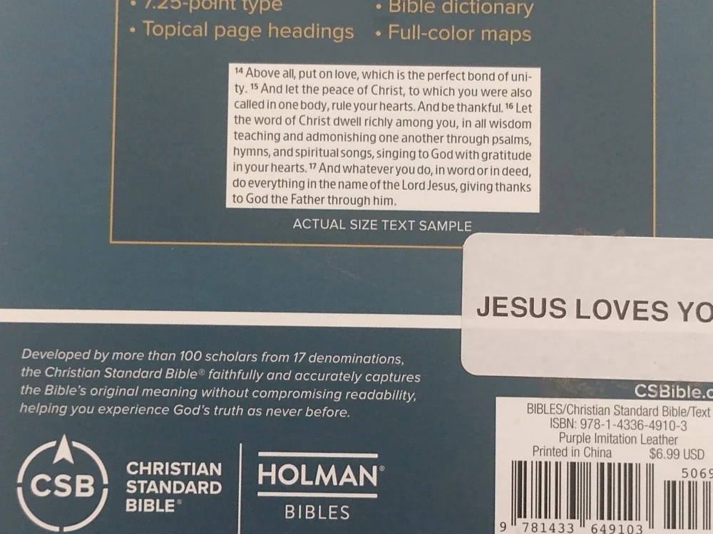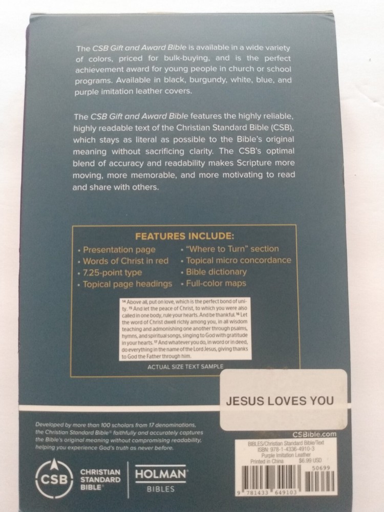 This beautiful purple CSB Bible is in excellent condition—it looks practically new with only minor shelf wear. The faux leather cover feels soft and durable, making it comfortable to hold. The text is clear and easy to read, perfect for daily study or worship. Love the rich purple color—it stands out in a meaningful way! Highly recommend for anyone looking for a reliable and stylish Bible.