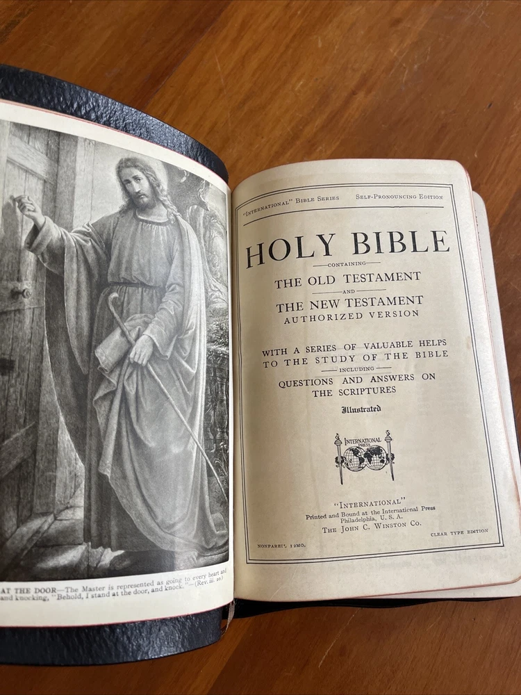 This antique Holy Bible is a rare find for collectors and enthusiasts of Christianity. The leather bound book features an illustrated pronouncing guide, making it easy to follow along and read. Published by The John Winston Co. before 1911, this Bible is a unique addition to any collection of antique books. The Bible is in very good condition. Owner inscription on second page, see pictures.