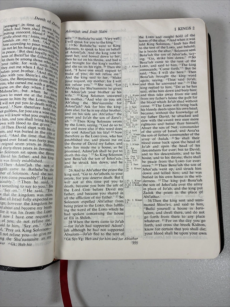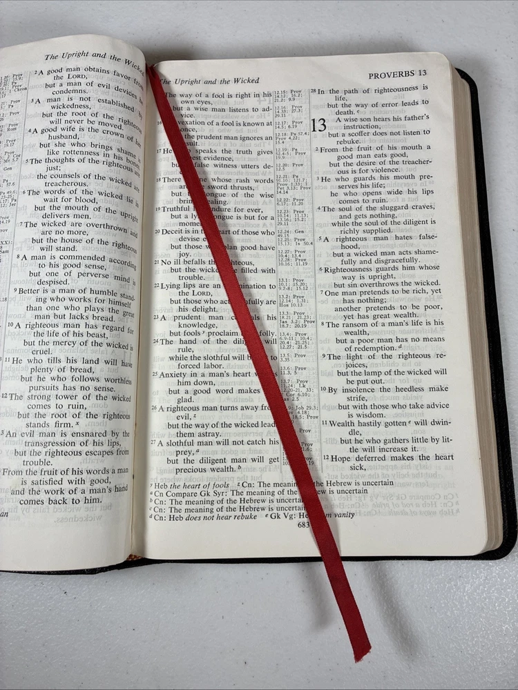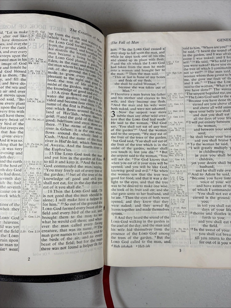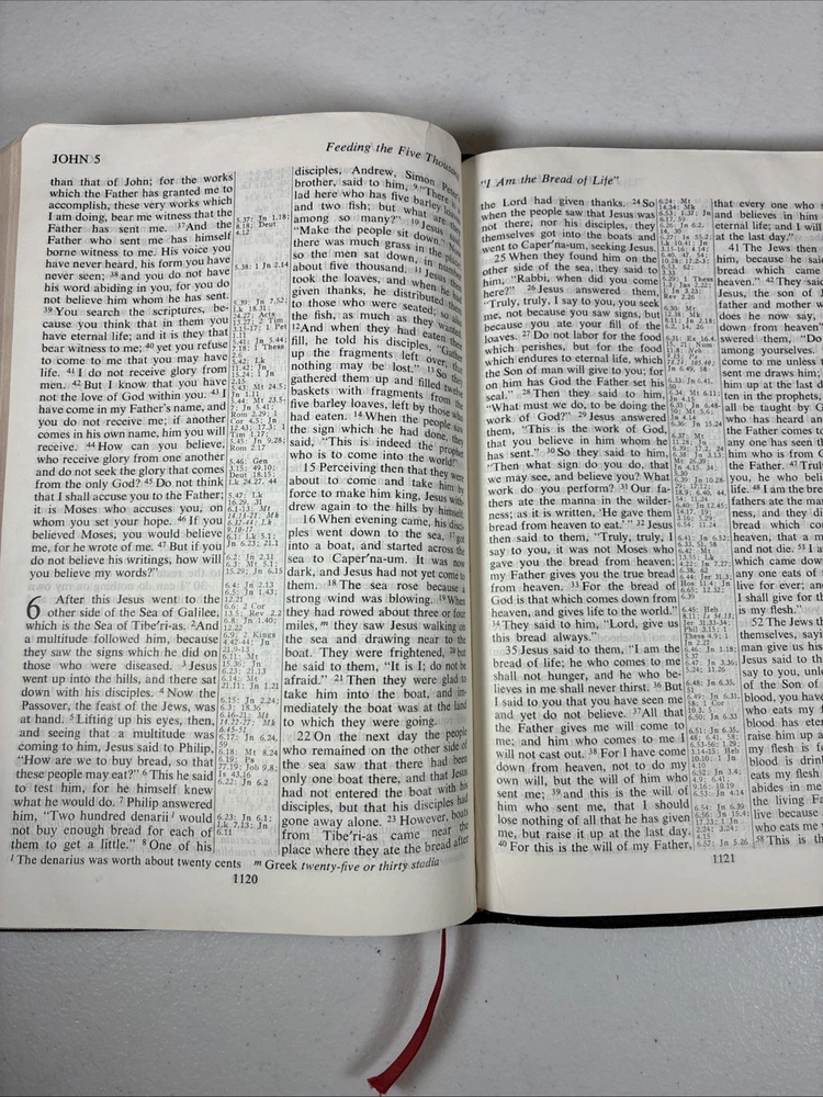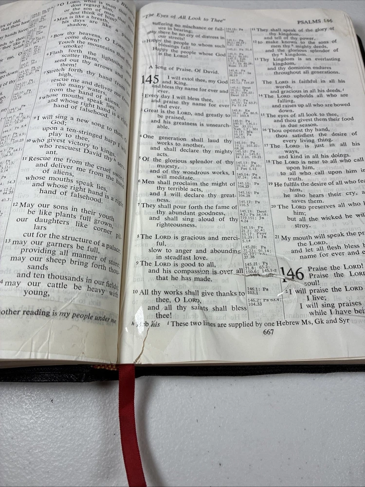 This Bible is a beautiful classic with rich Moroccan leather that feels amazing in hand. Despite a few taped pages and an inscription, it's in great condition—no markings or highlights. Perfect for collectors or anyone who appreciates vintage Bibles with timeless elegance!