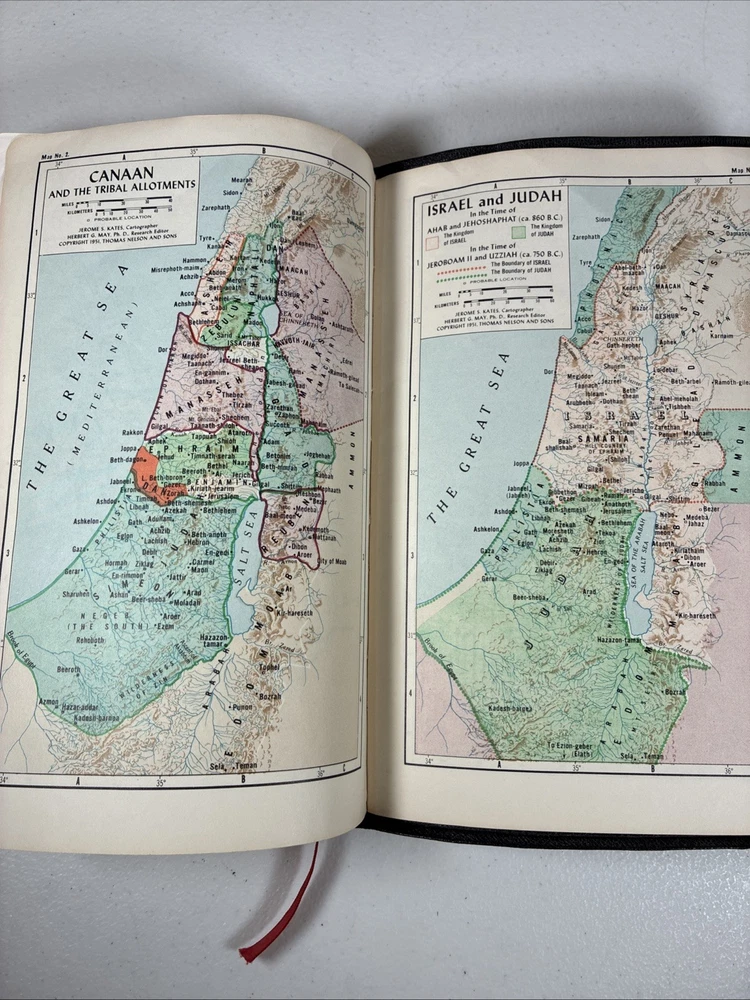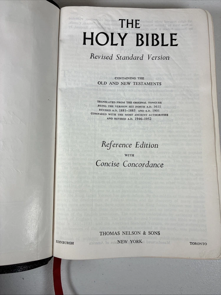 Holy Bible RSV Reference Concordance Thomas Nelson Moroccan Leather 1959 Please READ: -A couple of pages have been torn and taped. -Please note the inscription on the front cover. -The Bible has not been highlighted or marked. -Refer to photos for overall condition.