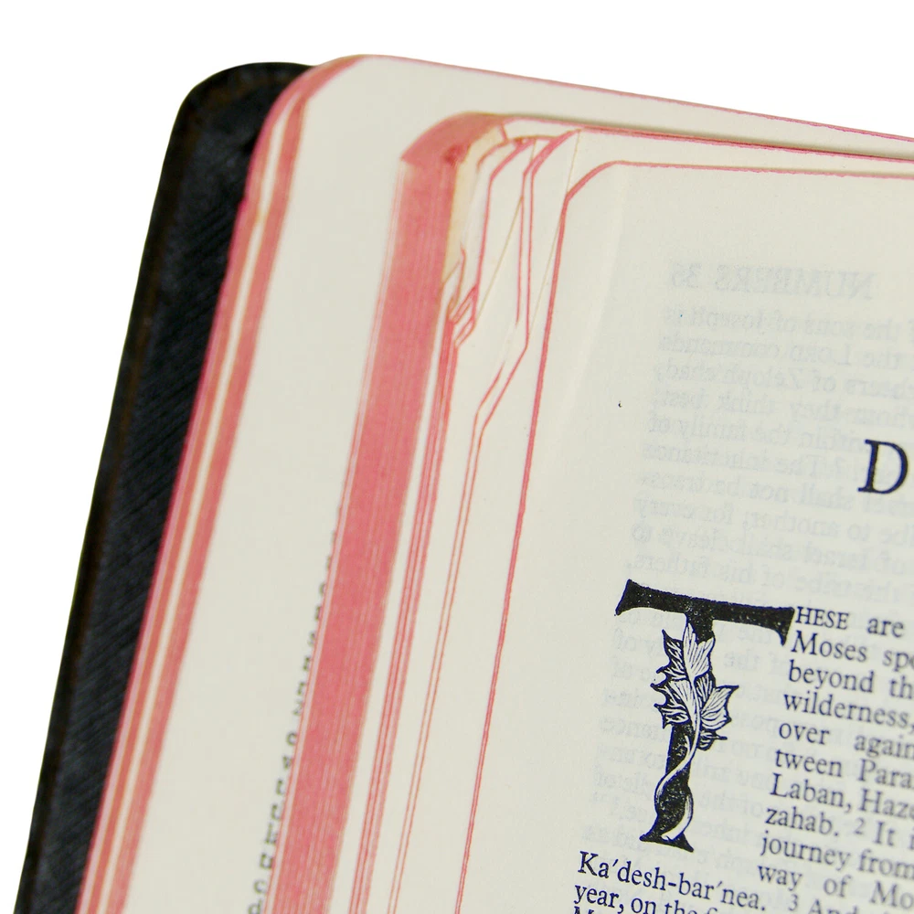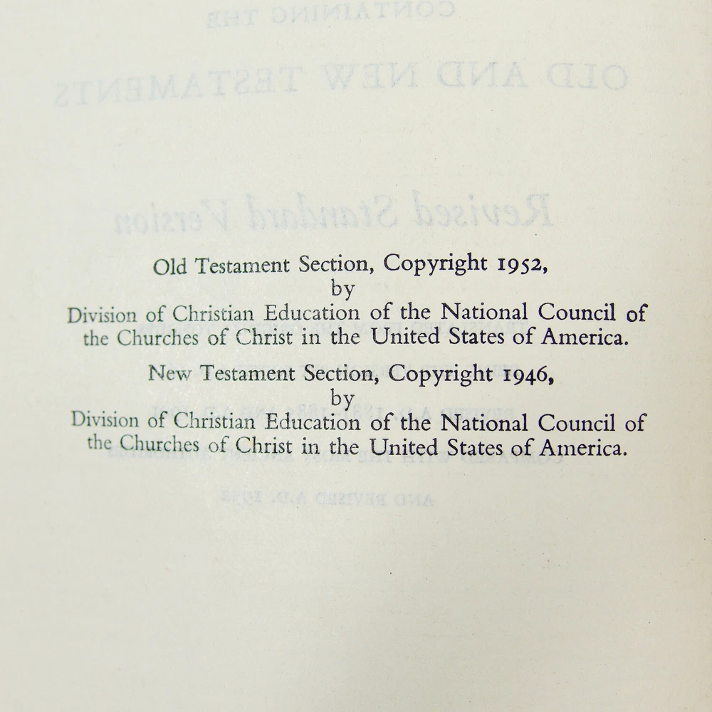 Holy Bible: Revised Standard Version (Vintage Book) Published in 1952 by Thomas Nelson & Sons. Manufactured in the USA. Cover measurements are roughly 7.6" tall, 5.4" wide, 1.4" thickness. English text. Plain black faux leather cover, no dust jacket. Contains a total of 981 numbered pages. Peppered throughout with full page color illustrations. Also contains a series of maps. The edges of the paper are a decorative faded red color. The content is printed in all-black text. Please note that this is NOT a red-letter edition. Makes for a great addition to any library or religious / Christian-themed book collection! Condition Notes: In very reasonable vintage shape, overall! Fairly minimal shelf wear due to age. The name of the previous owner is written on the first page. There are also a few pages with have been bent or creased in the upper corner. See pictures for close-ups. Otherwise clean and free of any handwriting, highlighting, sticker residue, water damages, or other obvious blunders.