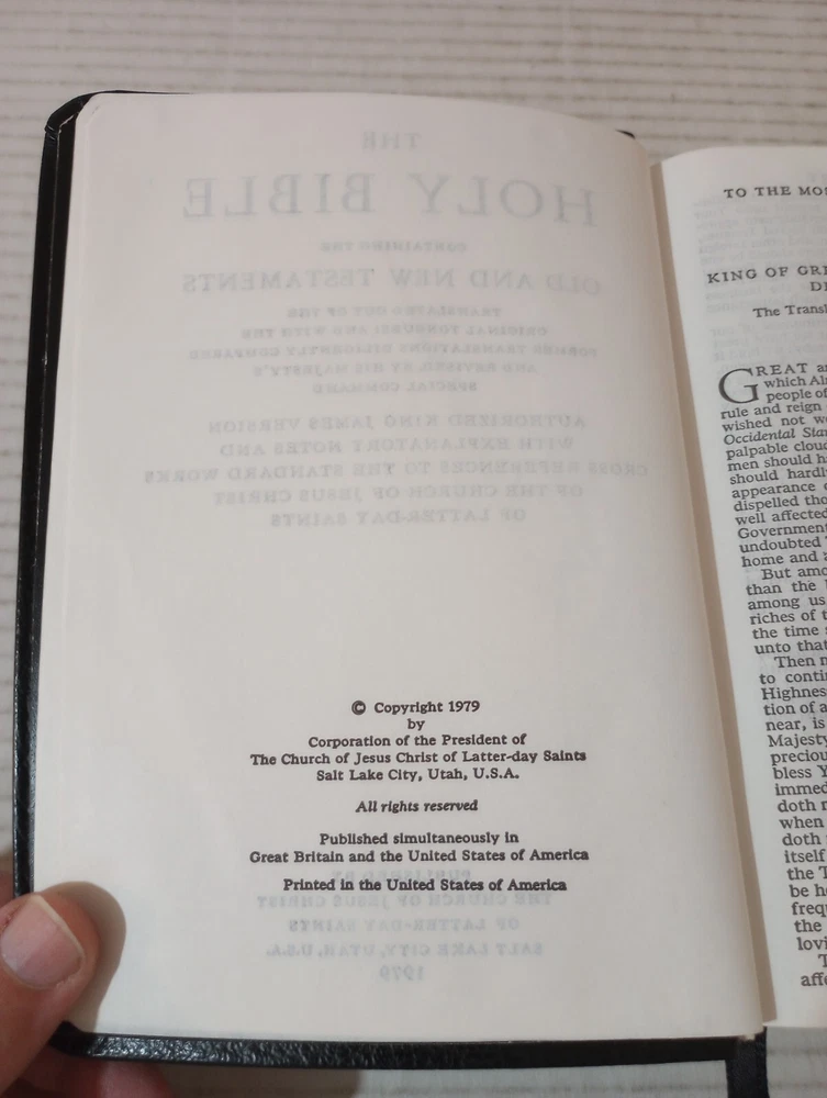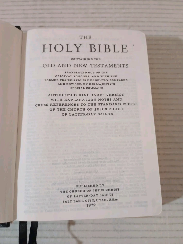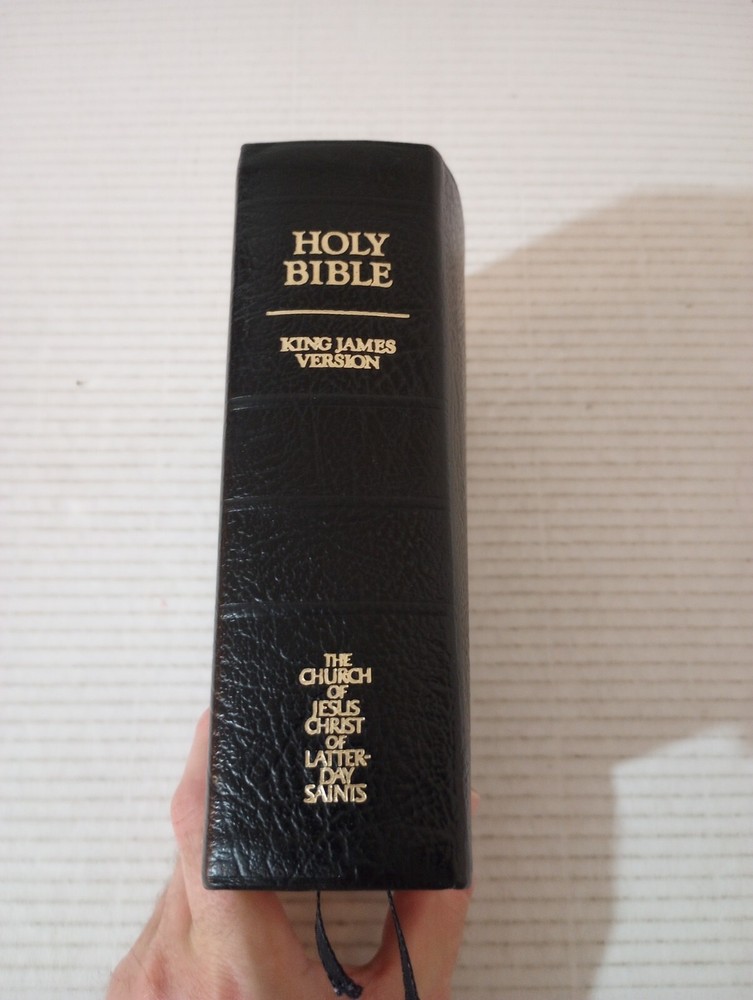 Holy Bible Standard Size Black Leather LDS Mormon KJV JST 1979. -Cover shows little wear. -Gilding on page edges is still mostly shiny. -Back of book bent. -No writing on pages. -No missing pages. -Please review all photos for details of condition and content. -Shipped with USPS Media Mail or Priority Mail. -Also available for local pickup. We welcome offers counter offers and negotiation. We do not work on Sundays. Thank you for your time.