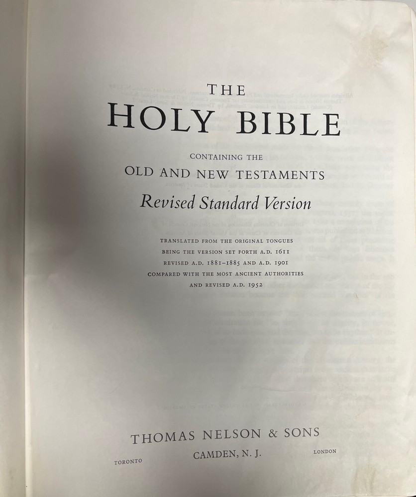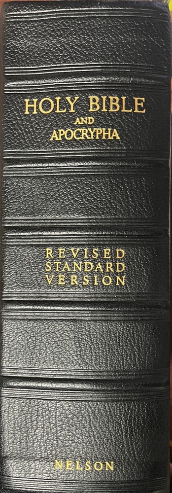 Beautiful unmarked family size bible. Genuine Morocco leather, ribbon markers, includes the Apocrypha. Previous owners name....