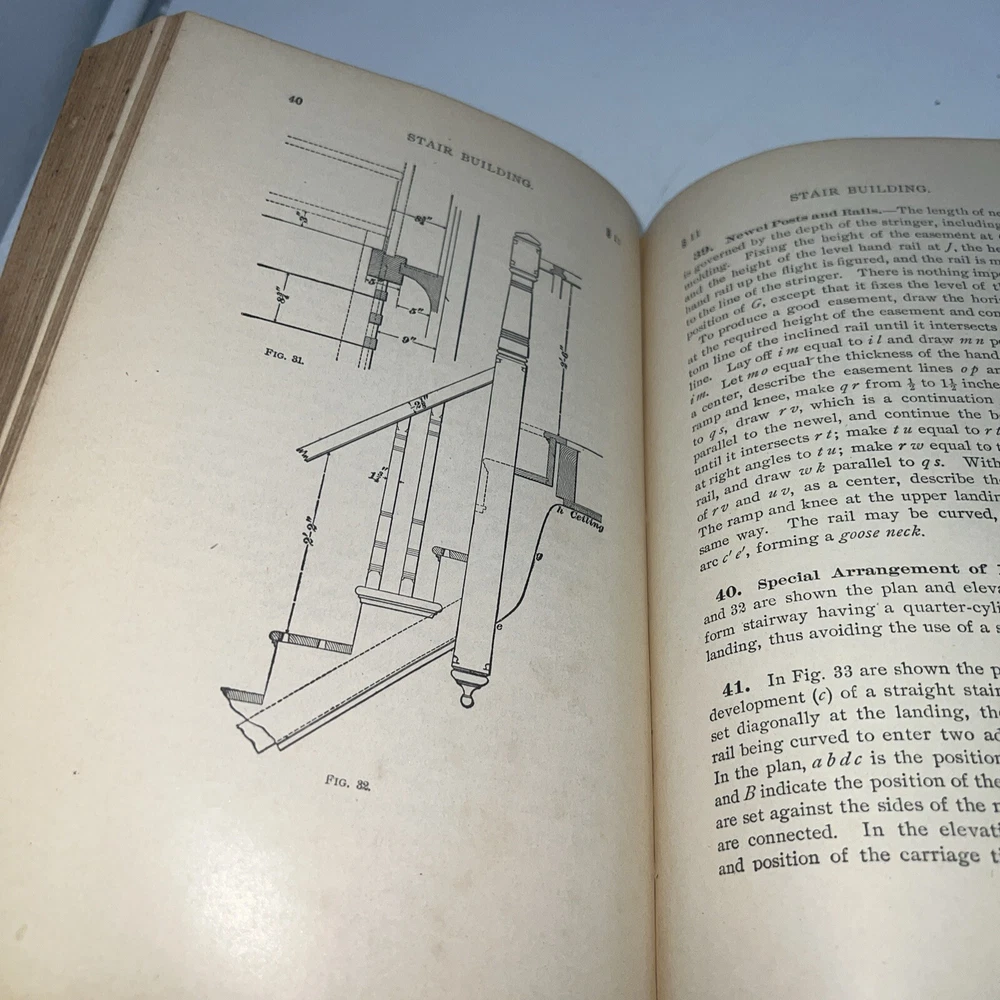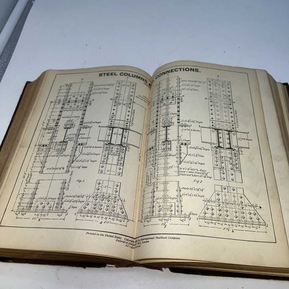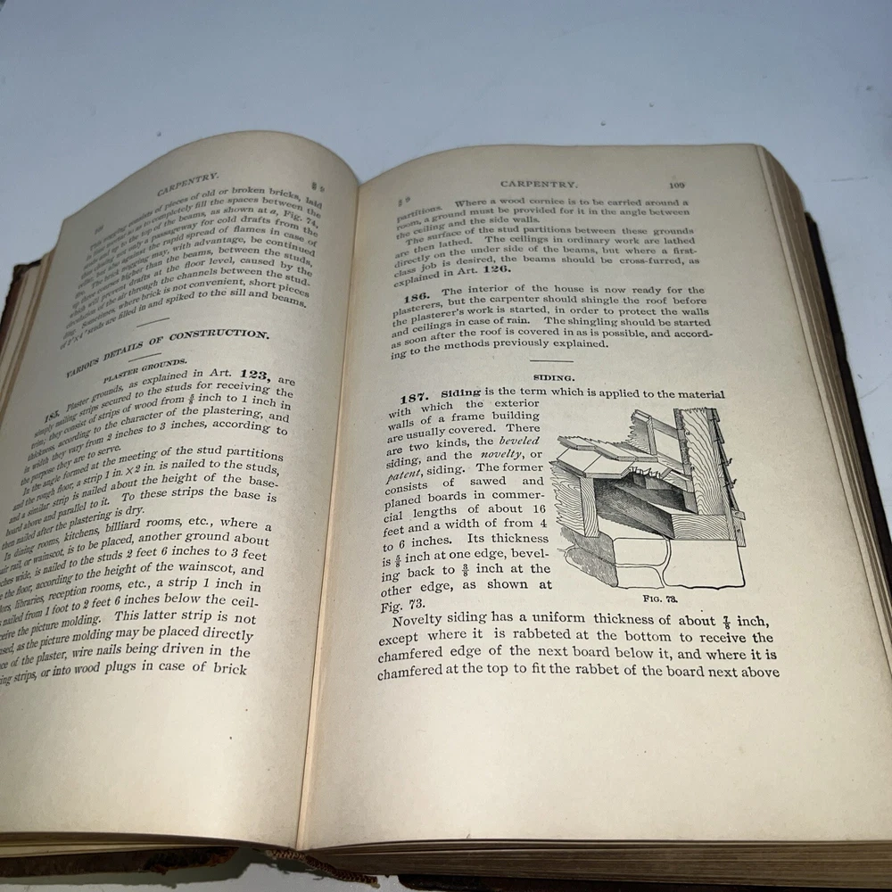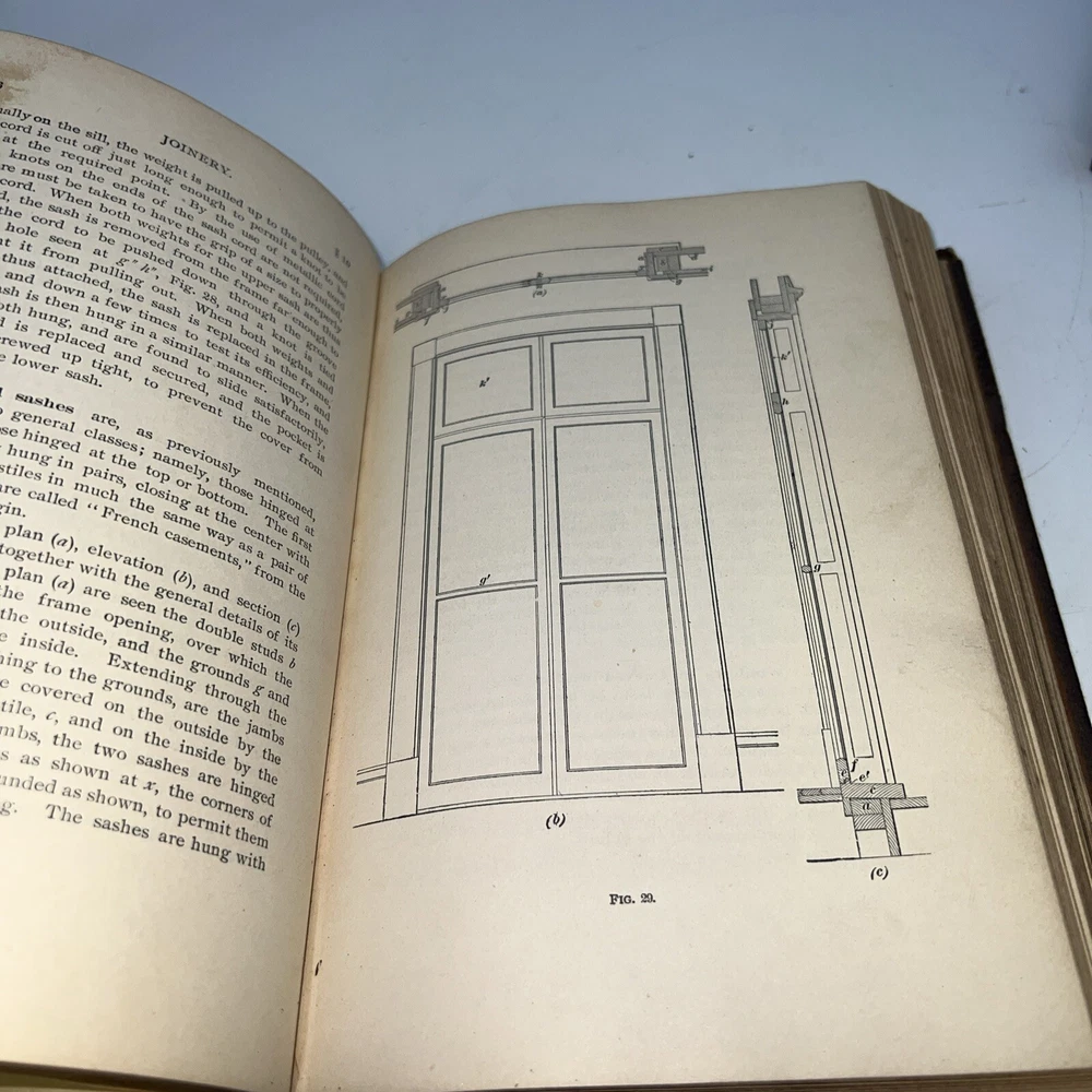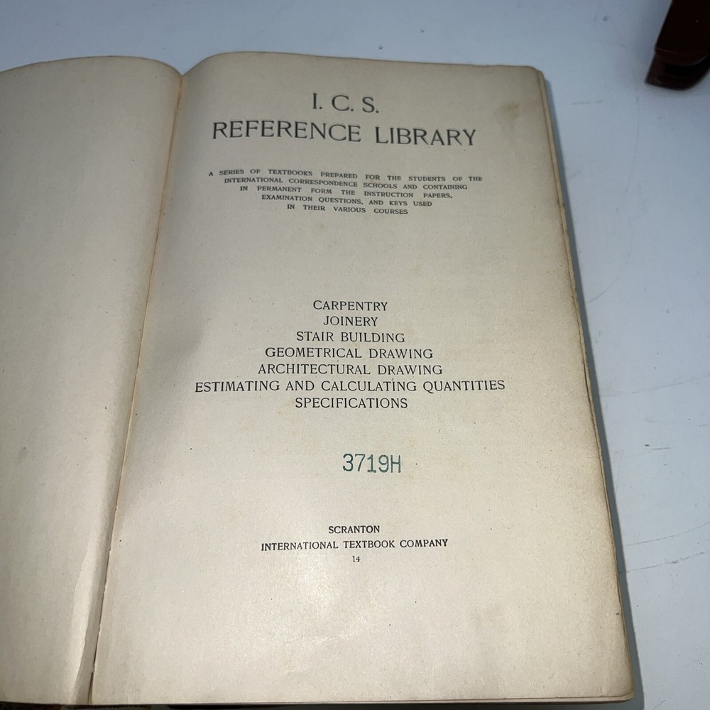 This is a vintage book titled "I. C. S. Reference Carpentry, Joinery, Stair Building, Drawing , 1904/USED". It was published by International Textbook Company in Scranton PA, United States, in the English language. The book covers various topics related to carpentry, drawing, and joinery, and is a great reference for collectors and enthusiasts. The binding of the book is made of leather, and it has the special attribute of being an ex-library copy. It was printed in 1904 and is an original edition, although it is unknown if it is a facsimile or not. The book is not personalized and is not signed by the author. It is a unique addition to any collection and is a rare find. Books cover is falling apart. Sold as is with all wear.