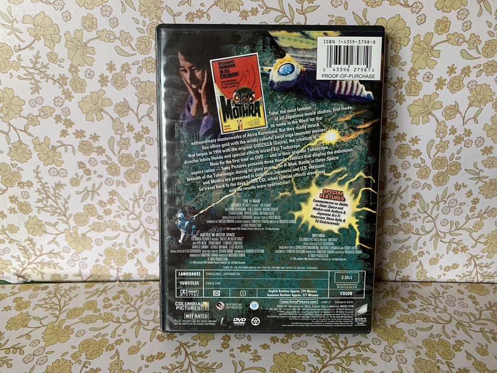 This DVD collection features three iconic science fiction movies from Toho Studio, the studio behind Godzilla, including thrilling sci/fi and horror elements. The movies are very hard to find and likely on available in DVD format. This collection is a must-have for any sci-fi fan, especially those who enjoy classic Japanese cinema. Each movie in the set offers a unique storyline and unforgettable characters that will keep you on the edge of your seat. Whether you're a fan of giant monsters or atmospheric horror, this collection has something for everyone. Add it to your movie collection today!