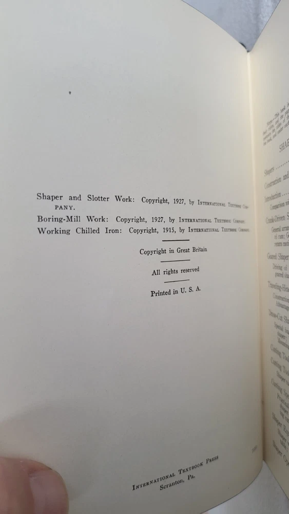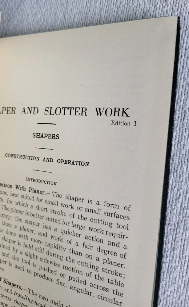 International Textbook Company Shaper, Slotter, And Boring-Mill Work 181B 1st Edition from 1927 This book is in fantastic condition. It has a "stiff spine" book has not been open all the way. Some minimal moisture splatter on the edges. Maybe in the factory? No writing on pages, no tears, creases or bends. Ships securely bubbled and boxed