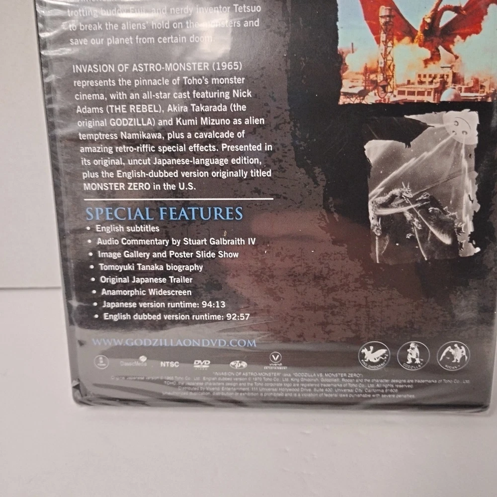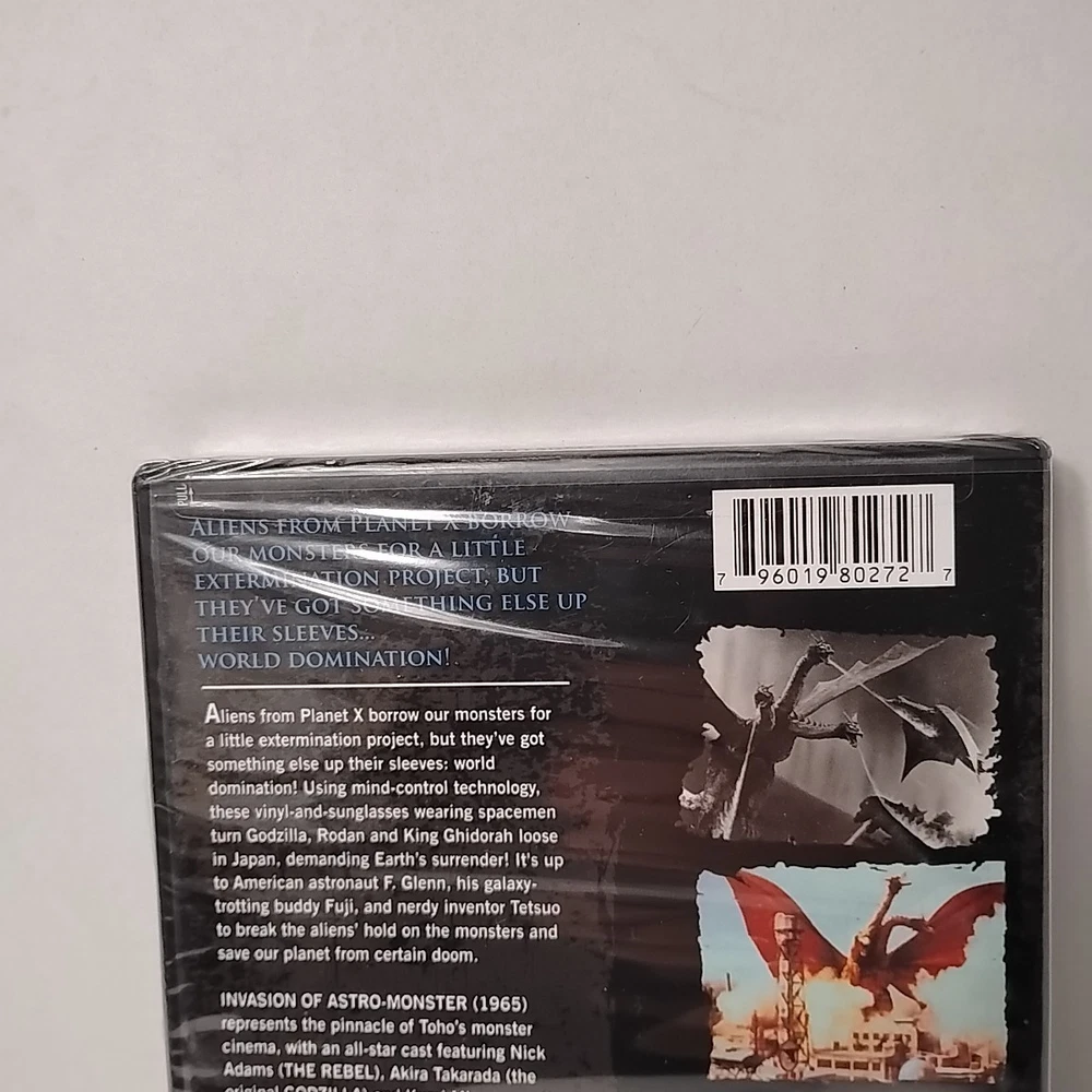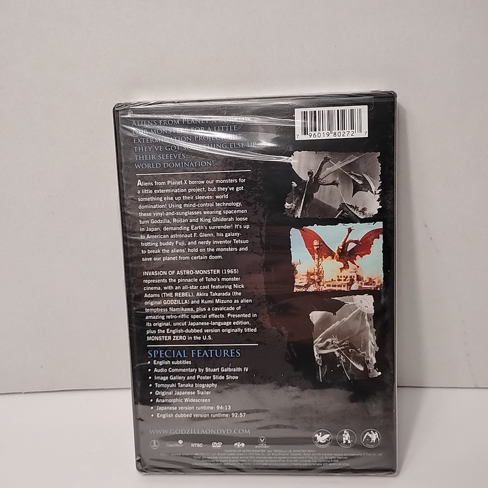 Please see photos for reference this is a brand new sealed DVD with a couple blemishes in the wrap bottom left hand corner has a slight tear and where the DVD snaps together there is a slight tear too see photos please for reference The "Invasion of Astro-Monster" DVD from 2007, produced by Toho, features the iconic Godzilla battling against the Monster Zero in the Kaiju genre. This special edition DVD has an aspect ratio of 16:9, presented in NTSC video format, and includes both English and Japanese language options. The Tall/DVD Case packaging makes it a collector's item for fans of the Godzilla franchise, offering a thrilling sci-fi and fantasy storyline in a region code 1 DVD compatible with US and Canada players.