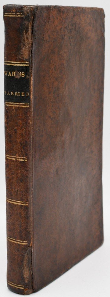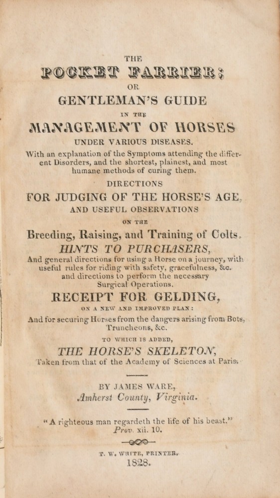 [HORSES] THE POCKET FARRIER. OR GENTLEMAN'S GUIDE IN THE MANAGEMENT OF HORSES UNDER VARIOUS DISEASES. WITH AN EXPLANATION OF THE SYMPTOMS ATTENDING THE DIFFERENT DISORDERS, AND THE SHORTEST, PLAINEST, AND MOST HUMANE METHODS OF CURING THEM. DIRECTIONS FOR THE JUDGING OF THE HORSE'S AGE, AND USEFUL OBSERVATIONS ON THE BREEDING, RAISING, AND TRAINING OF COLTS Author: James Ware Title: [HORSES] THE POCKET FARRIER. OR GENTLEMAN'S GUIDE IN THE MANAGEMENT OF HORSES UNDER VARIOUS DISEASES. WITH AN EXPLANATION OF THE SYMPTOMS ATTENDING THE DIFFERENT DISORDERS, AND THE SHORTEST, PLAINEST, AND MOST HUMANE METHODS OF CURING THEM. DIRECTIONS FOR THE JUDGING OF THE HORSE'S AGE, AND USEFUL OBSERVATIONS ON THE BREEDING, RAISING, AND TRAINING OF COLTS Publication: Richmond, VA: T. W. White, Printer, 1828 Edition: First Edition Description: Full Leather. Small octavo; in contemporary calf with a morocco label; frontispiece of a horse's skeleton; vi, [3], xiv-xvi, [1], 18-192, [1]; there is mild foxing throughout; three old cuts to the leather on the rear board, and with staining to the fore edge of the textblock; there is a discreet repair at the top of the front joint.~~A more than acceptable First Edition copy, contemporary with Richard Mason's popular New Gentleman's Farrier, with references to it made by Ware. With practical directions for purchasing, breeding, riding gracefully, surgically operating, and diagnosing and curing various maladies: from the insidious "Hungry Evil" to the cyclical "Moon Eyes". ~~A rather uncommon book, particularly in presentable condition. (Shoemaker 37083. ). Very Good binding. Seller ID: 297216 Subject: Nature & Outdoors Black Swan Books Richmond VA We specialize in antiquarian books, classic literature, the Civil War, Viriginiana, travel, art, children's books, and other subject areas, including religion and philosophy . Terms Payment via PayPal is preferred. All orders ship within two [2] business days, Monday through Friday by standard mail, USPS Media Mail. Combined orders and expedited shipping is available. Please contact us for a shipping quote before ordering. All items are guaranteed as listed and described. Any item may be returned within 30 days for any reason in the condition is which they were sent. This listing was created by Bibliopolis.