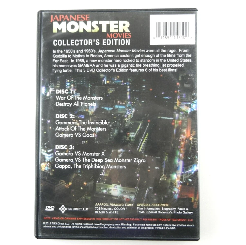 Japanese Monster Movies DVD Lot Ultraman 1:1,Godzilla, Gamera, Goos, Zigra T172E The discs are in great condition, without scratches. Outer portions of the cases show light dirt. The letter and number combination at the end of our title is for inventory purposes only. * I will gladly combine items to reduce shipping costs if more than one listing is purchased. If buying multiple items, PLEASE do not pay for the item until you have made all of your selections. Then, located at the top right corner of your cart page, you will find "Request Total". Click there to review your items again and submit the list. We will send an invoice at that time, combining all items into one package to reduce the shipping cost. See my other listings for more items selling at this time. All questions are welcome. Thank you!!! Powered by SixBit's eCommerce Solution