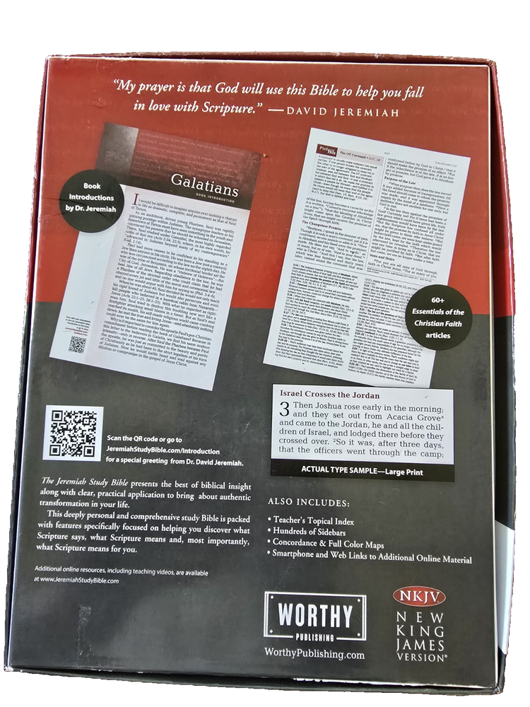 This NKJV Large Print Jeremiah Study Bible is a game-changer! The LeatherLuxe® cover feels premium, and the red-letter text makes Jesus' words stand out beautifully. Dr. Jeremiah's insights from decades of study are incredibly helpful—they break down complex passages into practical wisdom for daily life. The large print is easy on the eyes, and the study notes really help you understand Scripture's deeper meaning. Perfect for personal devotion or group study—highly recommend for anyone wanting to grow deeper in God's Word!