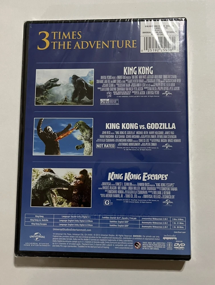 This KING KONG Triple Feature DVD set is a must-have for fans of the classic monster movie. Directed by Peter Jackson, the set includes three films: King Kong vs. Godzilla (1962 film), King Kong (2005 film), and King Kong: The Lost World (1997 film). Starring actors such as Andy Serkis, Jack Black, and Adrien Brody, this box set offers a thrilling and action-packed viewing experience. With a PG-13 rating and subtitles in English, French, and Spanish, this DVD set is perfect for those who love escape, creatures/monsters, Christmas, mystery, and supernatural genres. The tall/DVD case and widescreen format make it easy to store and watch, while the former rental and captioned features make it accessible for all audiences. Get your hands on this United States-made DVD set Up389