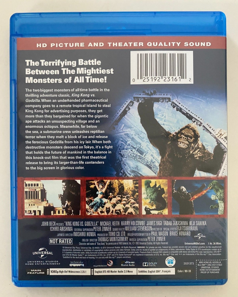 "KING KONG VS GODZILLA" 1963 fantasty sci-fi classic Blu Ray (the original!) Blu Ray viewed once, case & disc in excellent Like-New condition. Please note that most all my auctions include multiple shipping options (if eligible) but usually Priority is the default. Please ask prior to paying if you don't see the less expensive choice! Foreign Bidders please note that I currently ship to any countries that are included in the eBay Global Shipping Program. If your country is not listed there, then I cannot ship to you at the present time. PAYMENT is expected within 3 days of auction's end unless other arrangements are made. Sold as-is, no returns. Always happy to combine s&h for multiple wins. If winning more than one auction, please wait to pay invoice until I have updated the s&h. Any postage in excess of $1 will be refunded via Paypal immediately after item is boxed & weighed. Thank you for looking & Good Luck!