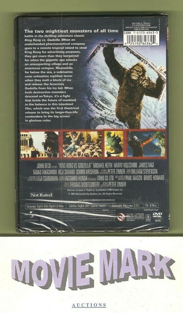 K-1799 - L(S)tblnxt2frzr 2 nd pile from L NOTE SHIPPING! THE FREE SHIPPING OFFER FOR THIS AUCTION IS FOR U. S. PARCEL POST -or- FIRST CLASS ONLY ( Depending on which is cheaper. ). EXPEDITED shipping is available. (see rates below) THIS RARE MOVIE IS NO LONGER AVAILABLE ON DVD! TADAO YAKASHIMA and KENJI SAHARA in ... " KING KONG VS. GODZILLA " NOT RATED FEATURING THE TWO MIGHTIEST MONSTERS OF ALL TIME! UNIVERSAL VIDEO (1963) Original DVD - RARE, OOP! (out-of-print) [ WIDESCREEN EDITION ] 1 DISC BRAND NEW! Sealed in original shrink-wrap NOTE* THIS IS ONE OF THE ONLY TRUE ORIGINAL DVD VIDEOS IN NTSC CURRENTLY UP FOR BID (from U.S. sellers with a picture of the NEW box) ON THE UNIVERSAL VIDEO LABEL ON AT THE TIME OF LISTING . NO STOCK PHOTOS HERE! *NOTE* NOT SURE IF THIS CONTAINS THE ORIGINAL CHAPTER SELECTION PAPERWORK PLUS BOOKLET WHICH CONTAINS CHAPTER SELECTIONS and POSTER ART ON THE INSIDE BECAUSE IT IS SEALED Very SCARCE! Grab it while you can! 1st original 2005 1ST ISSUED release. Not the recent 2009 re-issue. No copies, dupes or ILLEGAL bootlegs here, just the *REEL DEAL* ! WE ONLY SELL ORIGINAL VIDEOS WITH ORIGINAL BOXES. T h is is a BRAND NEW factory sealed video in MINT CONDITION! This video has NEVER been opened! All DVD videos are in excellent condition and play perfectly unless noted. Questions ? You may contact us through: eBay's message system ( contact member ) (If you are not in the U.S. or Canada please make sure that you will be able to play this NTSC movie. This is not compatible on PAL/SECAM systems. You will need a universal or multi-standard player system to accommodate NTSC videos.) No DVDs for auction are Asian Bootleg, Cheap Imports or VCDs! THIS DVD MOVIE WAS ONLY A LIMITED RELEASE BUT IS NOW ON MORATORIUM! MPAA RATING: NOT RATED Contains monster movie violence. In compliance with 's policy on any " or " videos ... ; NO pornographic or sexually explicit material is contained in this item. All subject matter may be bought and viewed by minors as in an (under 17 w/adult), , , , or rated movies. SPECIAL FEATURES: * Studio: Universal Video © 2005 (original plastic DVD keep-case) 1ST OFFICIAL RELEASE * Video Part #: 28436 * Features: Interactive Menu * Video Format (Aspect Ratio): Widescreen (2.35:1) [Black bars at the top and bottom of the screen are normal for this format.] * Running Time: 91 minutes * C o l o r * Soundtrack: Dolby Digital * Theatrical Release Date: 1963 * Language: English * Captioned Subtitles: English, Spanish, French * Region DVD: 1 - Compatible with all NTSC formats for US and Canada DVD players. ADDITIONAL RELEASE MATERIAL: * see back close-up scan for special features (if any) VIDEO BOX CONDITION: DVD case is in MINT unused condition. (see pic below and decide for yourself) Scan is of actual original box that you would receive. Moviemark never uses “stock photos.” The buyer will always see a picture of the actual original item for sale in our auctions! C AST: Tadao Yakashima .... Osamu Sakurai Kenji Sahara .... Kazuo Fujita Yu Fujiki .... Kinsaburo Furue Ichirō Arishima .... Mr. Tako Mie Hama .... Fumiko Sakurai DIRECTOR: Ishirô Honda (" Godzilla ", " Rodan ", " The War of the Gargantuas ") PLOTLINE: Get this RARE monster flick for your home video library! Tagline: The two mightiest monsters of all time! ...In the most colossal conflict the screen has ever known! A UN reporter broadcasts a report on the appearance of a prehistoric monster that emerges from hibernation while a pharmaceutical company seeks publicity with a monster of their own. In addition, check out my other RARE out-of-print hard-to-find DVD videos up for bid. TRIVIA: This film marks a number of firsts for King Kong and Godzilla films: this film was the first time either King Kong and Godzilla were filmed in color, and the first time either filmed in wide-screen. This film was also the third film for both King Kong and Godzilla (although this film isn't considered a sequel to the original King Kong or Son of Kong). Since this is long gone and out-of-print, grab it while you ca n! PAYMENT METHOD: Accepted Means of Payment PayPal - payment can ONLY be made from a confirmed address! (Sorry, that I am limited in payment methods but has changed the policy as of January 15, 2009.) New York State residents no longer have to pay sales tax. ( My advice if you're unhappy with this new payment option: is for you to contact directly if you have any complaints or concerns. I regret that I can't offer more for those of you who prefer other paying plans but has my hands tied. SHIPPING: NOW SHIPPING WORLDWIDE! PLEASE NOTE: NEW POSTAL RATE S ....*Special note*.... as of January 27 th , 2019 the USPS has raised the rates AGAIN ! This will be adjusted accordingly as time goes on. Therefore the following rates may not be correct. Winning bidder pays any of the following methods: US Shipping USA Media Mail Shipping: FREE - Will take 5-10 business days or possibly longer via USPS USA Priority Shipping: $9.90 for first item ($1.75 each additional from other auctions) - Will take 1-3 business days via USPS International Shipping INTERNATIONAL (AIR) United Kingdom, Europe, Australia & Pacific Rim : NO MORE INTERNATIONAL SHIPPING! REGISTERED Mail Shipping ( U.S.A. Only! ) (for those who win very expensive auctions & want the utmost secure way of shipping!) : $16.00 for first item ($1.75 each additional from other auctions) - Includes signed certified receipt INSURANCE: ( U.S.A. Only! ) is $2.00 extra (if your winning bid price is $50.00) *OR* $3.00 extra (if your winning bid price is $50.00 or more). Winner must specify if they want it at time of ordering. We will not be held responsible for uninsured items. IMPORTANT: All items must be paid for within 5 days of end of auction. If payment is NOT received within 5 days of auction ending, a Non-Paying Bidder alert process will begin. * Please don't be, what I call, a BIDIOT ! A "bidiot" is one who bids on an auction and does not pay. * Bids from 