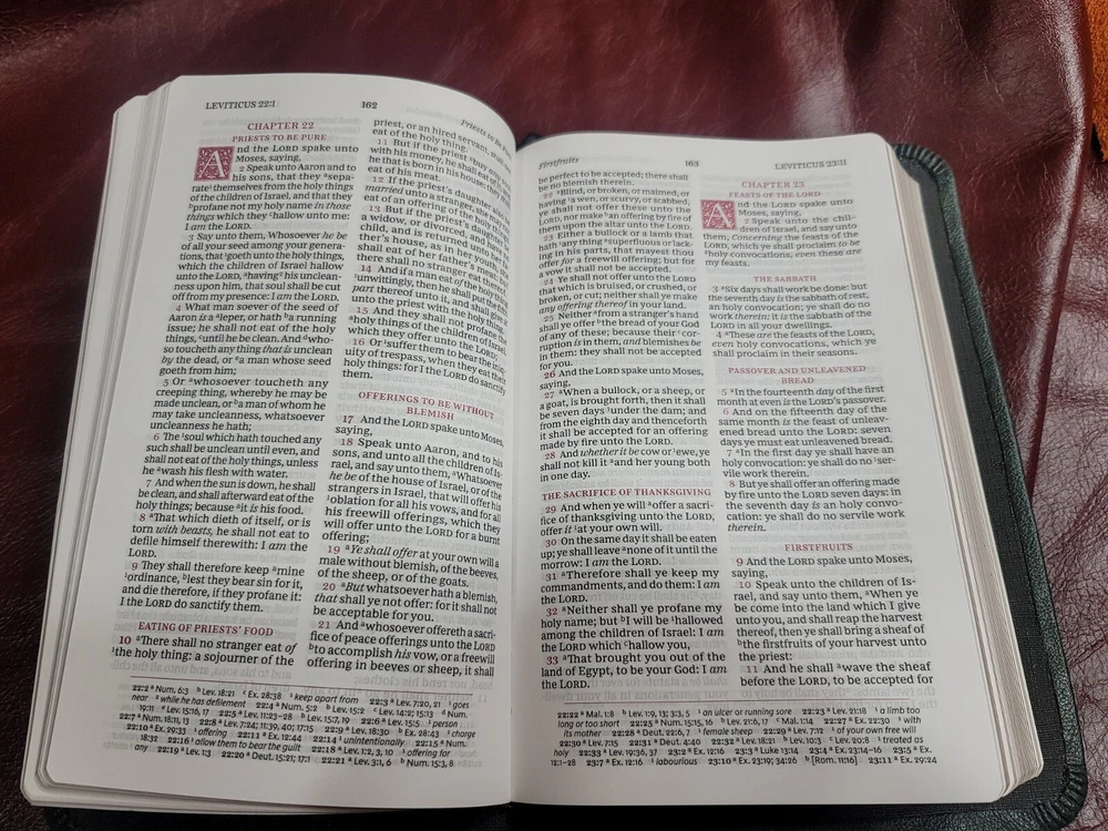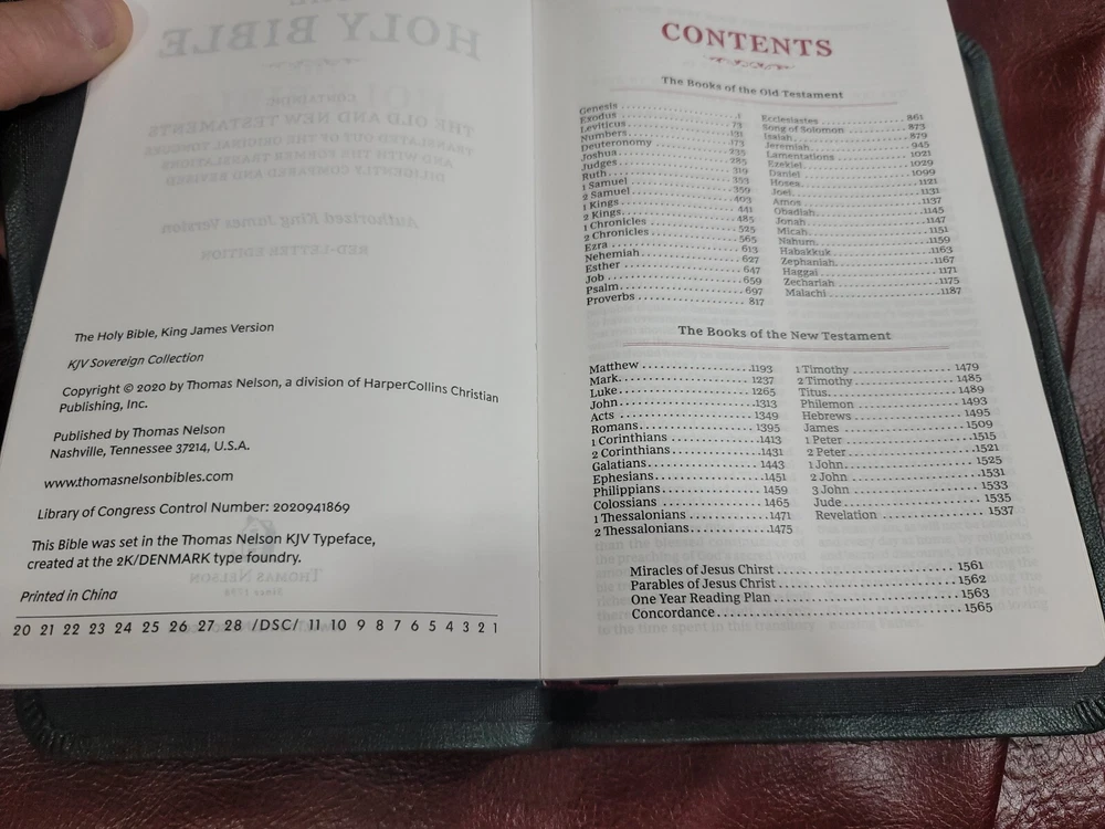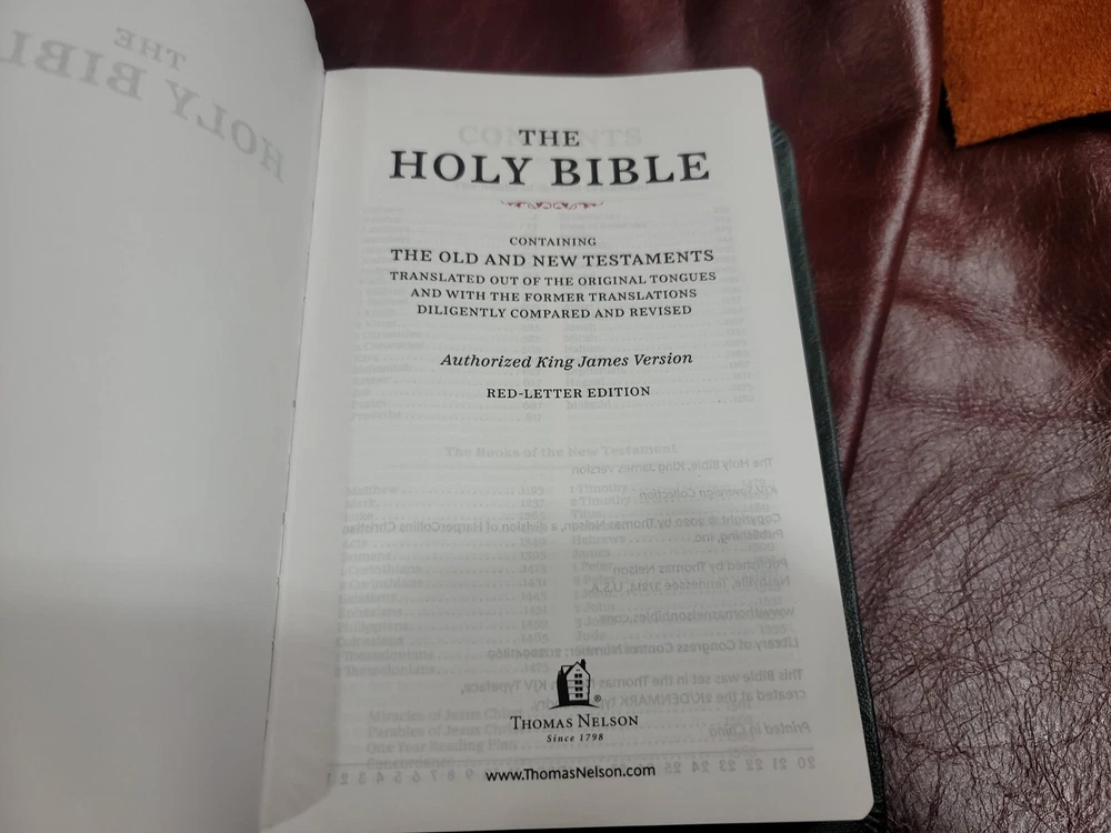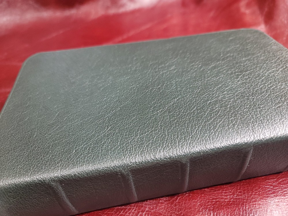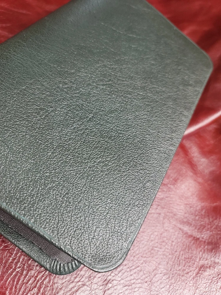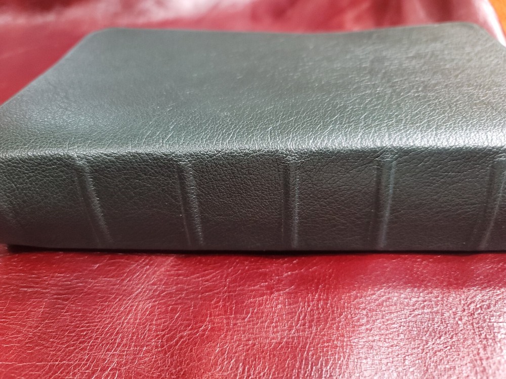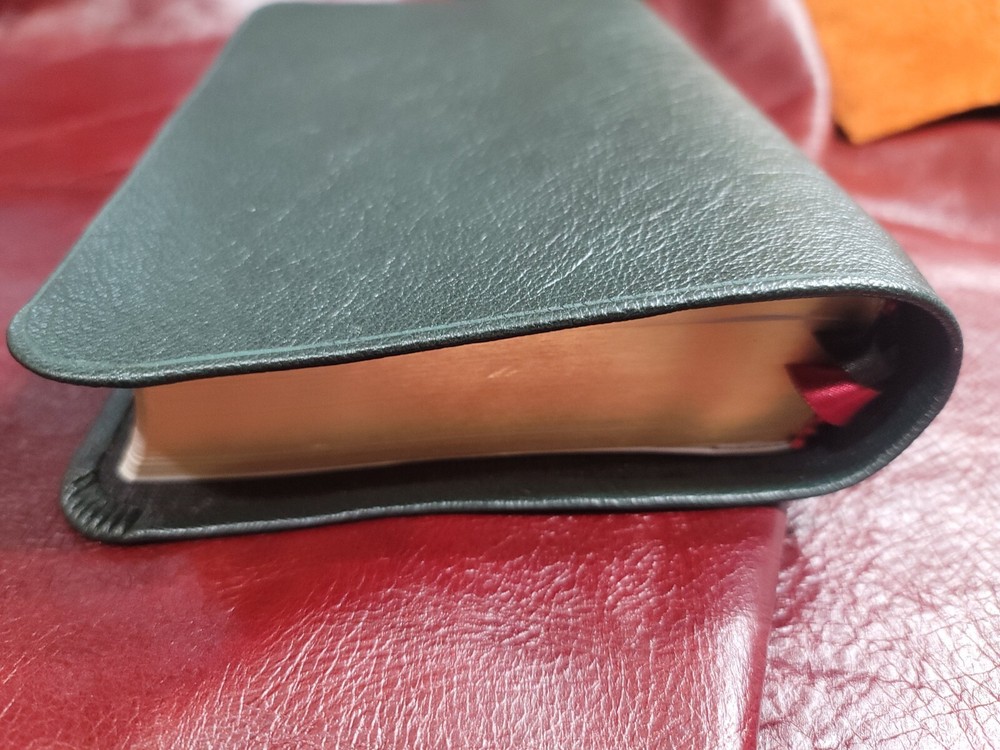 KJV Bible Sovereign Collection Personal Size Rebound Goatskin cover with Liner. Color: Olive Green. For your purchase consideration is this Sovereign Collection KJV Rebind Goatskin cover with liner. It is a semi- yapp. This is a red letter edition. Five raised ribs and two ribbons were added to this beautiful bible. The text block appears to be a copy cat of the Schuyler bible. Please look on ebay for Schuyler bible and compare the text block. This is not that stuff called bonded or genuine leather. This is not that compressed stuff most commercial bibles use as covers. This is the very Goatskin cut from the hide itself! As I state in all my listings I am not a professional in rebounding books. I have acquired the hobby and enjoy doing it. Once again, I am not a professional. Please look at all the photos for they too are part of the description. Please read all my feedbacks regarding all the bibles I have sold. Stay blessed and humble 🙏.