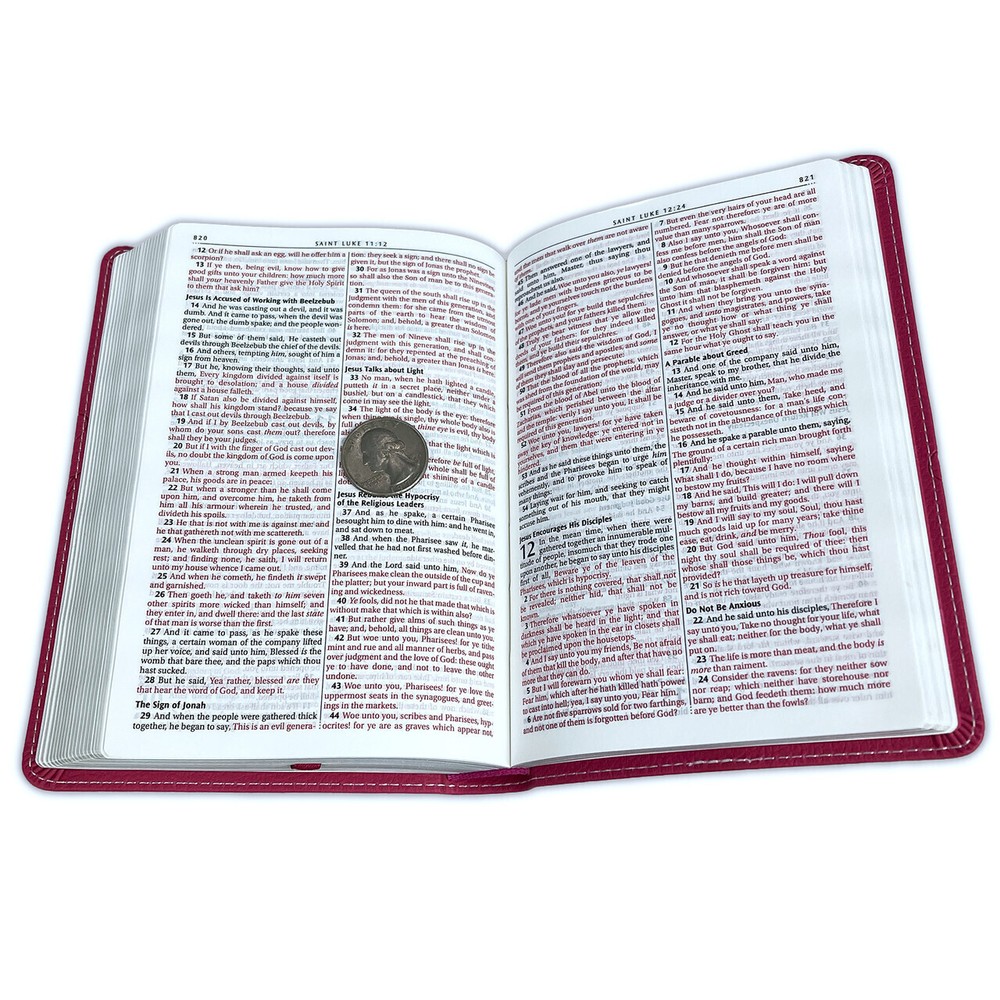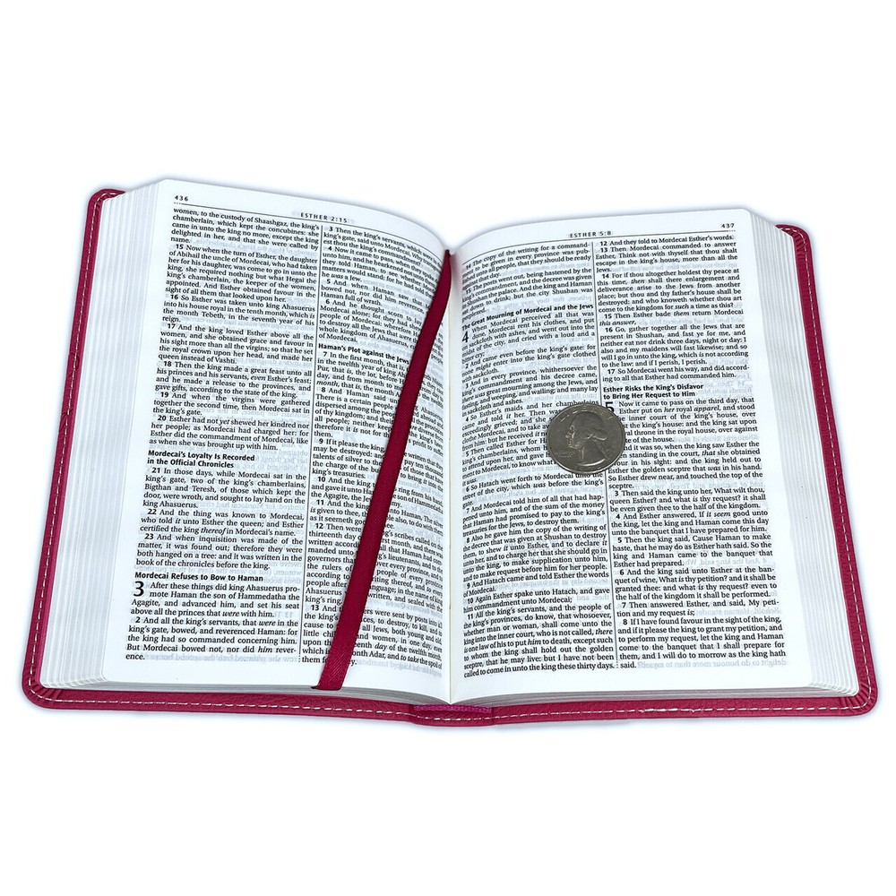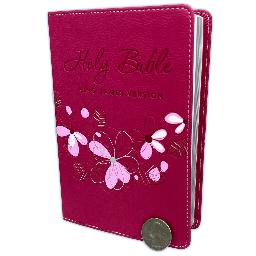 This compact KJV Bible is perfect for on-the-go reading! The pink faux leather cover is soft and stylish, while the easy-to-read text makes it a great daily companion. Lightweight yet durable, it fits nicely in a purse or bag. The classic King James Version is beautifully presented, making it a thoughtful gift for any occasion. Love the elegant design and sturdy binding—highly recommend!