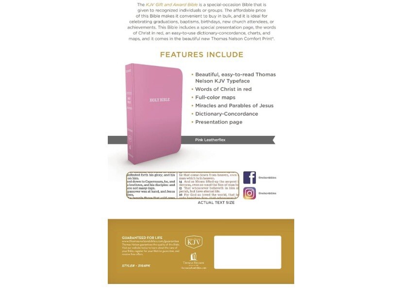 KJV Holy Bible: Gift and Award, Pink Leather Presentation page allows you to personalize this special gift by recording a memory or note Words of Christ in red quickly identify verses spoken by Jesus Dictionary and Concordance for looking up a word’s definition and occurrences throughout the Bible 30 days with Jesus reading plan provides an easy guide to begin reading the Bible by using brief passages from Jesus’ life Prayers of the Bible of nearly 100 prayers in the Bible, who prayed them, and what they prayed about Prophecies of the Messiah understand how the old and new testaments connect with a clear display of how Christ fulfilled numerous prophecies Miracles and parables of Jesus call out important events during Jesus’ earthly ministry Full color maps show a visual representation of Israel and other biblical locations for better context Clear and readable 8-point KJV Comfort Print