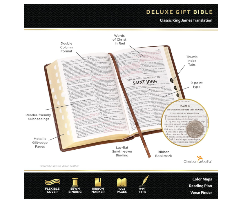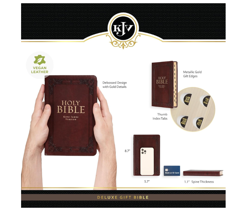 KJV Holy Bible, Standard Size Faux Leather Red Letter Edition Thumb Index & Ribb Description: Heat Debossed Double Frame Design Gold Foiled Title Faux Leather Flexcover Classic King James Version Gilt-Edged Pages Lay-Flat Spine Attached Ribbon Page Marker Reader-friendly Subheadings Thumb-index Words of Christ in Red Ink Double-column Format Thematic Scripture Verse Finder One-Year Bible Reading Plan 8 full-color maps RETURNS You can return a product for up to 30 days from the date you purchased it. Any product you return must be in the same condition you received it and in the original packaging. Please keep the receipt. SHIPPING We offer FREE shipping on all orders! We ship within 2 To 5 days of payment. Furthermore, we use a selection of shipping services such as UPS,USPS, FedEx, USPS, etc. PAYMENTS Customer satisfaction is vital to us. If you have any problem with your order, please get in touch with us, and we will do our best to make you satisfied.