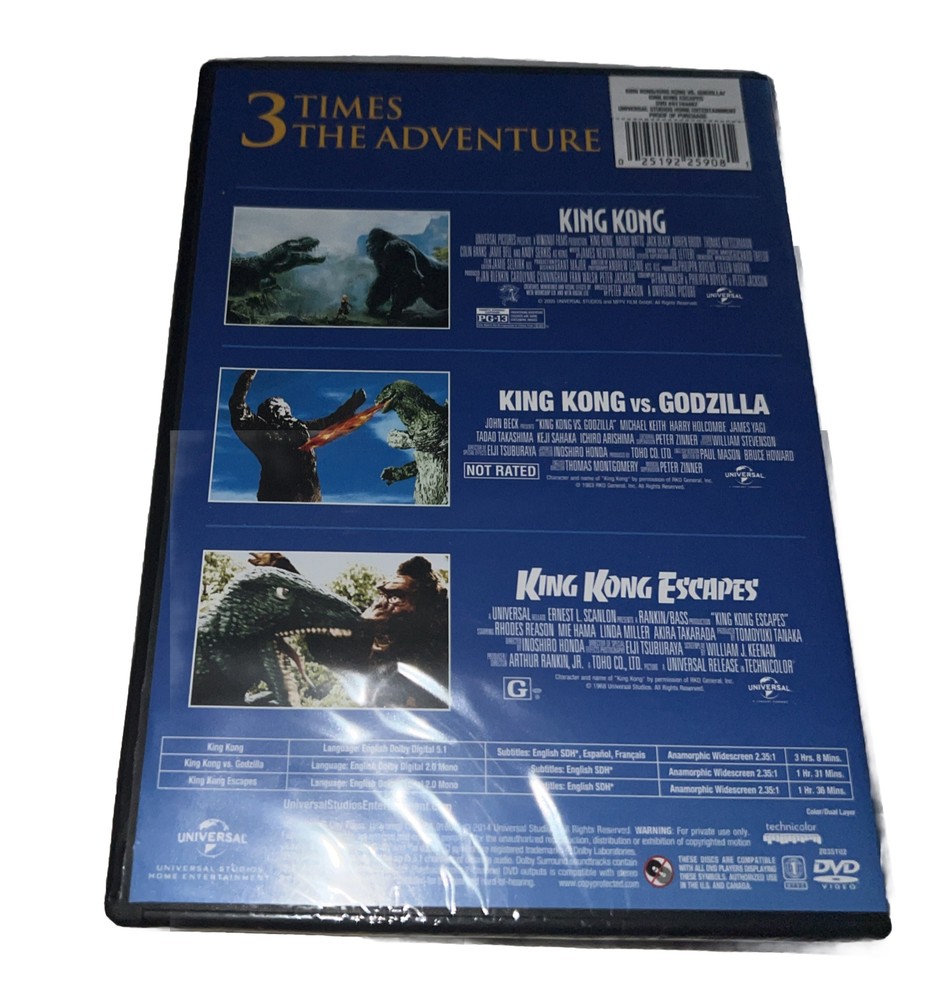 Immerse yourself in the riveting world of King Kong with this incredible box set, featuring the 2005 epic film and two classic titles from 1962 and 1967. Witness the awe-inspiring battle between King Kong and Godzilla, and follow the giant ape's thrilling escape from captivity. This DVD collection boasts an impressive array of features, including widescreen format and English, French, and Spanish subtitles, making it the perfect addition to any movie enthusiast's collection. As you journey into the fantastical world of King Kong, you'll be drawn into a compelling storyline that combines drama, adventure, horror, and sci-fi and fantasy. With an all-star cast, including Andy Serkis, Jack Black, and Adrien Brody, and directed by Peter Jackson, this collection is sure to enthrall viewers of all ages. Don't miss out on the ultimate cinematic experience with King Kong and his monstrous foes.