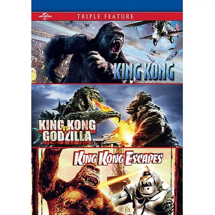 New DVD Triple Feature on 2 Discs King Kong (2005) Peter Jackson's expansive remake of the 1933 classic follows director Carl Denham (Jack Black) and his crew on a journey from New York City to the ominous Skull Island to film a new movie. Accompanying him are playwright Jack Driscoll (Adrien Brody) and actress Ann Darrow (Naomi Watts), who is whisked away by the monstrous ape, Kong, after they reach the island. The crew encounters dinosaurs and other creatures as they race to rescue Ann, while the actress forms a bond with her simian captor. King Kong vs Godzilla (1963) King Kong and Godzilla go head-to-head in an epic battle of the beast when the giant gorilla escapes from captivity in Japan and squares up to the recently thawed lizard. King Kong Escapes (1968) Dr Who decides to capture the real King Kong when it becomes clear that his mechanical copy is not capable of digging for the precious mineral he needs, but the giant Gorilla escapes and heads to Tokyo. Language : English Media Format : Full Screen, Widescreen Run time : 375 minutes Subtitles: : English Studio : Universal Number of discs : 2
