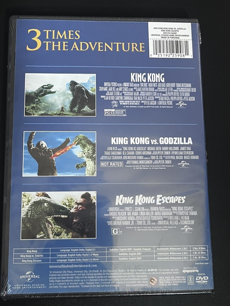 Experience the ultimate adventure with this King Kong DVD triple feature. Featuring the classic films King Kong, King Kong vs Godzilla, and King Kong Escapes, this set is a must-have for any movie lover's collection. Immerse yourself in the world of sci-fi and fantasy with this widescreen edition, complete with stunning visuals and thrilling action.
