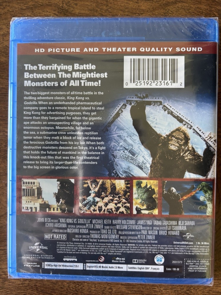 Experience the epic battle of the century with "King Kong VS. Godzilla" on Blu-ray. Released in 1962, this thrilling classic from Universal Studios brings you two of the most iconic monsters of all time clashing in spectacular fashion. Directed by Ishiro Honda and Thomas Montgomery, and produced by John Beck and Tomoyuki Tanaka, this action-packed adventure will take you on a journey that's as thrilling as it is nostalgic. Immerse yourself in the high-definition clarity of this Blu-ray edition, which includes a NR-rated experience that's perfect for fans of science fiction and monster movies. The gripping narrative and dynamic direction make this film a must-have for your collection, ensuring that you get to enjoy the timeless tale of King Kong and Godzilla in the comfort of your own home. **Vicki’s Variety Store WIILL COMBINE SHIPPING TO SAVE YOU MONEY IN SHIPPING!!! You can combine shipping by placing more than one item from my store in your cart and then click on "Request Combined Shipping" and I'll send you an invoice with your shipping savings. Or if you have already purchased more than one item from my store before I have shipped them out, I will combine your items into one package and refund to you the extra shipping costs that are not needed. Note that media (films, dvds, blu-rays, books) ship at a reduced rate from the USPS so combining shipping saves you much money. Message me with questions*!