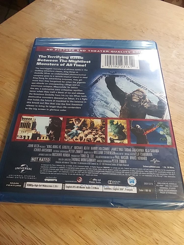 The product is a Blu-ray edition of the 1962 film "King Kong Vs. Godzilla," produced by John Beck and Tomoyuki Tanaka. Directed by Ishiro Honda and Thomas Montgomery, the action and adventure movie falls under the science fiction sub-genre and is rated NR. Released by Universal Studios, this new and sealed Blu-ray offers fans of the classic monster movies a high-quality viewing experience of this iconic battle between two legendary creatures.
