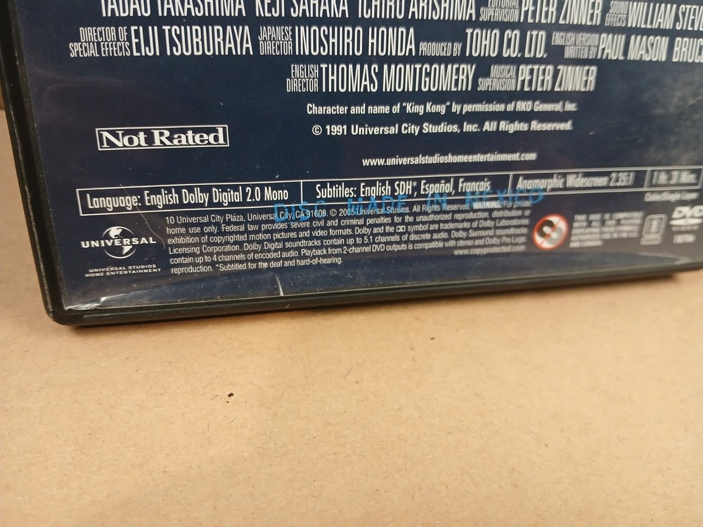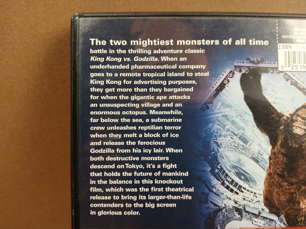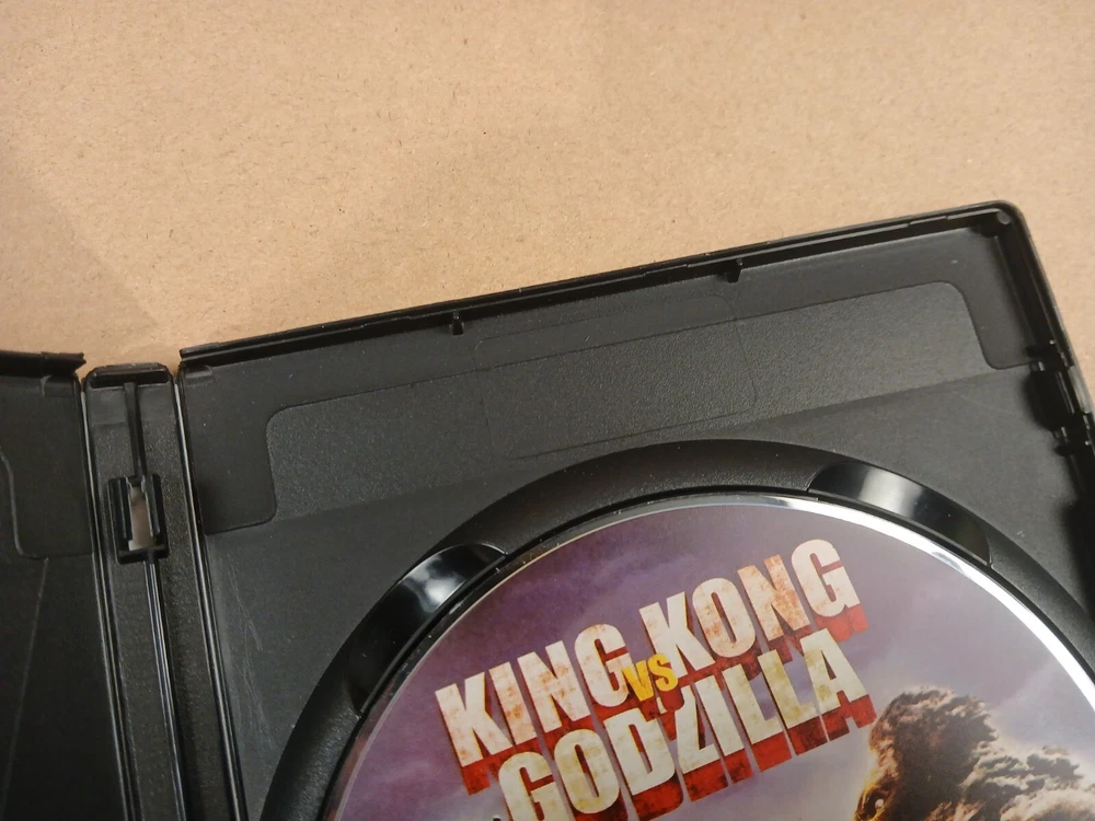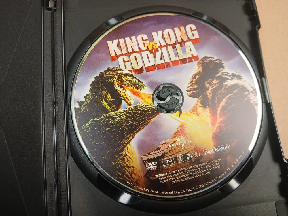 this is a used preowned dvd movie copy of king kong vs. godzilla.first off i watched this movie myself and it played good.it is an english dubbed movie.anyway there is wear on the case of this movie.there are some scuffs,scratches,nicks and dings throughout all sides of the case.the outside plastic covering has some damage along the bottom of both sides of the case including chipping and a large upraised crease.there is also a crease in the outside paper insert on the front of the case on the top right hand corner area.the inside of the case has some spotting,scuffs,scratches and a few dust particles.there is a spot where a magnetic sticker was removed.the play side of the disc looks pretty decent.there is a few very light slight scratches and some dust particles.thank you for looking at this listing.