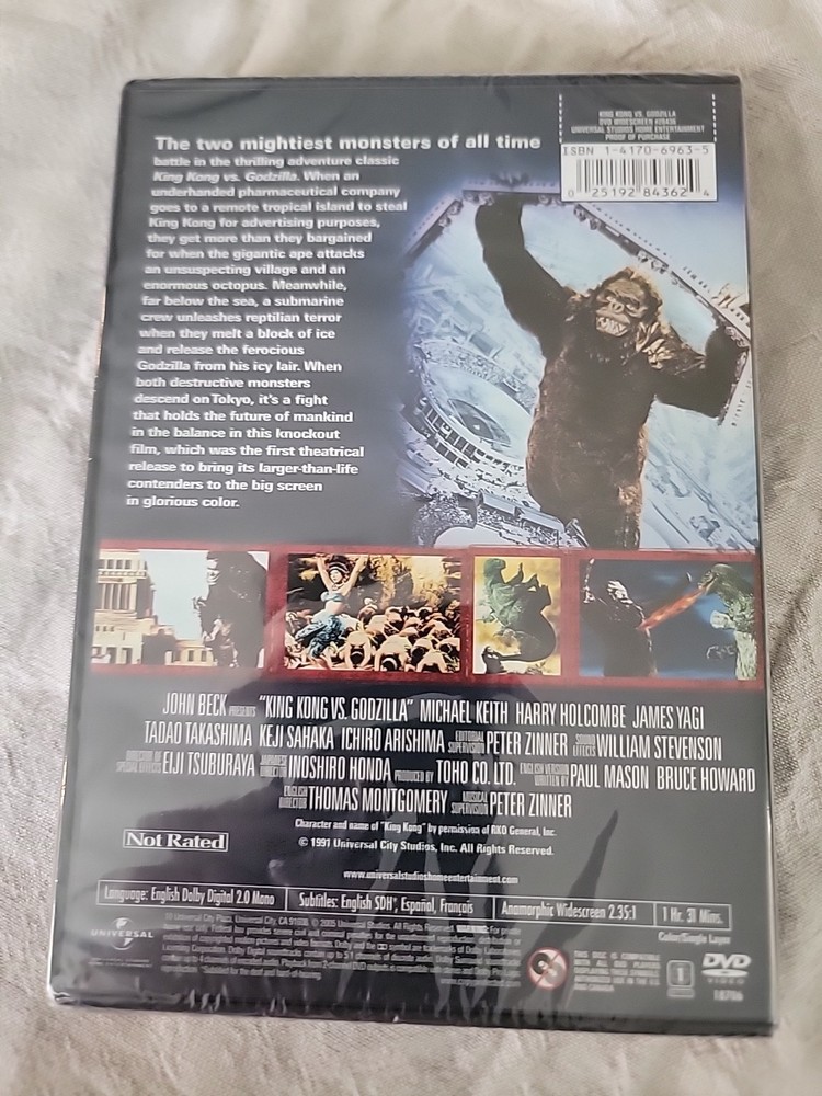 "King Kong Vs. Godzilla" is a 1962 action and adventure film on DVD. Produced by John Beck and Tomoyuki Tanaka, directed by Ishiro Honda and Thomas Montgomery, with a run time of 91 minutes. The DVD includes English, French, and Spanish subtitles. This brand new, sealed DVD is a 2005 release from Universal Studios.